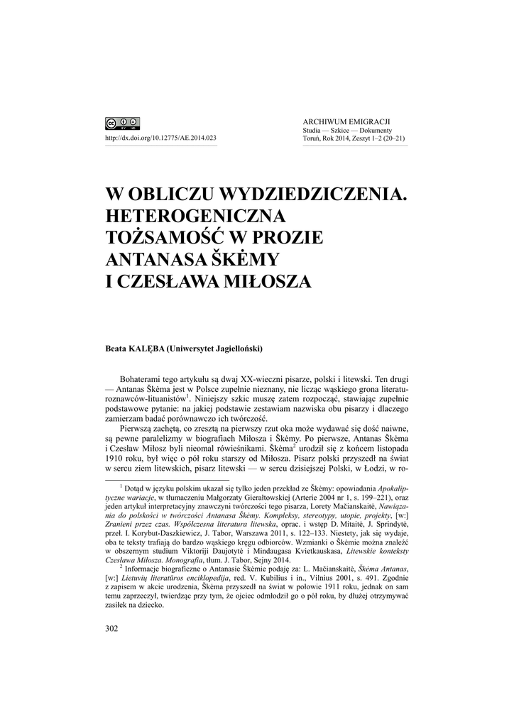 ARCHIWUM EMIGRACJI http://dx.doi.org/10.12775/AE.2014.023 Studia — Szkice — Dokumenty Toruń, Rok 2014, Zeszyt 1–2 (20–21) _________________________________________________________________ _____________________________________________________________ W OBLICZU WYDZIEDZICZENIA. HETEROGENICZNA TOŻSAMOŚĆ W PROZIE ANTANASA ŠKĖMY I CZESŁAWA MIŁOSZA Beata KALĘBA (Uniwersytet Jagielloński) Bohaterami tego artykułu są dwaj XX-wieczni pisarze, polski i litewski. Ten drugi — Antanas Škėma jest w Polsce zupełnie nieznany, nie licząc wąskiego grona literaturoznawców-lituanistów1. Niniejszy szkic muszę zatem rozpocząć, stawiając zupełnie podstawowe pytanie: na jakiej podstawie zestawiam nazwiska obu pisarzy i dlaczego zamierzam badać porównawczo ich twórczość. Pierwszą zachętą, co zresztą na pierwszy rzut oka może wydawać się dość naiwne, są pewne paralelizmy w biografiach Miłosza i Škėmy. Po pierwsze, Antanas Škėma i Czesław Miłosz byli nieomal rówieśnikami. Škėma2 urodził się z końcem listopada 1910 roku, był więc o pół roku starszy od Miłosza. Pisarz polski przyszedł na świat w sercu ziem litewskich, pisarz litewski — w sercu dzisiejszej Polski, w Łodzi, w ro1 Dotąd w języku polskim ukazał się tylko jeden przekład ze Škėmy: opowiadania Apokaliptyczne wariacje, w tłumaczeniu Małgorzaty Gierałtowskiej (Arterie 2004 nr 1, s. 199–221), oraz jeden artykuł interpretacyjny znawczyni twórczości tego pisarza, Lorety Mačianskaitė, Nawiązania do polskości w twórczości Antanasa Škėmy. Kompleksy, stereotypy, utopie, projekty, [w:] Zranieni przez czas. Współczesna literatura litewska, oprac. i wstęp D. Mitaitė, J. Sprindytė, przeł. I. Korybut-Daszkiewicz, J. Tabor, Warszawa 2011, s. 122–133. Niestety, jak się wydaje, oba te teksty trafiają do bardzo wąskiego kręgu odbiorców. Wzmianki o Škėmie można znaleźć w obszernym studium Viktoriji Daujotytė i Mindaugasa Kvietkauskasa, Litewskie konteksty Czesława Miłosza. Monografia, tłum. J. Tabor, Sejny 2014. 2 Informacje biograficzne o Antanasie Škėmie podaję za: L. Mačianskaitė, Škėma Antanas, [w:] Lietuvių literatūros enciklopedija, red. V. Kubilius i in., Vilnius 2001, s. 491. Zgodnie z zapisem w akcie urodzenia, Škėma przyszedł na świat w połowie 1911 roku, jednak on sam temu zaprzeczył, twierdząc przy tym, że ojciec odmłodził go o pół roku, by dłużej otrzymywać zasiłek na dziecko. 302 dzinie inteligenckiej (jego matka była Polką, ojciec Litwinem, nauczycielem oddelegowanym do pracy w Łodzi). Pierwsze lata życia obaj spędzili na tułaczce: Miłosz, jak wiadomo, po Rosji, Škėma — również po Rosji, w tym po ziemiach dzisiejszej Ukrainy, gdzie miała go zastać rewolucja bolszewicka. W latach 20., gdy mały Cześ osiadł w (administracyjnie) polskim Wilnie, mały Antanukas zamieszkał w Kownie. Antanas Škėma kształcił się w kierunku aktorstwa i reżyserii, grał najpierw w Kownie, następnie, od końca 1939 roku, w Litewskim Teatrze Narodowym w Wilnie. I właśnie wtedy, na początku 1940 roku, za „litewskiego Wilna”, Miłosz i Škėma mogli się mijać na ulicach tego miasta. W 1941 roku Škėma był uczestnikiem partyzantki antysowieckiej3, w 1944 — wyjechał z sowieckiej Litwy. Droga litewskiego pisarza na emigrację, typowa dla przedstawicieli litewskiej inteligencji tamtej epoki, wiodła przez obozy dla dipisów w Niemczech, była więc inna niż w przypadku Czesława Miłosza. Koniec końców jednak obaj osiedli w USA jako emigranci polityczni. Również amerykańskie doświadczenie Škėmy było inne niż polskiego pisarza — profesora uniwersyteckiego: pracował głównie jako windziarz w jednym z hoteli w Nowym Jorku, był przy tym bardzo aktywnym organizatorem litewskiego życia teatralnego w USA. Zmarł przedwcześnie, w 1961 roku, na skutek wypadku samochodowego. Czy zapoznał się z Czesławem Miłoszem w Stanach? — nie wiem, przypuszczalnie nie, ponieważ, jak się zdaje, do pierwszego osobistego spotkania Miłosza z przedstawicielami kręgu litewskich pisarzy emigracyjnych, któremu był bliski Škėma, doszło w 1964 roku4. Antanas Škėma był aktorem i reżyserem, pisał dramaty i opowiadania, jednak jego najbardziej znanym utworem jest powieść z lat 50. Balta drobulė (Biały całun)5, która w środowisku emigracyjnym została przyjęta z rezerwą (a to dlatego, że łamała różne tabu, m.in. estetyczne, obyczajowe i narodowościowe), zaś współcześnie uważa się ją za pierwszą i zarazem być może najwybitniejszą litewską powieść modernistyczną, która wydobyła litewską prozę z „zaścianka” realizmu. Moim celem nie jest próba lektury wpływologicznej6. Nie ma zresztą dla niej podstaw — Czesław Miłosz był wprawdzie znany w środowisku litewskiej emigracji — dość przywołać jego litewski tom pod znaczącym tytułem Poezja świadomości epoki (Epochos sąmoningumo poezija) z 1955 roku, opracowany przez bliskich znajomych Antanasa Škėmy, oraz fakt, iż przed wydaniem tej książki przekłady z Miłosza publikował także emigracyjny magazyn literacki „Literatūros Lankai”, jednak choćby ze względu na daty powstania interesujących mnie tu utworów nie może być mowy o żadnej „wpływologiiˮ bądź recepcji. Powieść Biały całun Škėma pisał w latach 3 Chodzi o zorganizowane, uzbrojone grupy cywilów, tzw. baltaraiščiai (nazwa od białych opasek noszonych na ramieniu), którzy — współpracując z nazistami — próbowali wzniecić antysowieckie powstanie; swoimi działaniami objęli głównie Kowno, ich ofiarami byli bolszewicy, litewscy komuniści i Żydzi; zob. np.: P. Łossowski, Litwa, Warszawa 2001, s. 167–170. 4 Zob. informację w dzienniku Alfonsasa Nyki-Niliūnasa, poety litewskiego, jednego z najważniejszych przedstawicieli kręgu pisarzy emigracyjnych žemininkai (żemininków, „poetów ziemi”), któremu bliski był t