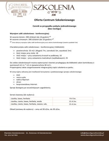 Oferta Centrum Szkoleniowego S Cennik w przypadku pobytu jednodniowego (bez noclegu) Wynajem salki szkoleniowo - konferencyjnej: W sezonie letnim: 290 zł/dzień (do 10 godzin) *1 W sezonie zimowym: 390 zł/dzień (do 10 godzin) *1 *1 Cena dotyczy wynajmu tylko salki konferencyjnej oraz salonu salon kominkowego (zawiera podatek Vat) Charakterystyka salki szkoleniowo – konferencyjnej ( biblioteki): • • • • powierzchnia: owierzchnia: 35 m2 ( długość długo 7m, szerokość 5m, wysokość 3m) ilość miejsc przy stole: 18 ilość miejsc – przy ustawieniu krzeseł w podkowę: 16 ilość miejsc – przy ustawieniu teatralnym (wykładowym): 25 Do celów szkoleniowych można na wykorzystać wykorzysta również przylegający do biblioteki salon kominkowy o wymiarach 6,5 m * 4,5 m (powierzchnia 30 m2 ). ) Proponujemy także zorganizowanie integracyjnej części szkolenia w parku. W cenę najmu wliczony jest możliwość korzystania z podstawowego sprzętu szkoleniowego: szkoleniowego • • • • • DVD wieża audio tablica flipchart ekran bezprzewodowy Internet. Sprzęt dostępny po wcześniejszym uzgodnieniu. Serwis kawowy (do wyboru): ciastka, kawa, herbata ciastka, ciasto, kawa, herbata, woda ciastka, ciasto, kawa, herbata, owoce, sok, woda Obiad (zestawy do wyboru) – ceny od 28 zł/os. do 39 zł/os. 8 zł /os. 12 zł /os. 15 zł /os. Cennik w przypadku pobytu z noclegiem Cena pobytu 1 osoby w sezonie letnim już od 141 zł / dobę *2 Cena obejmuje: nocleg ze śniadaniem obiad kolacja serwis kawowy 60 zł /os. 28 zł /os. 28 zł /os. 8 - 15 zł /os. wynajem salki konferencyjno-szkoleniowej szkoleniowej z podstawowym wyposażeniem 17 zł / os. *2 Dotyczy sezonu letniego (15 kwietnia – 15 października) pa oraz grupy minimum 10 - osobowej ( cena zawiera podatek Vat ) W przypadku szkolenia dłużższego niż jedna doba udzielamy rabatu na nocleg ze śniadaniem oraz wynajem salki szkoleniowo-konferencyjnej: konferencyjnej: • 20 % - 2 doby, • 30 % - 3 doby i więcej. Cena pobytu 1 osoby w sezonie zimowym już od 160 zł / dobę *3 Cena obejmuje: nocleg ze śniadaniem obiad kolacja serwis kawowy 76 zł /os. 28 zł /os. 28 zł /os. 8 - 15 zł /os. wynajem salki konferencyjno-szkoleniowej szkoleniowej z podstawowym wyposażeniem 17 zł / os. *3 Dotyczy sezonu letniego (16 października dziernika - 14 kwietnia) oraz grupy minimum 10 - osobowej ( cena zawiera podatek Vat ) W przypadku szkolenia dłużższego niż jedna doba udzielamy rabatu na nocleg ze śniadaniem oraz wynajem salki szkoleniowo-konferencyjnej: konferencyjnej: • 20 % - 2 doby, • 30 % - 3 doby i więcej. Ilość miejsc noclegowych - 12 Ilość miejsc konferencyjnych w dworku - 25 Ilość miejsc konferencyjnych pod namiotem – 80 Chętnie spotkamy sie z Państwem w Dworku, aby przybliżyć szczegóły oferty. W przypadku pytań prosimy o kontakt: [email protected] tel. 513 747 862