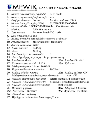 DANE TECHNICZNE POJAZDU 1. Numer rejestracyjny pojazdu: LCF 8690 2. Numer poprzedniej rejestracji: xxx 3. Kraj producenta: Polska 3a. Rok budowy: 1995 4. Numer identyfikacyjny(VIN): SUPB06EJLSN034769 5. Numer silnika: 10CUC74001986 5a. Katalizator: nie 6. Marka: FSO Warszawa 7. Typ, model: Polonez Truck DC 1,9D 8. Kod typu modelu: xxx 9. Rodzaj pojazdu: samochód ciężarowo osobowy 10. Przeznaczenie: przewóz osób i ładunków 11. Barwa nadwozia: biały 12. Masa własna: 1246kg 13. dmc: 2261kg 14. Liczba miejsc do siedzenia: 5 15. dmc ciągniętej przyczepy: nie przystosowany 16. Liczba osi: dwie 16a. Liczba kół: 4+ 1 17. Rozmiar opon przód: 175/14 17a. Tył: <<< 18. Maksymalny nacisk osi: 10,0 kN 1905cm3 19. Pojemność skokowa silnika: 20. Rodzaj silnika: wtrysk 20a. Rodzaj paliwa: ON 21. Maksymalna moc silnika przy obrotach: xxx kW 22. Miejsce mocowania tabliczki: ściana przedziału silnikowego 23. Miejsce wybicia numeru VIN: podszybie przedziału silnikowego 24. Miejsce wybicia numeru silnika: blok silnika 25. Wymiary pojazdu: 25a. Długość: 5275mm 25b. Szerokość: 1650mm 25c. Wysokość: 1500mm 26. Akumulator: opisany 27. Wyciąg ze świadectwa homologacji: nie