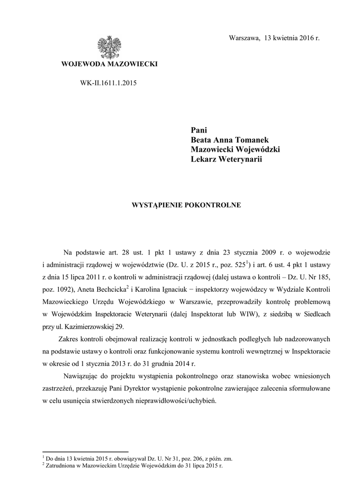 Warszawa, 13 kwietnia 2016 r. WOJEWODA MAZOWIECKI WK-II.1611.1.2015 Pani Beata Anna Tomanek Mazowiecki Wojewódzki Lekarz Weterynarii WYSTĄPIENIE POKONTROLNE Na podstawie art. 28 ust. 1 pkt 1 ustawy z dnia 23 stycznia 2009 r. o wojewodzie i administracji rządowej w województwie (Dz. U. z 2015 r., poz. 525 1) i art. 6 ust. 4 pkt 1 ustawy z dnia 15 lipca 2011 r. o kontroli w administracji rządowej (dalej ustawa o kontroli – Dz. U. Nr 185, poz. 1092), Aneta Bechcicka2 i Karolina Ignaciuk − inspektorzy wojewódzcy w Wydziale Kontroli Mazowieckiego Urzędu Wojewódzkiego w Warszawie, przeprowadziły kontrolę problemową w Wojewódzkim Inspektoracie Weterynarii (dalej Inspektorat lub WIW), z siedzibą w Siedlcach przy ul. Kazimierzowskiej 29. Zakres kontroli obejmował realizację kontroli w jednostkach podległych lub nadzorowanych na podstawie ustawy o kontroli oraz funkcjonowanie systemu kontroli wewnętrznej w Inspektoracie w okresie od 1 stycznia 2013 r. do 31 grudnia 2014 r. Nawiązując do projektu wystąpienia pokontrolnego oraz stanowiska wobec wniesionych zastrzeżeń, przekazuję Pani Dyrektor wystąpienie pokontrolne zawierające zalecenia sformułowane w celu usunięcia stwierdzonych nieprawidłowości/uchybień. 1 2 Do dnia 13 kwietnia 2015 r. obowiązywał Dz. U. Nr 31, poz. 206, z późn. zm. Zatrudniona w Mazowieckim Urzędzie Wojewódzkim do 31 lipca 2015 r. Zasady realizacji zadań i kierowania WIW, wewnętrzną organizację jednostki oraz podział zadań pomiędzy poszczególne komórki organizacyjne określał Regulamin Organizacyjny Wojewódzkiego Inspektoratu Weterynarii z siedzibą w Siedlcach (dalej RO WIW)3 ustalony przez Mazowieckiego Wojewódzkiego Lekarza Weterynarii (dalej MWLW) w uzgodnieniu z Głównym Lekarzem Weterynarii (dalej GLW). W myśl § 2 ust. 2 pkt 10 RO WIW przeprowadzanie kontroli wewnętrznych4 należało do zadań kierowników. Zadania związane z planowaniem i realizacją kontroli w powiatowych inspektoratach weterynarii (dalej PIW) realizowane były, zgodnie z § 14 pkt 1, 5, 6 oraz § 15 pkt 1, 6, 12, 13 i 14 RO WIW, przez zespół ds. zdrowia i ochrony zwierząt oraz zespół ds. bezpieczeństwa żywności, pasz oraz ubocznych produktów zwierzęcych. Koordynowanie kontroli wewnętrznych należących do kompetencji MWLW w zakresie opracowywania rocznego planu kontroli Inspektoratu, nadzoru nad jego realizacją przez kierowników oraz sporządzania sprawozdań z działalności kontrolnej WIW należało, w myśl § 21 ust. 1 pkt 1 RO WIW, do zadań działu ds. kontroli w zespole ds. oceny działalności Inspekcji Weterynaryjnej. Nowy RO WIW5, obowiązujący od 27 sierpnia 2015 r., powierzył przeprowadzanie instytucjonalnej kontroli wewnętrznej w stosunku do komórek organizacyjnych pracownikom działu ds. kontroli (§ 3 pkt 10), natomiast zadania związane z planowaniem i realizacją kontroli w PIW realizowane są przez zespół do spraw zdrowia i ochrony zwierząt, zespół do spraw bezpieczeństwa żywności oraz zespół do spraw pasz i utylizacji (§ 15 pkt 1, 3, § 16 pkt 1, 3, 4, 6, 7 oraz § 17 pkt 1, 4, 5, 10 RO WIW z 2015 r.). Koordynowanie kontroli zewnętrznych 6 należących do kompetencji Mazowieckiego Wojewódzkiego Lekarza Weterynarii (dalej WLW) w zakresie opracowywania rocznego planu kontroli Inspektoratu, nadzoru nad jego realizacją przez kierowników, sporządzanie sprawozdań oraz realizacja kontroli wewnętrznych należało w myśl § 25 RO WIW z 2015 r. do zadań działu do spraw kontroli w zespole do spraw administracyjnych. Mazowiecki Wojewódzki Lekarz Weterynarii Zarządzeniem nr 17 z 19 listopada 2012 r. w sprawie powołania Pełnomocnika Mazowieckiego Wojewódzkiego Lekarza Weterynarii ds. kontroli powołał pana …………………… na stanowisko Pełnomocnika Mazowieckiego 3 Wprowadzony Zarządzeniem Nr 15 MWLW z dnia 6 maja 2011 r. w sprawie ustalenia Regulaminu Organizacyjnego Wojewódzkiego Inspektoratu Weterynarii; zmieniony Zarządzeniami MWLW: Nr 7 z dnia 10 lutego 2014 r. oraz Nr 27 z dnia 7 sierpnia 2014 r. 4 W rozumieniu § 2 ust. 2 pkt 10 RO WIW kontrolami wewnętrznymi były kontrole przeprowadzane przez WLW w PIW oraz kontrole przeprowadzane przez kierowników w Inspektoracie i komórkach organizacyjnych. 5 Wprowadzony Zarządzeniem nr 14 z dnia 26 sierpnia 2015 r. w sprawie ustalenia Regulaminu Organizacyjnego Wojewódzkiego Inspektoratu Weterynarii z siedzibą w Siedlcach, uzgodniony z GLW i zatwierdzony przez Wojewodę Mazowieckiego 14 lipca 2015 r. 6 W rozumieniu § 3 pkt 9 RO WIW kontrolami zewnętrznymi były kontrole wykonywane przez WLW w stosunku do organów, jednostek i podmiotów, o których mowa w przepisach o kontroli w administracji rządowej, oraz kontrola wykonywana w stosunku do organów, jednostek i podmiotów określonych w przepisach szczególnych. 2 Wojewódzkiego Lekarza Weterynarii ds. kontroli (dalej Pełnomocnik ds. kontroli). Do jego zadań należało wykonywanie uprawnień i obowiązków kierownika komórki do spraw kontroli określonych w ustawie o kontroli, w tym w szczególności: opracowanie rocznego planu kontroli, koordynowanie pracy kontrolerów oraz zarządzanie kontrolami, analizowanie skuteczności działań pokontrolnych, wdrażanie Standardów kontroli w administracji rządowej, zapewnienie realizacji kontroli z uwzględnieniem celów, zasad i zadań przewidzianych przepisami. Od 4 marca 2014 r. w WIW obowiązywała Procedura Operacyjna PO-06 Kontrola działalności (dalej Procedura), opracowana przez Pełnomocnika ds. kontroli i zatwierdzona przez MWLW, określająca standardowe postępowanie podczas procesu kontroli w PIW. W badanym okresie MWLW przeprowadził 2397 kontroli działalności podległych powiatowych lekarzy weterynarii (dalej PLW), w tym w 2013 r. 117 kontroli, a w 2014 r. 122 kontrole. Nie prowadzono kontroli wewnętrznych. Analizie poddano dokumentację 49 kontroli zrealizowanych w 2014 r. (co stanowi 40% spraw), w tym akta 15 kontro