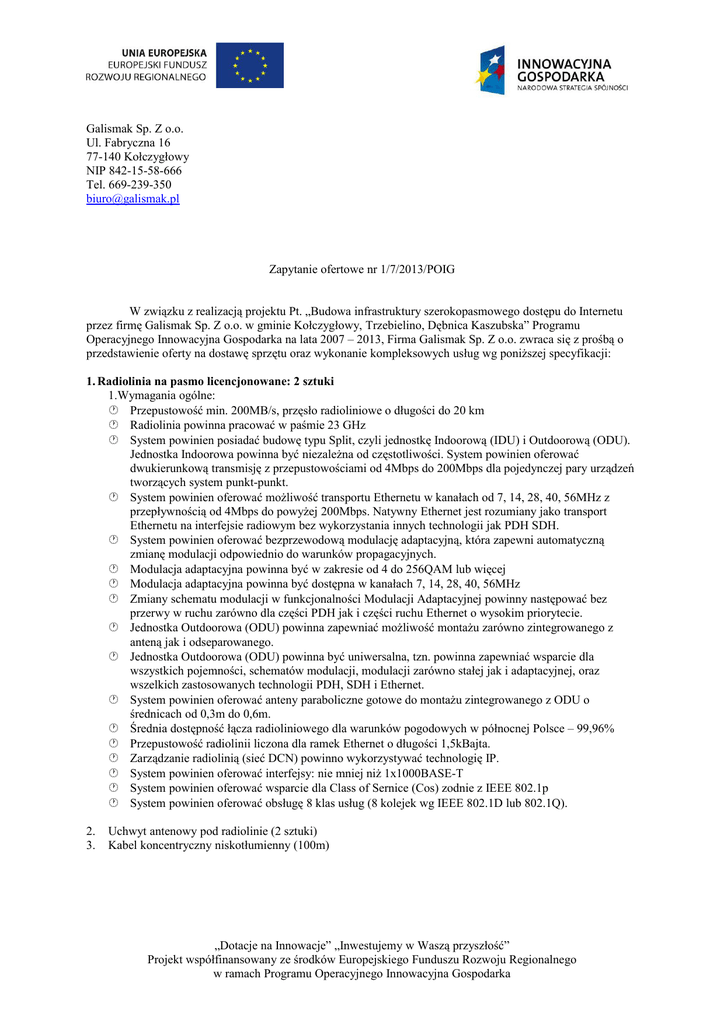 Galismak Sp. Z o.o. Ul. Fabryczna 16 77-140 Kołczygłowy NIP 842-15-58-666 Tel. 669-239-350 [email protected] Zapytanie ofertowe nr 1/7/2013/POIG W związku z realizacją projektu Pt. „Budowa infrastruktury szerokopasmowego dostępu do Internetu przez firmę Galismak Sp. Z o.o. w gminie Kołczygłowy, Trzebielino, Dębnica Kaszubska” Programu Operacyjnego Innowacyjna Gospodarka na lata 2007 – 2013, Firma Galismak Sp. Z o.o. zwraca się z prośbą o przedstawienie oferty na dostawę sprzętu oraz wykonanie kompleksowych usług wg poniższej specyfikacji: 1. Radiolinia na pasmo licencjonowane: 2 sztuki 1.Wymagania ogólne: Przepustowość min. 200MB/s, przęsło radioliniowe o długości do 20 km Radiolinia powinna pracować w paśmie 23 GHz System powinien posiadać budowę typu Split, czyli jednostkę Indoorową (IDU) i Outdoorową (ODU). Jednostka Indoorowa powinna być niezależna od częstotliwości. System powinien oferować dwukierunkową transmisję z przepustowościami od 4Mbps do 200Mbps dla pojedynczej pary urządzeń tworzących system punkt-punkt. System powinien oferować możliwość transportu Ethernetu w kanałach od 7, 14, 28, 40, 56MHz z przepływnością od 4Mbps do powyżej 200Mbps. Natywny Ethernet jest rozumiany jako transport Ethernetu na interfejsie radiowym bez wykorzystania innych technologii jak PDH SDH. System powinien oferować bezprzewodową modulację adaptacyjną, która zapewni automatyczną zmianę modulacji odpowiednio do warunków propagacyjnych. Modulacja adaptacyjna powinna być w zakresie od 4 do 256QAM lub więcej Modulacja adaptacyjna powinna być dostępna w kanałach 7, 14, 28, 40, 56MHz Zmiany schematu modulacji w funkcjonalności Modulacji Adaptacyjnej powinny następować bez przerwy w ruchu zarówno dla części PDH jak i części ruchu Ethernet o wysokim priorytecie. Jednostka Outdoorowa (ODU) powinna zapewniać możliwość montażu zarówno zintegrowanego z anteną jak i odseparowanego. Jednostka Outdoorowa (ODU) powinna być uniwersalna, tzn. powinna zapewniać wsparcie dla wszystkich pojemności, schematów modulacji, modulacji zarówno stałej jak i adaptacyjnej, oraz wszelkich zastosowanych technologii PDH, SDH i Ethernet. System powinien oferować anteny paraboliczne gotowe do montażu zintegrowanego z ODU o średnicach od 0,3m do 0,6m. Średnia dostępność łącza radioliniowego dla warunków pogodowych w północnej Polsce – 99,96% Przepustowość radiolinii liczona dla ramek Ethernet o długości 1,5kBajta. Zarządzanie radiolinią (sieć DCN) powinno wykorzystywać technologię IP. System powinien oferować interfejsy: nie mniej niż 1x1000BASE-T System powinien oferować wsparcie dla Class of Sernice (Cos) zodnie z IEEE 802.1p System powinien oferować obsługę 8 klas usług (8 kolejek wg IEEE 802.1D lub 802.1Q). 2. 3. Uchwyt antenowy pod radiolinie (2 sztuki) Kabel koncentryczny niskotłumienny (100m) „Dotacje na Innowacje” „Inwestujemy w Waszą przyszłość” Projekt współfinansowany ze środków Europejskiego Funduszu Rozwoju Regionalnego w ramach Programu Operacyjnego Innowacyjna Gospodarka 2.Wyposażenie stacji bazowej sieci bezprzewodowej – 12 sztuk 1. Specyfikacja techniczna zestawu bazowego (3 komplety: Antena + Urządzenie) a. Antena Zakres częstotliwośći pracy Zysk energetyczny Max. VSWR Kąt promieniowania Złącze antenowe b. Urządzenie Częstotliwość pracy Procesor Pamięć Interfejs sieciowy Układ radiowy Certyfikacja Zasilanie Temperatura pracy Złącze antenowe (RF Connector) 2. 5500MHz – 5700MHz 300 – 800 MHz 32-64MB SDRAM I Min 1x10/100 BASE-TX (Cat. 5, RJ-45) Ethernet 802.11a/n FCC Part 15.247, IC RS210, CE PoE 8-24V -30ºC do +75º RPSMA lub Nż Specyfikacja techniczna urządzenia dosyłowego – 1komplet (2 sztuki): Częstotliwość pracy CPU Pamięć RAM Port Ethernet Układ radiowy Zysk anteny VSWR Zasilanie Temperatura pracy Certyfikaty Zalecane zabezpieczenie przeciwprzepięciowe 3. 5500MHz – 5700MHz 8 – 21 dBi 1.7:1 60 - 120º RPSMA lub Nż, lub zintegrowane z urządzeniem 5500MHz – 5700MHz 300 – 800 MHz 32 – 64 MB DDR SDRAM lub więcej Min. 1x10/100 BASE-TX (Cat. 5, RJ-45) Ethernet 802.11a/n 14 – 29 dBi 1.7:1 max. PoE 8 – 30 V DC -30ºC - +80ºC FCC, CE, ROHS Do 10 kV ESD Specyfikacja zasilacza buforowego (1 sztuka): Napięcie wyjściowe od 24V do 29V Maksymalny prąd wyjściowy 5A Moc wyjściowa od 55 – 155 W Regulacja napięcia wyjściowego: 23-29 V Temperatura pracy: -20 do +50 ºC Zabezpieczenie: nadnapięciowe i zwarciowe Zabezpieczenie przed głębokim rozładowaniem baterii (akumulator max 120Ah) Chłodzenie w układzie otwartym bez wymuszonego obiegu powietrza Stała częstotliwość pracy impulsowej 45kHz Spełnia normy: UL / CUL / TUV / CB / CE Akumulatory awaryjne (2 sztuki) Rodzaj – akumulatory żelowe Napięcie: 12V Pojemność: 8-120 Ah „Dotacje na Innowacje” „Inwestujemy w Waszą przyszłość” Projekt współfinansowany ze środków Europejskiego Funduszu Rozwoju Regionalnego w ramach Programu Operacyjnego Innowacyjna Gospodarka Charakterystyka napięć ładowania: Praca cykliczna 14.5~14.9V Tryb czuwania: 13.6~13.8V 4. Skrzynia montażowa (1 sztuka) 5. Switch z funkcją PoE (1 sztuka) 6. Uchwyt antenowy (4 sztuki) 7. Kabel sieciowy min. FTP Kat. 6 zewnętrzny: 200m 8. Końcówka RJ-45: 40 sztuk 3.Wyposażenie stacji głównej bazowej sieci bezprzewodowej – 1 sztuk 1. Specyfikacja techniczna zestawu bazowego (4 komplety: Antena + Urządzenie) a.Antena Zakres częstotliwośći pracy Zysk energetyczny Max. VSWR Kąt promieniowania Złącze antenowe 5500MHz – 5700MHz 8 – 21 dBi 1.7:1 60 - 120º RPSMA lub Nż, lub zintegrowane z urządzeniem b. Urządzenie – ruch zintegrowany Częstotliwość pracy Procesor Pamięć Interfejs sieciowy 2. 5500MHz – 5700MHz 300 – 800 MHz 32-64MB SDRAM I Min 1x10/100 BASE-TX (Cat. 5, RJ-45) Ethernet Układ radiowy 802.11a/n Certyfikacja FCC Part 15.247, IC RS210, CE Zasilanie PoE 8-24V Tem