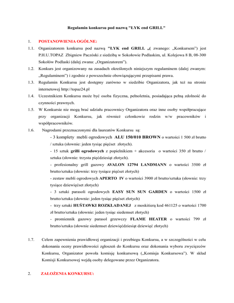 Regulamin konkursu pod nazwą "ŁYK end GRILL" 1. POSTANOWIENIA OGÓLNE: 1.1. Organizatorem konkursu pod nazwą "ŁYK end GRILL „( zwanego: „Konkursem”) jest P.H.U.TOPAZ Zbigniew Paczóski z siedzibą w Sokołowie Podlaskim, ul. Kolejowa 8 B, 08-300 Sokołów Podlaski (dalej zwana: „Organizatorem”). 1.2. Konkurs jest organizowany na zasadach określonych niniejszym regulaminem (dalej zwanym: „Regulaminem”) i zgodnie z powszechnie obowiązującymi przepisami prawa. 1.3. Regulamin Konkursu jest dostępny zarówno w siedzibie Organizatora, jak też na stronie internetowej http://topaz24.pl 1.4. Uczestnikiem Konkursu może być osoba fizyczna, pełnoletnia, posiadająca pełną zdolność do czynności prawnych. 1.5. W Konkursie nie mogą brać udziału pracownicy Organizatora oraz inne osoby współpracujące przy organizacji Konkursu, jak również członkowie rodzin w/w pracowników i współpracowników. 1.6. Nagrodami przeznaczonymi dla laureatów Konkursu są: - 3 komplety mebli ogrodowych ALU 150/010 BROWN o wartości 1 500 zł brutto / sztuka (słownie: jeden tysiąc pięćset złotych). - 15 sztuk grilli ogrodowych z popielnikiem + akcesoria o wartości 350 zł brutto / sztuka (słownie: trzysta pięćdziesiąt złotych). - profesionalny grill gazowy AVALON 12794 LANDMANN o wartości 3500 zł brutto/sztuka (słownie: trzy tysiące pięćset złotych) - zestaw mebli ogrodowych APERTO IV o wartości 3900 zł brutto/sztuka (słownie: trzy tysiące dziewięćset złotych) - 3 sztuki parasoli ogrodowych EASY SUN SUN GARDEN o wartości 1500 zł brutto/sztuka (słownie: jeden tysiąc pięćset złotych) - trzy sztuki HUŚTAWKI ROZKŁADANEJ z moskitierą kod 461125 o wartości 1700 zł brutto/sztuka (słownie: jeden tysiąc siedemset złotych) - promiennik gazowy parasol grzewczy FLAME HEATER o wartości 799 zł brutto/sztuka (słownie siedemset dziewięćdziesiąt dziewięć złotych) 1.7. Celem zapewnienia prawidłowej organizacji i przebiegu Konkursu, a w szczególności w celu dokonania oceny prawidłowości zgłoszeń do Konkursu oraz dokonania wyboru zwycięzców Konkursu, Organizator powoła komisję konkursową („Komisja Konkursowa”). W skład Komisji Konkursowej wejdą osoby delegowane przez Organizatora. 2. ZAŁOŻENIA KONKURSU: 2.1. Konkurs będzie trwał w dniach 21.04.2016 r. - 12.06.2016r. 2.2. Aby wziąć udział w konkursie „ŁYK end GRIL” należy zakupić w Sieci Sklepów TOPAZ produkty marek – KNORR, HELLMANN’S, TORTEX na wartość 10 zł UWAGA!!!: zachować paragon. Następnie wysłać hasło reklamujące produkty KNORR, HELLMANN S, TORTEX i wysłać na adres e-mail: [email protected] wraz z imieniem, nazwiskiem, adresem zamieszkania, numeru telefonu, numeru paragonu oraz zgodę na publikację hasła w materiałach reklamowych firmy Topaz oraz Unilever. 3. ZASADY PROWADZENIA KONKURSU: 3.1. Organizator zamieści ogłoszenia o Konkursie, o których mowa w pkt 2.1 powyżej, informacje o zasadach Konkursu, nagrodach, oraz ramach czasowych Konkursu. 3.2. Uczestnicy Konkursu są identyfikowani przez Organizatora na podstawie adresu e-mail, z którego wysyłają zgłoszenia w Konkursie. 3.3. Konkurs będzie składał się z jednego etapu. 3.4. Konkurs polegać będzie na wykonaniu zadania konkursowego opisanego w ogłoszeniu o Konkursie oraz wysłaniu odpowiedzi pod adres e-mail [email protected] podany także w ogłoszeniach o Konkursie, o którym mowa w pkt. 2.1 niniejszego Regulaminu. Komisja Konkursowa wybierze najciekawsze, najbardziej pomysłowe i oryginalne hasło reklamujące produkty firmy UNILEVER (KNORR, HELLMANN S, TORTEX). Nie ma znaczenia kolejność zgłoszeń. Termin nadsyłania zgłoszeń upłynie 12.06.2016r. 3.5. Wybrani przez Komisję Konkursową zwycięzcy w liczbie 27 zostaną poinformowani mailowo lub telefonicznie o wygranej w ciągu 20 dni od zakończenia zbierania zgłoszeń. 3.6. Uczestnik zobowiązany jest do przesłania swoich pełnych danych osobowych zawierających: imię, nazwisko, adres, numer telefonu kontaktowego, numer paragonu i zgodę na publikację hasła w materiałach reklamowych Topaz oraz Unilever. 3.7. Nagrody wskazane w pkt. 1.6 zostaną przyznane po spełnieniu warunków określonych w niniejszym Regulaminie w tym warunku, o którym mowa w pkt 4.3 poniżej, jeśli dotyczy. 3.8. Jedna osoba może wziąć udział w Konkursie tj. udzielić odpowiedzi na zadany temat, dowolną ilość razy, jednak może wygrać tylko jedną nagrodę, niezależnie od ilości adresów e- mail, do których korzystania osoba taka jest uprawniona i z których to adresów korzystała wysyłając wiadomość e - mail w Konkursie. Laureaci będą identyfikowani za pomocą adresu e-mail, imienia, nazwiska jak i adresu zamieszkania. W celu uniknięcia wątpliwości, osoba posługująca się różnymi adresami e-mail może być laureatem tylko jednej nagrody. Laureatami Konkursu nie mogą być jednocześnie krewni i powinowaci do drugiego stopnia powinowactwa, ani inne osoby zameldowane pod tym samym adresem lub przebywający pod tym samym adresem. W sytuacji, gdy laureatami Konkursu zostaną ww. osoby, nagrodę otrzyma tylko laureat, którego wiadomość e mail ze zgłoszeniem do Konkursu została najszybciej odebrana przez Organizatora, wg rejestru Organizatora, natomiast nagroda dla drugiego uczestnika przechodzi na rzecz Organizatora. W przypadku gdyby wiadomości email uczestników zostały odebrane przez Organizatora w identycznym czasie, Organizatorowi przysługuje prawo wyboru Laureata. 3.9. Uczestnik przekazuje prawa autorskie do hasła konkursowego „ŁYK end GRILL” Organizatorom konkursu i jednocześnie wyraża zgodę na używanie go w materiałach reklamowych firmy TOPAZ oraz UNILEVER. 3.10. Organizator oświadcza, że dane osobowe uczestnika w zakresie: imię i nazwisko, adres e mail lub odpowiednio adres zamieszkania, będą przetwarzane przez Organizatora Konkursu z siedzibą w Sokołowie Podlaski ul. Kolejowa 8 B. w celu