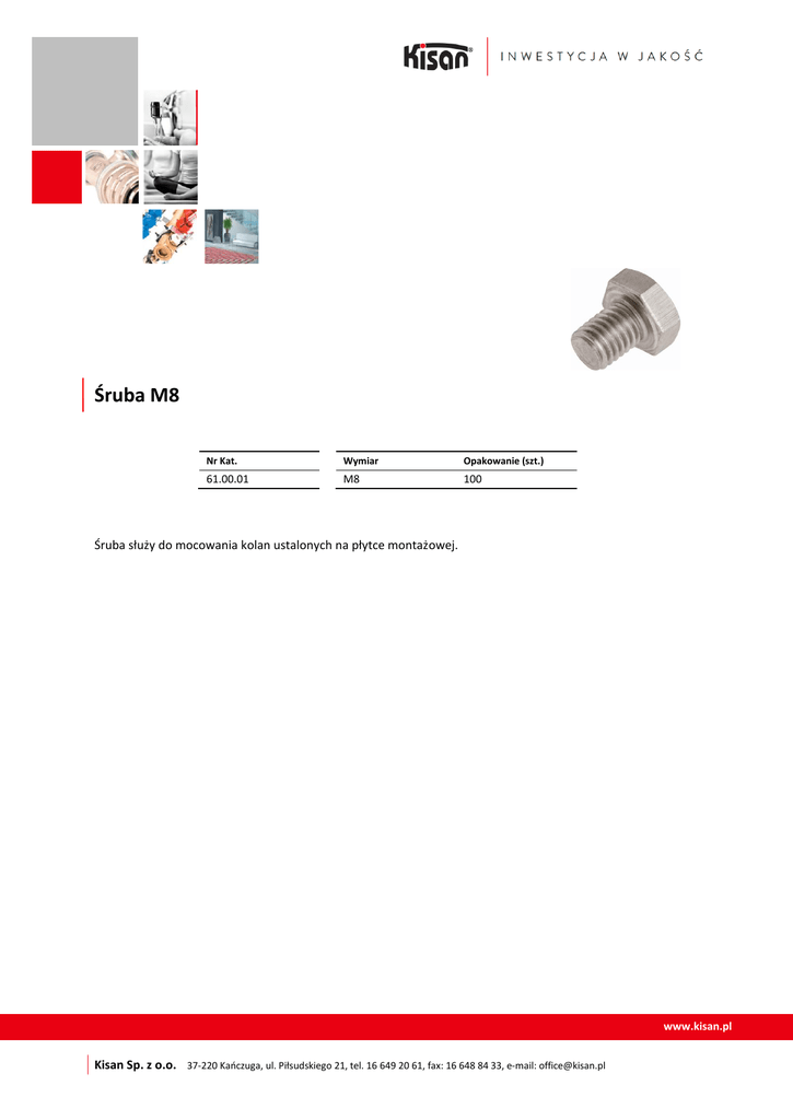 Śruba M8 Nr Kat. Wymiar Opakowanie (szt.) 61.00.01 M8 100 Śruba służy do mocowania kolan ustalonych na płytce montażowej. www.kisan.pl Kisan Sp. z o.o. 37-220 Kańczuga, ul. Piłsudskiego 21, tel. 16 649 20 61, fax: 16 648 84 33, e-mail: [email protected]
