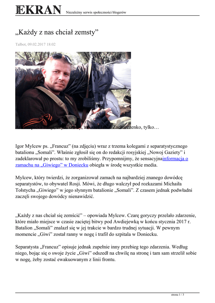 Niezależny serwis społeczności blogerów „Każdy z nas chciał zemsty” Talbot, 09.02.2017 18:02 Ani bezpieka Rosji, czy Ukrainy, ani szef DNR Zacharczenko, tylko… Igor Mylcew ps. „Francuz” (na zdjęciu) wraz z trzema kolegami z separatystycznego batalionu „Somali”. Właśnie zgłosił się on do redakcji rosyjskiej „Nowoj Gaziety” i zadeklarował po prostu: to my zrobiliśmy. Przypomnijmy, że sensacyjnainformacja o zamachu na „Giwiego” w Doniecku obiegła w środę wszystkie media. Mylcew, który twierdzi, że zorganizował zamach na najbardziej znanego dowódcę separatystów, to obywatel Rosji. Mówi, że długo walczył pod rozkazami Michaiła Tołstycha „Giwiego” w jego słynnym batalionie „Somali”. Z czasem jednak podwładni zaczęli swojego dowódcy nienawidzić. „Każdy z nas chciał się zemścić” – opowiada Mylcew. Czarę goryczy przelało zdarzenie, które miało miejsce w czasie zaciętej bitwy pod Awdiejewką w końcu stycznia 2017 r. Batalion „Somali” znalazł się w jej trakcie w bardzo trudnej sytuacji. W pewnym momencie „Giwi” został ranny w nogę i trafił do szpitala w Doniecku. Separatysta „Francuz” opisuje jednak zupełnie inny przebieg tego zdarzenia. Według niego, bojąc się o swoje życie „Giwi” odszedł na chwilę na stronę i tam sam strzelił sobie w nogę, żeby zostać ewakuowanym z linii frontu. strona 1 / 3 Niezależny serwis społeczności blogerów „Tak po prostu nie mógł uciec, to byłaby dezercja. Był rozkaz Zachara (Zacharczenki – szefa DNR – red.): stać do końca! I wtedy „Giwi” zrozumiał, że to koniec. Przestrzelił sobie nogę i zaczął się drzeć” – opowiada „Francuz”. „Myślał, że nikt tego nie widział, ale myśmy widzieli. Potem dyżurni lekarze zabrali go do szpitala. Kiedy dotarł już do Doniecka wydał rozkaz przykryć nasze pozycje ogniem artylerii wiedząc, że my tam jesteśmy. Myślał, że po tym nie ma już nas wśród żywych!” – relacjonuje separatysta Mylcew. Dlatego wraz z kolegami postanowił, że nie darują tego swojemu dowódcy. Postanowili się zemścić. Odpalili w okno jego biura w sztabie batalionu „Somali” w Doniecku pocisk z granatnika rakietowego. „To za chłopaków poległych pod Awdiejewką!” – mówi „Francuz” w rozmowie z „Nową Gazietą”. Oskarżenia, że zamachu na „Giwiego” dokonała Służba Bezpieczeństwa Ukrainy nazywa „śmiesznymi”. „SBU za linię rozgraniczenia nawet nie próbuje przechodzić” – twierdzi. Zobacz szczątki „Giwiego” w zrujnowanym biurze tuż po zamachu. Relacja separatysty Mylcewa kompletnie obala mit „nieustraszonego Giwiego” i „spisku ukraińskich służb na jego życie”. Nie można jednak wykluczyć, że to jakaś dziwna prowokacja. Pytanie przez kogo przygotowana i w jakim celu? Ukraińcy przekupili separatystę, żeby podał taką wersję? Ale przecież grozi mu za to w Rosji odpowiedzialność karna. Rosyjskie służby postanowiły w ten sposób odsunąć od siebie podejrzenia? Ale po co w takim razie pogrążają przy okazji „Giwiego” zamiast zrobić z niego kolejnego „męczennika DNR”? A może rzeczywiście była to zemsta zdradzonych przez dowódcę i wściekłych na niego żołnierzy? strona 2 / 3 Niezależny serwis społeczności blogerów Igor Mylcew z kolegami z batalionu „Somali”. To oni „załatwili „Giwiego”? Czytaj więcej o zamachu na „Giwiego”:Groził Polsce, już po nim! Najbardziej słynny separatysta „Giwi” zabity. Reporters.pl strona 3 / 3 Powered by TCPDF (www.tcpdf.org)