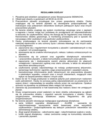 REGULAMIN OGÓLNY 1. Pływalnia jest obiektem zarządzanym przez Stowarzyszenie SIEMACHA. 2. Obiekt jest otwarty w godzinach od 08.00 do 22.00. 3. Pracownikom pływalni przysługuje tzw. prawo gospodarza obiektu. Osoby znajdujące się na terenie pływalni są obowiązane podporządkować się instrukcjom oraz poleceniom ratowników wodnych pełniących dyżur oraz innych pracowników pływalni. 4. Na terenie obiektu znajduje się system monitoringu wizyjnego wraz z zapisem a nagrania z kamer mogą być podstawą do pociągnięcia do odpowiedzialności w stosunku do użytkowników, którzy nie stosują się do regulaminu oraz instrukcji. Kierownictwo obiektu gwarantuje, iż monitoring prowadzony jest w sposób nie naruszający dóbr osobistych oraz godności użytkowników. 5. Osoby przebywające na terenie pływalni zobowiązane są do zachowania należytej staranności w celu ochrony życia i zdrowia własnego oraz innych osób, a w szczególności: a. zapoznania się z regulaminem korzystania z pływalni i zainstalowanych w niej urządzeń i ich przestrzegania, b. stosowania się do znaków informacyjnych, nakazu i zakazu umieszczonych na pływalni, c. stosowania się do poleceń oraz sygnałów dźwiękowych ratowników i pracowników pływalni, a także komunikatów podawanych przez głośniki, d. zapoznania się i dostosowania swoich planów aktywności do własnych umiejętności i sprawności ogólnej oraz stanu zdrowia, a także do aktualnych warunków atmosferycznych, e. użytkowania sprzętu odpowiedniego do rodzaju podejmowanej aktywności, sprawnego technicznie i zgodnie z jego przeznaczeniem i zasadami użycia, f. bezzwłocznego informowania służb ratowniczych lub pracowników pływalni o zaistniałym wypadku, urazach oraz o innych zdarzeniach, mogących mieć wpływ na bezpieczeństwo własne i innych osób. 6. Dzieci do lat 13 mogą przebywać w obiekcie jedynie pod ustawicznym nadzorem osób pełnoletnich. Osoby te ponoszą pełną odpowiedzialność za powierzone ich opiece dzieci i odpowiadają za wszelkie szkody przez nie wyrządzone. Opiekun wchodzi na pływalnię na podstawie biletu wstępu lub karnetu. 7. Zabrania się pozostawiania w hali basenowej bez nadzoru dzieci nie umiejących pływać. 8. Grupy zorganizowane przed wejściem na teren obiektu zobowiązane są zgłosić się do pracownika obiektu i uzgodnić warunki korzystania z obiektu. Grupy zorganizowane obowiązują dodatkowo zapisy Regulaminu dla grup zorganizowanych. 9. Na terenie pływalni obowiązuje następująca sygnalizacja dźwiękowa: a. seria krótkich sygnałów dźwiękowych - ALARM - wezwanie do natychmiastowego opuszczenia niecki basenowej przez wszystkich użytkowników i podporządkowania się dalszym poleceniom ratowników lub administracji obiektu, b. długi sygnał dźwiękowy - zakończenie zajęć - natychmiastowe wyjście z wody, c. krótki sygnał dźwiękowy - nakaz zwrócenia uwagi na komunikaty ratownika i personelu pływalni. 10. Długi sygnał dźwiękowy jest sygnałem do natychmiastowego wyjścia z wody. Po usłyszeniu sygnału należy opuścić nieckę i oczekiwać na dalsze polecenia ratowników lub personelu. 11. Na akwenach pływalni wyznaczone są następujące strefy, do których, po uwzględnieniu swoich umiejętności, należy dostosować własne plany aktywności: a. strefa dla nieumiejących pływać – o głębokości do 1,2 m, b. strefa dla umiejących pływać – o głębokości do 1,5 m. 12. Faktyczne głębokości w poszczególnych strefach podane są w postaci piktogramów na ścianach w pobliżu niecek basenowych. 13. Osoby nie umiejące pływać mogą korzystać wyłącznie ze strefy dla nie umiejących pływać. 14. Wstęp na halę basenu odbywa się na podstawie posiadania biletu lub karnetu dla osób indywidualnych i grup zorganizowanych. 15. Wstęp na teren pływalni oznacza, że użytkownik zobowiązuje się do przestrzegania wszystkich regulaminów i innych zarządzeń, wydanych w celu zapewnienia bezpieczeństwa w obiekcie. 16. Kierownictwo obiektu może czasowo ograniczyć wstęp na pływalnię ze względu na przekroczenie maksymalnej ilości korzystających osób. 17. Użytkownicy będą wpuszczani do obiektu nie później niż 40 minut przed jego zamknięciem. 18. Przed wejściem do szatni obowiązuje zmiana obuwia zewnętrznego na obuwie basenowe (dopuszczalne jest chodzenie boso). Po zakończeniu pływania oraz przebraniu się zmiana obuwia z basenowego na zewnętrze następuje po opuszczeniu szatni. 19. Zmiana ubrania na strój basenowy odbywa się w szatniach. 20. Osoby korzystające z hali basenowej są zobowiązane do umieszczania i przechowywania odzieży, toreb i innych przedmiotów wniesionych na teren obiektu w szatniach w wyznaczonych szafkach. 21. Za rzeczy pozostawione bez nadzoru na terenie obiektu, Kierownictwo nie odpowiada. 22. Przed wyjściem z szatni na teren niecki basenowej należy sprawdzić, czy szafka została zamknięta. Za rzeczy pozostawione w szafkach otwartych lub nieprawidłowo zamkniętych, pieniądze i przedmioty wartościowe Kierownictwo pływalni nie ponosi odpowiedzialności. 23. Każdą osobę obowiązuje przed wejściem do hali basenowej dokładne umycie całego ciała pod natryskiem przy użyciu odpowiednich kosmetyków lub środków myjących (także po skorzystaniu z WC) i dezynfekcja stóp. 24. Na terenie hali basenowej obowiązuje czepek oraz czysty strój kąpielowy, spełniający wymogi higieniczne oraz estetyczne, nie posiadający zamków błyskawicznych albo innych wstawek metalowych lub plastikowych, mogących stanowić zagrożenie dla zdrowia lub bezpieczeństwa korzystającego jak również być przyczyną uszkodzeń elementów wyposażenia pływalni: a. dla kobiet jedno lub dwu częściowy, przylegający do ciała, b. dla mężczyzn kąpielówki o długości maksymalnie do połowy uda. 25. Dzieci do lat 3 korzystające z basenu muszą posiadać na sobie jednorazowe pielucho majtki do kąpieli. 2