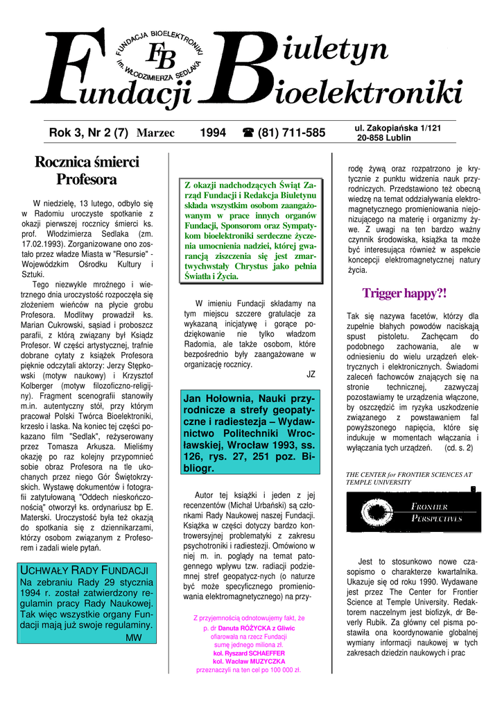 Rok 3, Nr 2 (7) Marzec Rocznica mierci Profesora W niedziel , 13 lutego, odbyło si w Radomiu uroczyste spotkanie z okazji pierwszej rocznicy mierci ks. prof. Włodzimierza Sedlaka (zm. 17.02.1993). Zorganizowane ono zostało przez władze Miasta w "Resursie" Wojewódzkim O rodku Kultury i Sztuki. Tego niezwykle mro nego i wietrznego dnia uroczysto rozpocz ła si zło eniem wie ców na płycie grobu Profesora. Modlitwy prowadził ks. Marian Cukrowski, s siad i proboszcz parafii, z któr zwi zany był Ksi dz Profesor. W cz ci artystycznej, trafnie dobrane cytaty z ksi ek Profesora pi knie odczytali aktorzy: Jerzy St pkowski (motyw naukowy) i Krzysztof Kolberger (motyw filozoficzno-religijny). Fragment scenografii stanowiły m.in. autentyczny stół, przy którym pracował Polski Twórca Bioelektroniki, krzesło i laska. Na koniec tej cz ci pokazano film "Sedlak", re yserowany przez Tomasza Arkusza. Mieli my okazj po raz kolejny przypomnie sobie obraz Profesora na tle ukochanych przez niego Gór wi tokrzyskich. Wystaw dokumentów i fotografii zatytułowan "Oddech niesko czono ci " otworzył ks. ordynariusz bp E. Materski. Uroczysto była te okazj do spotkania si z dziennikarzami, którzy osobom zwi zanym z Profesorem i zadali wiele pyta . UCHWAŁY RADY FUNDACJI Na zebraniu Rady 29 stycznia 1994 r. został zatwierdzony regulamin pracy Rady Naukowej. Tak wi c wszystkie organy Fundacji maj ju swoje regulaminy. MW 1994 (81) 711-585 Z okazji nadchodz cych wi t Zarz d Fundacji i Redakcja Biuletynu składa wszystkim osobom zaanga owanym w prace innych organów Fundacji, Sponsorom oraz Sympatykom bioelektroniki serdeczne yczenia umocnienia nadziei, której gwarancj ziszczenia si jest zmartwychwstały Chrystus jako pełnia wiatła i ycia. W imieniu Fundacji składamy na tym miejscu szczere gratulacje za wykazan inicjatyw i gor ce podzi kowanie nie tylko władzom Radomia, ale tak e osobom, które bezpo rednio były zaanga owane w organizacj rocznicy. JZ Jan Hołownia, Nauki przyrodnicze a strefy geopatyczne i radiestezja – Wydawnictwo Politechniki Wrocławskiej, Wrocław 1993, ss. 126, rys. 27, 251 poz. Bibliogr. Autor tej ksi ki i jeden z jej recenzentów (Michał Urba ski) s członkami Rady Naukowej naszej Fundacji. Ksi ka w cz ci dotyczy bardzo kontrowersyjnej problematyki z zakresu psychotroniki i radiestezji. Omówiono w niej m. in. pogl dy na temat patogennego wpływu tzw. radiacji podziemnej stref geopatycz-nych (o naturze by mo e specyficznego promieniowania elektromagnetycznego) na przyZ przyjemno ci odnotowujemy fakt, e p. dr Danuta RÓ YCKA z Gliwic ofiarowała na rzecz Fundacji sum jednego miliona zł. kol. Ryszard SCHAEFFER kol. Wacław MUZYCZKA przeznaczyli na ten cel po 100 000 zł. ul. Zakopia ska 1/121 20-858 Lublin rod yw oraz rozpatrzono je krytycznie z punktu widzenia nauk przyrodniczych. Przedstawiono te obecn wiedz na temat oddziaływania elektromagnetycznego promieniowania niejonizuj cego na materi i organizmy ywe. Z uwagi na ten bardzo wa ny czynnik rodowiska, ksi ka ta mo e by interesuj ca równie w aspekcie koncepcji elektromagnetycznej natury ycia. Trigger happy?! Tak si nazywa facetów, którzy dla zupełnie błahych powodów naciskaj spust pistoletu. Zach cam do podobnego zachowania, ale w odniesieniu do wielu urz dze elektrycznych i elektronicznych. wiadomi zalece fachowców znaj cych si na stronie technicznej, zazwyczaj pozostawiamy te urz dzenia wł czone, by oszcz dzi im ryzyka uszkodzenie zwi zanego z powstawaniem fal powy szonego napi cia, które si indukuje w momentach wł czania i wył czania tych urz dze . (cd. s. 2) THE CENTER for FRONTIER SCIENCES AT TEMPLE UNIVERSITY Jest to stosunkowo nowe czasopismo o charakterze kwartalnika. Ukazuje si od roku 1990. Wydawane jest przez The Center for Frontier Science at Temple University. Redaktorem naczelnym jest biofizyk, dr Beverly Rubik. Za główny cel pisma postawiła ona koordynowanie globalnej wymiany informacji naukowej w tych zakresach dziedzin naukowych i prac interdyscyplinarnych, jakie mo na uzna za front badawczy współczesnej nauki, medycyny i technologii. Szczególn uwag po wi ca si tu uwag takim obszarom bada , jak: bioelektromagnetyka, zwi zki zachodz ce pomi dzy wiadomo ci a materi , medycyna komplementarna oraz nowe technologie energetyczne. Ubiegłoroczny jesienny numer czasopisma zawiera takie m. in. artykuły: G. M. Edelman, Morfologia i umysł. Czy jest mo liwe skonstruowanie maszyny zdolnej do percepcji?; J. Benveniste, Przekaz aktywno ci biologicznej przy pomocy pól elektromagnetycznych; E. Del Giudice, Koherencja w materii w stanie stafym i w materii ywej; W. Ross Adey, Szeptanie komórek miedzy sob . Pola elektromagnetyczne i mechanizmy regulacyjne w tkance. Prócz artykułów czasopismo zawiera wiele wa nych działów, takich jak: informacje o intersuj cych spotkaniach naukowych, o przyznanych nagrodach naukowych, listy, recenzje ksi ek, informacje o nowych czasopismach. Roczna prenumerata Frontier Perspectives (4 numery) kosztuje $ 25. JZ TRIGGER (cd. ze strony l) Kto biegły w elektronice szczerze mi doradzał niewył czanie komputera przez cały dzie , je li miałbym od czasu do czasu wykonywa przy jego pomocy jak prac . To, jakbym to okre lił, stałe "trzymanie pod par " tego po ytecznego narz dzie jest gwarancj przedłu enia czas jego bezawaryjnej pracy. Tego zalecenia od pocz tku nie przestrzegam i polecam równie innym takie post powanie. By wobec nic-a-nic niezorientowanych w bioelektronice nie uchodzi za ciemniaka simplex, a za człowieka o wieconego, zachowanie takie tłumacz ch ci oszcz dzana energii. Jest to przyjmowane przez "techników" raczej ze zrozumieniem, zwłaszcza, e ju s na rynku komputery, które przeł czaj si automatycznie na zmniejszon konsumpcj energii, je li przez pewien czas nie s u ywane. Gł bsza motywacja wył czania komputera znajduje si w bioelektronice. Chodzi tu przecie o zachowanie umiaru w eksponowaniu własnego (i innych tak e) organizmu na pola pocho