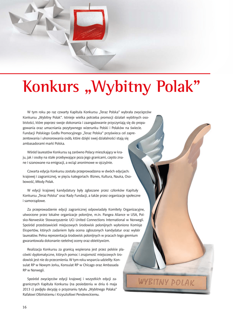 Konkurs „Wybitny Polak” W tym roku po raz czwarty Kapituła Konkursu „Teraz Polska” wybrała zwycięzców Konkursu „Wybitny Polak”. Istnieje wielka potrzeba promocji działań wybitnych osobistości, które poprzez swoje dokonania i zaangażowanie przyczyniają się do propagowania oraz umacniania pozytywnego wizerunku Polski i Polaków na świecie. Fundacji Polskiego Godła Promocyjnego „Teraz Polska” przyświeca cel zaprezentowania i uhonorowania osób, które dzięki swej działalności stają się ambasadorami marki Polska. Wśród laureatów Konkursu są zarówno Polacy mieszkający w kraju, jak i osoby na stałe przebywające poza jego granicami, często znane i szanowane na emigracji, a wciąż anonimowe w ojczyźnie. Czwarta edycja Konkursu została przeprowadzona w dwóch edycjach: krajowej i zagranicznej, w pięciu kategoriach: Biznes, Kultura, Nauka, Osobowość, Młody Polak. W edycji krajowej kandydatury były zgłaszane przez członków Kapituły Konkursu „Teraz Polska” oraz Rady Fundacji, a także przez organizacje społeczne i samorządowe. Za przeprowadzenie edycji zagranicznej odpowiadały Komitety Organizacyjne, utworzone przez lokalne organizacje polonijne, m.in. Pangea Aliance w USA, Polsko-Norweskie Stowarzyszenie UCI United Connections International w Norwegii. Spośród przedstawicieli miejscowych środowisk polonijnych wyłoniono Komisje Ekspertów, których zadaniem była ocena zgłoszonych kandydatur oraz wybór laureatów. Pełna reprezentacja środowisk polonijnych w pracach tego gremium gwarantowała dokonanie rzetelnej oceny oraz obiektywizm. Realizacja Konkursu za granicą wspierana jest przez polskie placówki dyplomatyczne, których pomoc i znajomość miejscowych środowisk jest nie do przecenienia. W tym roku wsparcia udzieliły: Konsulat RP w Nowym Jorku, Konsulat RP w Chicago oraz Ambasada RP w Norwegii. Spośród zwycięzców edycji krajowej i wszystkich edycji zagranicznych Kapituła Konkursu (na posiedzeniu w dniu 6 maja 2013 r.) podjęła decyzję o przyznaniu tytułu „Wybitnego Polaka” Rafałowi Olbińskiemu i Krzysztofowi Pendereckiemu. 16 Rafał Olbiński Krzysztof Penderecki Urodzony 21 lutego 1943 r. w Kielcach. Polski malarz, grafik i twórca plakatów. Absolwent Wydziału Architektury Politechniki Warszawskiej, dyrektor artystyczny magazynu „Jazz Forum”. W 1981 r. wyemigrował do USA, gdzie wykładał na Temple University w Filadelfii i w School of Visual Arts w Nowym Jorku. Urodzony 23 listopada 1933 r. w Dębicy. Wybitny polski kompozytor, dyrygent i pedagog muzyczny. Absolwent Państwowej Wyższej Szkoły Muzycznej w Krakowie, rektor i profesor Akademii Muzycznej w Krakowie. Doktor honoris causa m.in.: Uniwersytetu Jagiellońskiego, Uniwersytetu Yale, Uniwersytetu Warszawskiego, Uniwersytetu Muzycznego Fryderyka Chopina oraz Akademii Muzycznej w Krakowie. Inicjator powołania i przewodniczący Rady Programowej Europejskiego Centrum Muzyki Krzysztofa Pendereckiego w Lusławicach, kawaler Orderu Orła Białego. Zdobył ogromne uznanie na całym świecie, a jego prace zdobiły okładki takich czasopism jak: „Newsweek”, „Time”, „Business Week”, „New York Times”, „Der Spigel”, „Stern”. Jest twórcą z ogromnym dorobkiem. Na swoim koncie ma liczne plakaty dla amerykańskich oper (New York City Opera, Utah Opera, Pacific Opera San Francisco, Philadelphia Opera), scenografię operową do przedstawienia „Don Giovanni” w Filadelfii. W Polsce regularnie tworzył okładki dla miesięcznika „Charaktery”. Jego prace prezentowane były na wielu wystawach w Stanach Zjednoczonych, Japonii, Francji, Niemczech, Włoszech, Meksyku, Chile, Tajlandii i w Polsce. Można znaleźć je m.in. w kolekcjach tak prestiżowych instytucji jak: The National Arts CIub w Nowym Jorku, Library of Congress w Waszyngtonie, Suntory Museum w Osace. Za swoje prace otrzymał ponad 150 nagród, w tym złote i srebrne medale przyznawane przez Klub Dyrektorów Artystycznych w Nowym Jorku oraz Towarzystwo Ilustratorów w Nowym Jorku i Los Angeles. W 2006 r. otrzymał Złoty Medal „ Zasłużony Kulturze Gloria Artis”, a w 2012 r. Krzyż Oficerski Orderu Odrodzenia Polski za wybitne zasługi dla kultury polskiej i światowej. Zdobył uznanie już pierwszymi kompozycjami, stając się czołowym przedstawicielem polskiej szkoły kompozytorskiej lat 60. XX w. Brzmieniowa oryginalność twórczości początkowego okresu przejawiała się w traktowaniu instrumentów smyczkowych jak perkusyjnych. Jednak już seria wielkich dzieł oratoryjno-kantatowych o charakterze religijnym i monumentów symfonicznych odwoływała się do estetyki późnoromantycznej. Sięgając po tematy uniwersalne, Penderecki odrzucił postawę twórcy awangardowego i stał się twórcą syntezy dotychczasowych dokonań w muzyce XX w. Do najważniejszych dzieł Krzysztofa Pendereckiego należą: „Tren pamięci ofiar Hiroszimy” (1960), „I Kwartet smyczkowy” (1960), „Anaklasis” na smyczki i perkusję (1960), oratorium „Dies irae” pamięci pomordowanych w Auschwitz (1967), „Kosmogonia” (1970); utwory religijne: „Pasja według świętego Łukasza” (1965), „Jutrznia” (1970), „Magnificat” (1974), „Te Deum” (1980), „Polskie Requiem” (1984); opery: „Diabły z Loudun” (1969), „Raj utracony” (1978), „Czarna maska” (1986), „Ubu Król” (1991); utwory orkiestrowe: „II Symfonia Bożonarodzeniowa” (1980), „Passacaglia” (1988), „Adagio” (1989); koncerty: wiolonczelowy, skrzypcowy, altówkowy; utwór kameralny „Trio smyczkowe” (1991). 17