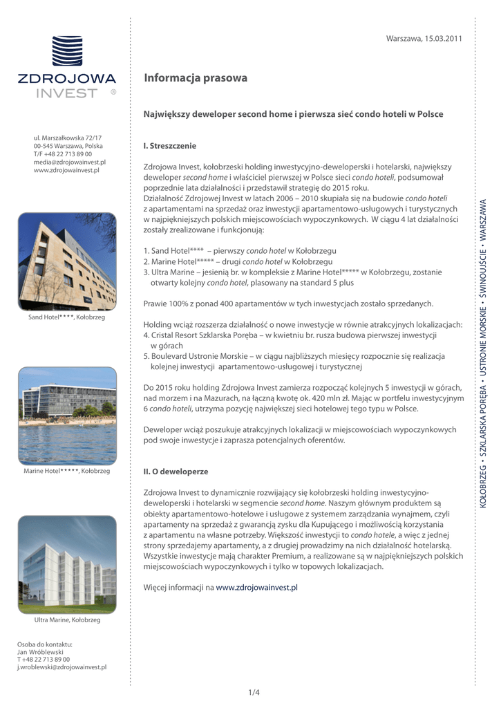 Warszawa, 15.03.2011 Informacja prasowa Największy deweloper second home i pierwsza sieć condo hoteli w Polsce Prawie 100% z ponad 400 apartamentów w tych inwestycjach zostało sprzedanych. Sand Hotel , Kołobrzeg Holding wciąż rozszerza działalność o nowe inwestycje w równie atrakcyjnych lokalizacjach: 4. Cristal Resort Szklarska Poręba – w kwietniu br. rusza budowa pierwszej inwestycji w górach 5. Boulevard Ustronie Morskie – w ciągu najbliższych miesięcy rozpocznie się realizacja kolejnej inwestycji apartamentowo-usługowej i turystycznej Do 2015 roku holding Zdrojowa Invest zamierza rozpocząć kolejnych 5 inwestycji w górach, nad morzem i na Mazurach, na łączną kwotę ok. 420 mln zł. Mając w portfelu inwestycyjnym 6 condo hoteli, utrzyma pozycję największej sieci hotelowej tego typu w Polsce. Deweloper wciąż poszukuje atrakcyjnych lokalizacji w miejscowościach wypoczynkowych pod swoje inwestycje i zaprasza potencjalnych oferentów. Marine Hotel , Kołobrzeg II. O deweloperze Zdrojowa Invest to dynamicznie rozwijający się kołobrzeski holding inwestycyjnodeweloperski i hotelarski w segmencie second home. Naszym głównym produktem są obiekty apartamentowo-hotelowe i usługowe z systemem zarządzania wynajmem, czyli apartamenty na sprzedaż z gwarancją zysku dla Kupującego i możliwością korzystania z apartamentu na własne potrzeby. Większość inwestycji to condo hotele, a więc z jednej strony sprzedajemy apartamenty, a z drugiej prowadzimy na nich działalność hotelarską. Wszystkie inwestycje mają charakter Premium, a realizowane są w najpiękniejszych polskich miejscowościach wypoczynkowych i tylko w topowych lokalizacjach. Więcej informacji na www.zdrojowainvest.pl Ultra Marine, Kołobrzeg Osoba do kontaktu: Jan Wróblewski T +48 22 713 89 00 [email protected] 1/4 ŚWINOUJŚCIE USTRONIE MORSKIE 1. Sand Hotel**** – pierwszy condo hotel w Kołobrzegu 2. Marine Hotel***** – drugi condo hotel w Kołobrzegu 3. Ultra Marine – jesienią br. w kompleksie z Marine Hotel***** w Kołobrzegu, zostanie otwarty kolejny condo hotel, plasowany na standard 5 plus SZKLARSKA PORĘBA Zdrojowa Invest, kołobrzeski holding inwestycyjno-deweloperski i hotelarski, największy deweloper second home i właściciel pierwszej w Polsce sieci condo hoteli, podsumował poprzednie lata działalności i przedstawił strategię do 2015 roku. Działalność Zdrojowej Invest w latach 2006 – 2010 skupiała się na budowie condo hoteli z apartamentami na sprzedaż oraz inwestycji apartamentowo-usługowych i turystycznych w najpiękniejszych polskich miejscowościach wypoczynkowych. W ciągu 4 lat+ działalności zostały zrealizowane i funkcjonują: WARSZAWA I. Streszczenie KOŁOBRZEG ul. Marszałkowska 72/17 00-545 Warszawa, Polska T/F +48 22 713 89 00 [email protected] www.zdrojowainvest.pl III. Całość informacji Zdrojowa Invest, kołobrzeski holding inwestycyjno-deweloperski i hotelarski realizujący apartamenty wakacyjne i condo hotele z apartamentami na sprzedaż w najpiękniejszych polskich miejscowościach wypoczynkowych, podsumował poprzednie lata działalności i przedstawił strategię do 2015 roku. W latach 2006 – 2010 zostały zrealizowane i funkcjonują: Cristal Resort Szklarska Poręba Warto również wspomnieć, że obiekty Marine Hotel***** & Ultra Marine są zlokalizowane 20 m od morza, tuż przy promenadzie i plaży, a ze wszystkich apartamentów rozciąga się wspaniały widok na morze. „Prawie 100% z ponad 400 apartamentów w tych inwestycjach zostało sprzedanych.” - dodaje Jan Wróblewski Holding dynamicznie rozszerza działalność o inwestycje z systemem zarządzania wynajmem, w nowych, równie atrakcyjnych lokalizacjach: 4. Cristal Resort Szklarska Poręba – w kwietniu br. rusza budowa inwestycji apartamentowo-usługowej i turystycznej w górach (60 apartamentów z widokiem na Szrenicę – już w tej chwili sprzedano 50% – zaplecze SPA, sala konferencyjna i narciarnia) Boulevard Ustronie Morskie 5. Boulevard Ustronie Morskie – w ciągu najbliższych miesięcy rozpocznie się realizacja inwestycji apartamentowo-usługowej położonej na klifie o długości ponad 350 m w Ustroniu Morskim (45 apartamentów ze wspaniałym widokiem na morze, 20 lokali usługowych przy promenadzie) W ramach realizacji strategii rozwoju Zdrojowa Invest poszukuje działek w miejscowościach i regionach wypoczynkowych. W kręgu zainteresowania są również nieruchomości zabytkowe, ale jak dodaje Wróblewski: „Specjalizujemy się tylko w najlepszych lokalizacjach.“ Inwestycja w Kudowie-Zdroju Osoba do kontaktu: Jan Wróblewski T +48 22 713 89 00 [email protected] „Do 2015 roku planujemy rozpoczęcie kolejnych 5 inwestycji w górach, nad morzem i na Mazurach, na łączną kwotę ok. 420 mln zł, z czego 3 są już w przygotowaniu. W ten sposób staniemy się największym deweloperem second home w Polsce z łączną liczbą zakończonych i realizowanych 10 inwestycji, z ponad 2000 apartamentami, 300 lokalami użytkowym i 139,7 tys. m² (13,97 ha) powierzchni, na łączną kwotę ok. 670 mln zł. Natomiast z 6 condo hotelami utrzymamy pozycję największej sieci hotelowej tego typu w Polsce. Nie sądzimy, aby potencjalna konkurencja nas prześcignęła zwłaszcza, że dysponujemy już odpowiednim bankiem ziemi pod te inwestycje.” – przekonuje Jan Wróblewski. 2/4 ŚWINOUJŚCIE W ten sposób Zdrojowa Invest stanie się największą siecią condo hoteli w Polsce. „A już teraz z pozostałymi spółkami, które wchodzą w skład holdingu zatrudniamy ponad 250 osób. Jesteśmy jednym z największych pracodawców w Kołobrzegu, największym uzdrowisku w Polsce, chociaż centrala znajduje się w Warszawie” – oświadacza Jan Wróblewski, Członek Zarządu Zdrojowa Invest. USTRONIE MORSKIE 3. Ultra Marine – jesienią br. zostanie otwarty kolejny hotel z widokiem na morze w standardzie ponad 5 gwiazdek – wejdzie on w skład kompleksu Marin