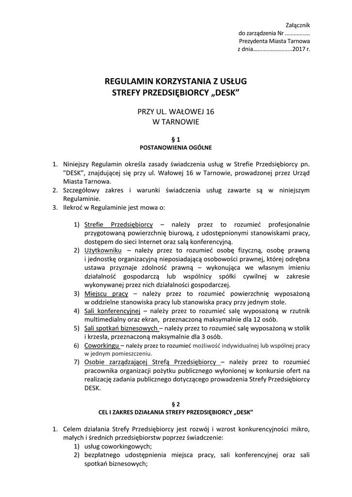 Załącznik do zarządzenia Nr …………….. Prezydenta Miasta Tarnowa z dnia……………………..2017 r. REGULAMIN KORZYSTANIA Z USŁUG STREFY PRZEDSIĘBIORCY „DESK” PRZY UL. WAŁOWEJ 16 W TARNOWIE §1 POSTANOWIENIA OGÓLNE 1. Niniejszy Regulamin określa zasady świadczenia usług w Strefie Przedsiębiorcy pn. "DESK”, znajdującej się przy ul. Wałowej 16 w Tarnowie, prowadzonej przez Urząd Miasta Tarnowa. 2. Szczegółowy zakres i warunki świadczenia usług zawarte są w niniejszym Regulaminie. 3. Ilekroć w Regulaminie jest mowa o: 1) Strefie Przedsiębiorcy – należy przez to rozumieć profesjonalnie przygotowaną powierzchnię biurową, z udostępnionymi stanowiskami pracy, dostępem do sieci Internet oraz salą konferencyjną. 2) Użytkowniku – należy przez to rozumieć osobę fizyczną, osobę prawną i jednostkę organizacyjną nieposiadającą osobowości prawnej, której odrębna ustawa przyznaje zdolność prawną – wykonująca we własnym imieniu działalność gospodarczą lub wspólnicy spółki cywilnej w zakresie wykonywanej przez nich działalności gospodarczej. 3) Miejscu pracy – należy przez to rozumieć powierzchnię wyposażoną w oddzielne stanowiska pracy lub stanowiska pracy przy jednym stole. 4) Sali konferencyjnej – należy przez to rozumieć salę wyposażoną w rzutnik multimedialny oraz ekran, przeznaczoną maksymalnie dla 12 osób. 5) Sali spotkań biznesowych – należy przez to rozumieć salę wyposażoną w stolik i krzesła, przeznaczoną maksymalnie dla 3 osób. 6) Coworkingu – należy przez to rozumieć możliwość indywidualnej lub wspólnej pracy w jednym pomieszczeniu. 7) Osobie zarządzającej Strefą Przedsiębiorcy – należy przez to rozumieć pracownika organizacji pożytku publicznego wyłonionej w konkursie ofert na realizację zadania publicznego dotyczącego prowadzenia Strefy Przedsiębiorcy DESK. §2 CEL I ZAKRES DZIAŁANIA STREFY PRZEDSIĘBIORCY „DESK” 1. Celem działania Strefy Przedsiębiorcy jest rozwój i wzrost konkurencyjności mikro, małych i średnich przedsiębiorstw poprzez świadczenie: 1) usług coworkingowych; 2) bezpłatnego udostępnienia miejsca pracy, sali konferencyjnej oraz sali spotkań biznesowych; 3) umożliwienie nawiązania kontaktów i wymiany doświadczeń biznesowych. 2. Usługi świadczone przez Strefę Przedsiębiorcy realizowane są w sposób bezstronny z zachowaniem należytej staranności. 3. Świadczone usługi są ewidencjonowane na potrzeby statystyczne. Zbieranie i przechowywanie informacji nt. użytkowników korzystających ze Strefy Przedsiębiorcy odbywa się w formie papierowej na specjalnie przygotowanych formularzach oraz w elektronicznej bazie użytkowników. 4. Strefa Przedsiębiorcy nie może pełnić funkcji siedziby firmy. Użytkownik nie może rejestrować działalności gospodarczej po adresem Strefy Przedsiębiorcy, tj. ul. Wałowa 16, 33-100 Tarnów. §3 REJESTRACJA UŻYTKOWNIKA 1. Korzystanie ze Strefy Przedsiębiorcy możliwe jest jedynie po uprzednim dokonaniu rejestracji, która polega na prawidłowym wypełnieniu i podpisaniu formularza rejestracyjnego zawierającego dane firmy, które zostaną zweryfikowane z wpisem do Centralnej Ewidencji i Informacji o Działalności Gospodarczej (CEIDG) lub KRS; okazaniu ważnego dokumentu tożsamości ze zdjęciem (do wglądu); podpisania oświadczenia o zapoznaniu się z Regulaminem Korzystania z Usług Strefy Przedsiębiorcy „DESK”. 2. Wypełnienie formularza rejestracyjnego przez użytkownika oznacza równoczesną akceptację treści Regulaminu. 3. Użytkownik dokonuje rejestracji osobiście. 4. Po zarejestrowaniu użytkownikowi zostaje nadany numer identyfikacyjny. 5. Rejestracja jest jednorazowa i nie zobowiązuje użytkownika do wykupienia jakichkolwiek usług. 6. Nadany numer identyfikacyjny przypisany jest do jednego użytkownika i nie może być wykorzystywany i udostępniany osobom trzecim. §4 DOSTĘP DO MIEJSCA PRACY 1. Aby skorzystać z miejsca pracy użytkownik zobowiązany jest każdorazowo przedstawić nadany numer identyfikacyjny oraz ważny dokument potwierdzający tożsamość. 2. Użytkownik uzyskuje dostęp do miejsca pracy jeżeli jest wolne lub nastąpiła uprzednia rezerwacja miejsca pracy, w danym dniu roboczym. 3. Rezerwacja zostaje anulowana w przypadku 30 minutowego spóźnienia. 4. Z miejsca pracy użytkownik w danym dniu roboczym może korzystać w czasie nie przekraczającym łącznie 4 godzin. 5. Rezerwacji można dokonać osobiście w Strefie Przedsiębiorcy przy ul. Wałowej 16 lub telefonicznie pod numerem telefonu: 14 639-08-75 lub poprzez kalendarz online. 6. Dostęp do Strefy Przedsiębiorcy dotyczy wyłącznie zarejestrowanego użytkownika i osoby trzecie nie mogą z niej korzystać. 7. W przypadku organizowania spotkań biznesowych, szkoleń lub konferencji, użytkownik przedstawia, osobie zarządzającej Strefą Przedsiębiorcy, listę uczestników. §5 DOSTĘPNOŚĆ STREFY PRZEDSIĘBIORCY 1. Strefa Przedsiębiorcy czynna jest od poniedziałku do piątku, w godz. 800 - 2000 (z wyłączeniem dni świątecznych i ustawowo wolnych od pracy). 2. Strefa Przedsiębiorcy, w godzinach otwarcia, zapewnia obsługę recepcyjną, na którą składa się: 1) przyjmowanie rezerwacji i udzielanie informacji o wolnych terminach; 2) pomoc w obsłudze urządzeń biurowych; 3) przyjmowanie i kierowanie użytkowników oraz ich klientów do miejsc pracy, sali konferencyjnej lub sali spotkań biznesowych; 4) udostępnianie akcesoriów biurowych. §6 KORZYSTANIE Z SIECI INTERNET 1. Strefa Przedsiębiorcy zapewnia bezprzewodowy dostęp do Internetu dla każdego użytkownika znajdującego się w miejscu pracy. 2. W Strefie Przedsiębiorcy znajduje się jeden komputer stacjonarny, wyposażony w podstawowy pakiet Open Office, z dostępem do Internetu. 3. Wykorzystywanie łącza do pobierania i/lub udostępniania materiałów niezgodnych z prawem lub nadmierne obciążanie łącza przez