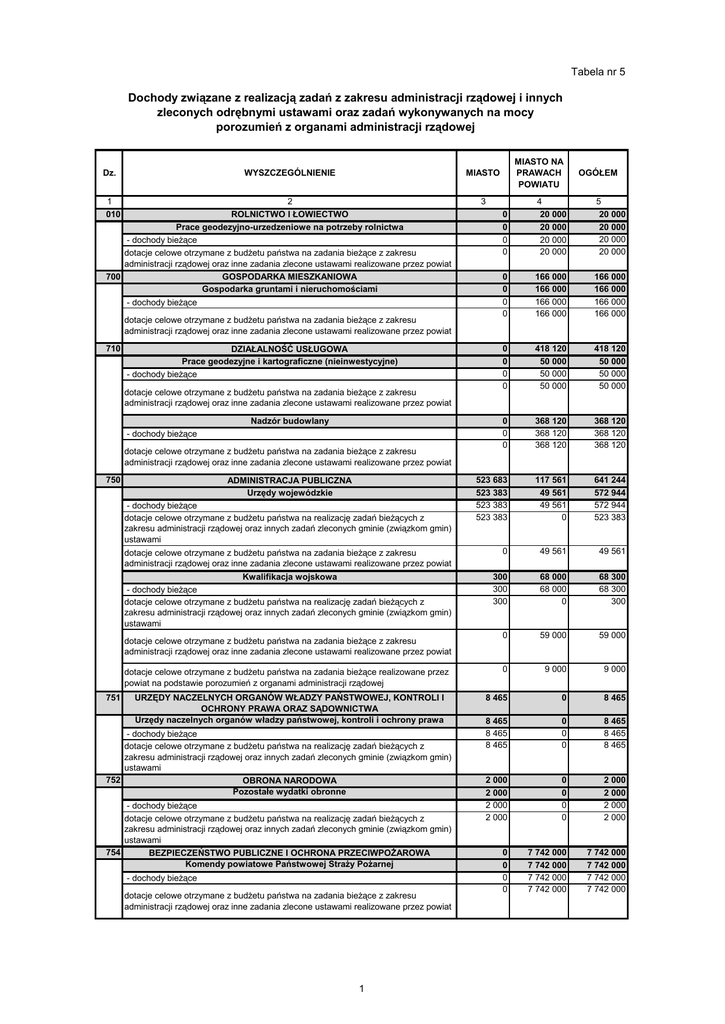 Tabela nr 5 Dochody związane z realizacją zadań z zakresu administracji rządowej i innych zleconych odrębnymi ustawami oraz zadań wykonywanych na mocy porozumień z organami administracji rządowej Dz. WYSZCZEGÓLNIENIE MIASTO 1 010 2 ROLNICTWO I ŁOWIECTWO Prace geodezyjno-urzedzeniowe na potrzeby rolnictwa - dochody bieżące dotacje celowe otrzymane z budżetu państwa na zadania bieżące z zakresu administracji rządowej oraz inne zadania zlecone ustawami realizowane przez powiat 3 700 GOSPODARKA MIESZKANIOWA Gospodarka gruntami i nieruchomościami - dochody bieżące dotacje celowe otrzymane z budżetu państwa na zadania bieżące z zakresu administracji rządowej oraz inne zadania zlecone ustawami realizowane przez powiat 710 DZIAŁALNOŚĆ USŁUGOWA Prace geodezyjne i kartograficzne (nieinwestycyjne) - dochody bieżące dotacje celowe otrzymane z budżetu państwa na zadania bieżące z zakresu administracji rządowej oraz inne zadania zlecone ustawami realizowane przez powiat Nadzór budowlany - dochody bieżące dotacje celowe otrzymane z budżetu państwa na zadania bieżące z zakresu administracji rządowej oraz inne zadania zlecone ustawami realizowane przez powiat 750 ADMINISTRACJA PUBLICZNA Urzędy wojewódzkie - dochody bieżące dotacje celowe otrzymane z budżetu państwa na realizację zadań bieżących z zakresu administracji rządowej oraz innych zadań zleconych gminie (związkom gmin) ustawami dotacje celowe otrzymane z budżetu państwa na zadania bieżące z zakresu administracji rządowej oraz inne zadania zlecone ustawami realizowane przez powiat Kwalifikacja wojskowa - dochody bieżące dotacje celowe otrzymane z budżetu państwa na realizację zadań bieżących z zakresu administracji rządowej oraz innych zadań zleconych gminie (związkom gmin) ustawami dotacje celowe otrzymane z budżetu państwa na zadania bieżące z zakresu administracji rządowej oraz inne zadania zlecone ustawami realizowane przez powiat dotacje celowe otrzymane z budżetu państwa na zadania bieżące realizowane przez powiat na podstawie porozumień z organami administracji rządowej 751 URZĘDY NACZELNYCH ORGANÓW WŁADZY PAŃSTWOWEJ, KONTROLI I OCHRONY PRAWA ORAZ SĄDOWNICTWA Urzędy naczelnych organów władzy państwowej, kontroli i ochrony prawa - dochody bieżące dotacje celowe otrzymane z budżetu państwa na realizację zadań bieżących z zakresu administracji rządowej oraz innych zadań zleconych gminie (związkom gmin) ustawami 752 OBRONA NARODOWA Pozostałe wydatki obronne - dochody bieżące dotacje celowe otrzymane z budżetu państwa na realizację zadań bieżących z zakresu administracji rządowej oraz innych zadań zleconych gminie (związkom gmin) ustawami 754 BEZPIECZEŃSTWO PUBLICZNE I OCHRONA PRZECIWPOŻAROWA Komendy powiatowe Państwowej Straży Pożarnej - dochody bieżące dotacje celowe otrzymane z budżetu państwa na zadania bieżące z zakresu administracji rządowej oraz inne zadania zlecone ustawami realizowane przez powiat 1 MIASTO NA PRAWACH POWIATU OGÓŁEM 0 0 0 0 4 20 000 20 000 20 000 20 000 5 20 000 20 000 20 000 20 000 0 0 0 0 166 000 166 000 166 000 166 000 166 000 166 000 166 000 166 000 0 0 0 0 418 120 50 000 50 000 50 000 418 120 50 000 50 000 50 000 0 0 0 368 120 368 120 368 120 368 120 368 120 368 120 523 683 523 383 523 383 523 383 117 561 49 561 49 561 0 641 244 572 944 572 944 523 383 0 49 561 49 561 300 300 300 68 000 68 000 0 68 300 68 300 300 0 59 000 59 000 0 9 000 9 000 8 465 0 8 465 8 465 8 465 8 465 0 0 0 8 465 8 465 8 465 2 000 2 000 2 000 2 000 0 0 0 0 2 000 2 000 2 000 2 000 0 0 0 0 7 742 000 7 742 000 7 742 000 7 742 000 7 742 000 7 742 000 7 742 000 7 742 000 851 OCHRONA ZDROWIA Składki na ubezpieczenie zdrowotne oraz świadczenia dla osób nieobjętych obowiązkiem ubezpieczenia zdrowotnego - dochody bieżące dotacje celowe otrzymane z budżetu państwa na zadania bieżące z zakresu administracji rządowej oraz inne zadania zlecone ustawami realizowane przez powiat 852 POMOC SPOŁECZNA Ośrodki wsparcia - dochody bieżące dotacje celowe otrzymane z budżetu państwa na realizację zadań bieżących z zakresu administracji rządowej oraz innych zadań zleconych gminie (związkom gmin) ustawami Świadczenia rodzinne, świadczenia z funduszu alimentacyjnego oraz składki na ubezpieczenia emerytalne i rentowe z ubezpieczenia społecznego - dochody bieżące dotacje celowe otrzymane z budżetu państwa na realizację zadań bieżących z zakresu administracji rządowej oraz innych zadań zleconych gminie (związkom gmin) ustawami Składki na ubezpieczenie zdrowotne opłacane za osoby pobierające niektóre świadczenia z pomocy społecznej, niektóre świadczenia rodzinne oraz za osoby uczestniczące w zajęciach w centrum integracji społecznej - dochody bieżące dotacje celowe otrzymane z budżetu państwa na realizację zadań bieżących z zakresu administracji rządowej oraz innych zadań zleconych gminie (związkom gmin) ustawami Ośrodki pomocy społecznej - dochody bieżące dotacje celowe otrzymane z budżetu państwa na realizację zadań bieżących z zakresu administracji rządowej oraz innych zadań zleconych gminie (związkom gmin) ustawami Usługi opiekuńcze i specjalistyczne usługi opiekuńcze - dochody bieżące dotacje celowe otrzymane z budżetu państwa na realizację zadań bieżących z zakresu administracji rządowej oraz innych zadań zleconych gminie (związkom gmin) ustawami 853 POZOSTAŁE ZADANIA W ZAKRESIE POLITYKI SPOŁECZNEJ Zespoły do spraw orzekania o niepełnosprawności - dochody bieżące dotacje celowe otrzymane z budżetu państwa na zadania bieżące z zakresu administracji rządowej oraz inne zadania zlecone ustawami realizowane przez powiat OGÓŁEM 2 0 0 11 200 11 200 11 200 11 200 0 0 11 200 11 200 11 200 11 200 11 206 000 673 200 673 200 673 200 0 0 0 0 11 206 000 673 200 673 200 673 200 10 388 400 0 10 388 400 10 388 400 10 388 400 0 0 10 388 400 10 388 400 38 