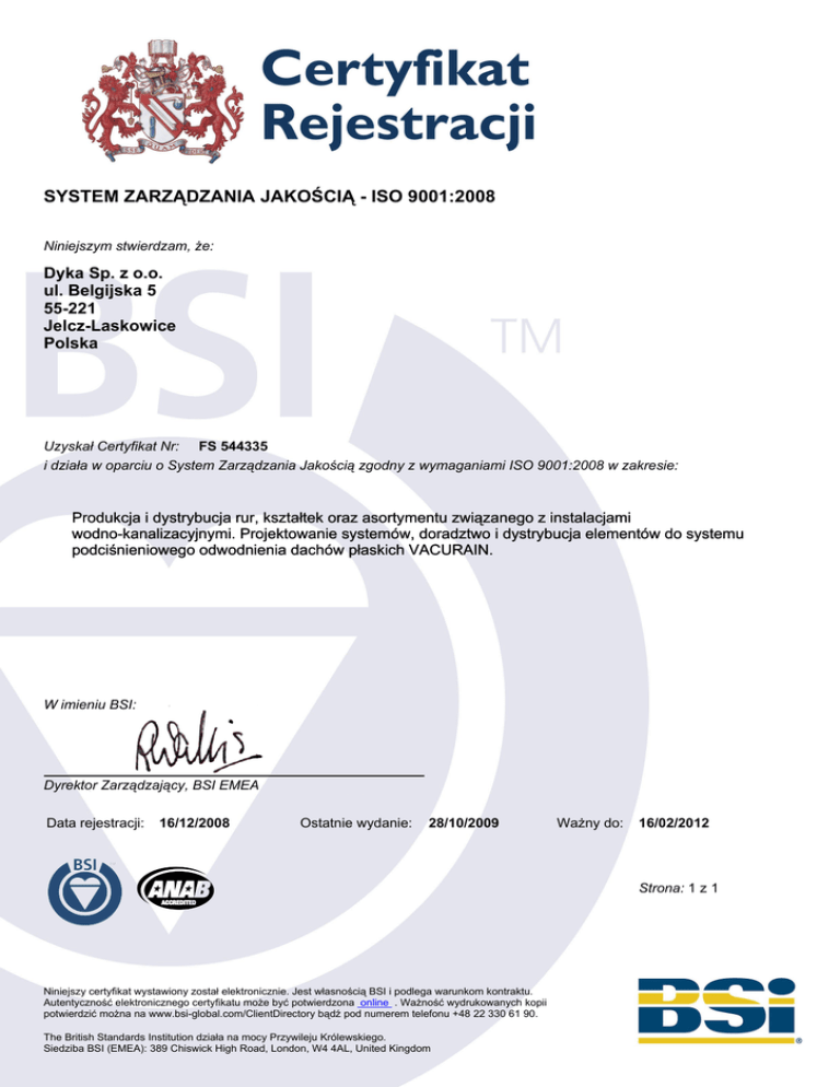 SYSTEM ZARZĄDZANIA JAKOŚCIĄ - ISO 9001:2008 Niniejszym stwierdzam, że: Dyka Sp. z o.o. ul. Belgijska 5 55-221 Jelcz-Laskowice Polska Uzyskał Certyfikat Nr: FS 544335 i działa w oparciu o System Zarządzania Jakością zgodny z wymaganiami ISO 9001:2008 w zakresie: Produkcja i dystrybucja rur, kształtek oraz asortymentu związanego z instalacjami wodno-kanalizacyjnymi. Projektowanie systemów, doradztwo i dystrybucja elementów do systemu podciśnieniowego odwodnienia dachów płaskich VACURAIN. W imieniu BSI: Dyrektor Zarządzający, BSI EMEA Data rejestracji: 16/12/2008 Ostatnie wydanie: 28/10/2009 Ważny do: 16/02/2012 Strona: 1 z 1 Niniejszy certyfikat wystawiony został elektronicznie. Jest własnością BSI i podlega warunkom kontraktu. Autentyczność elektronicznego certyfikatu może być potwierdzona online . Ważność wydrukowanych kopii potwierdzić można na www.bsi-global.com/ClientDirectory bądź pod numerem telefonu +48 22 330 61 90. The British Standards Institution działa na mocy Przywileju Królewskiego. Siedziba BSI (EMEA): 389 Chiswick High Road, London, W4 4AL, United Kingdom