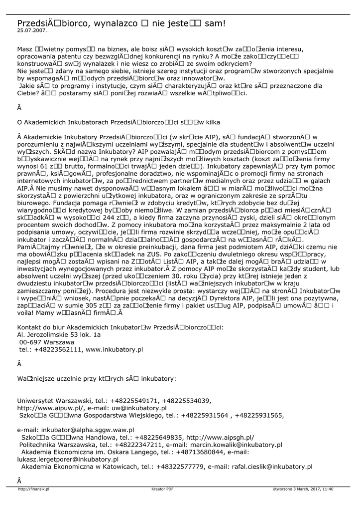 PrzedsiÄ™biorco, wynalazco nie jesteÅ› sam! 25.07.2007. Masz Å›wietny pomysÅ‚ na biznes, ale boisz siÄ™ wysokich kosztÃłw zaÅ‚oÅźenia interesu, opracowania patentu czy bezwzglÄ™dnej konkurencji na rynku? A moÅźe zakoÅ„czyÅ‚eÅ› konstruować swÃłj wynalazek i nie wiesz co zrobić ze swoim odkryciem? Nie jesteÅ› zdany na samego siebie, istnieje szereg instytucji oraz programÃłw stworzonych specjalnie by wspomagać mÅ‚odych przedsiÄ™biorcÃłw oraz innowatorÃłw. Jakie sÄ… to programy i instytucje, czym siÄ™ charakteryzujÄ… oraz ktÃłre sÄ… przeznaczone dla Ciebie? – postaramy siÄ™ poniÅźej rozwiać wszelkie wÄ…tpliwoÅ›ci.  O Akademickich Inkubatorach PrzedsiÄ™biorczoÅ›ci sÅ‚Ãłw kilka  Akademickie Inkubatory PrzedsiÄ™biorczoÅ›ci (w skrÃłcie AIP), sÄ… fundacjÄ… stworzonÄ… w porozumieniu z najwiÄ™kszymi uczelniami wyÅźszymi, specjalnie dla studentÃłw i absolwentÃłw uczelni wyÅźszych. SkÄ…d nazwa Inkubatory? AIP pozwalajÄ… mÅ‚odym przedsiÄ™biorcom z pomysÅ‚em bÅ‚yskawicznie wejść na rynek przy najniÅźszych moÅźliwych kosztach (koszt zaÅ‚oÅźenia firmy wynosi 61 zÅ‚ brutto, formalnoÅ›ci trwajÄ… jeden dzieÅ„). Inkubatory zapewniajÄ… przy tym pomoc prawnÄ…, ksiÄ™gowÄ…, profesjonalne doradztwo, nie wspominajÄ…c o promocji firmy na stronach internetowych inkubatorÃłw, za poÅ›rednictwem partnerÃłw medialnych oraz przez udziaÅ‚ w galach AIP. Nie musimy nawet dysponować wÅ‚asnym lokalem – w miarÄ™ moÅźliwoÅ›ci moÅźna skorzystać z powierzchni uÅźytkowej inkubatora, oraz w ograniczonym zakresie ze sprzÄ™tu biurowego. Fundacja pomaga rÃłwnieÅź w zdobyciu kredytÃłw, ktÃłrych zdobycie bez duÅźej wiarygodnoÅ›ci kredytowej byÅ‚oby niemoÅźliwe. W zamian przedsiÄ™biorca pÅ‚aci miesiÄ™cznÄ… skÅ‚adkÄ™ w wysokoÅ›ci 244 zÅ‚, a kiedy firma zaczyna przynosić zyski, dzieli siÄ™ okreÅ›lonym procentem swoich dochodÃłw. Z pomocy inkubatora moÅźna korzystać przez maksymalnie 2 lata od podpisania umowy, oczywiÅ›cie, jeÅ›li firma rozwinie skrzydÅ‚a wczeÅ›niej, moÅźe opuÅ›cić inkubator i zacząć normalnÄ… dziaÅ‚alność gospodarczÄ… na wÅ‚asnÄ… rÄ™kÄ™. PamiÄ™tajmy rÃłwnieÅź, Åźe w okresie preinkubacji, dana firma jest podmiotem AIP, dziÄ™ki czemu nie ma obowiÄ…zku pÅ‚acenia skÅ‚adek na ZUS. Po zakoÅ„czeniu dwuletniego okresu wspÃłÅ‚pracy, najlepsi mogÄ… zostać wpisani na ZÅ‚otÄ… ListÄ™ AIP, a takÅźe dalej mogÄ… brać udziaÅ‚ w inwestycjach wynegocjowanych przez inkubator. Z pomocy AIP moÅźe skorzystać kaÅźdy student, lub absolwent uczelni wyÅźszej (przed ukoÅ„czeniem 30. roku Åźycia) przy ktÃłrej istnieje jeden z dwudziestu inkubatorÃłw przedsiÄ™biorczoÅ›ci (listÄ™ waÅźniejszych inkubatorÃłw w kraju zamieszczamy poniÅźej). Procedura jest niezwykle prosta: wystarczy wejść na stronÄ™ InkubatorÃłw i wypeÅ‚nić wniosek, nastÄ™pnie poczekać na decyzjÄ™ Dyrektora AIP, jeÅ›li jest ona pozytywna, zapÅ‚acić w sumie 305 zÅ‚ za zaÅ‚oÅźenie firmy i pakiet usÅ‚ug AIP, podpisać umowÄ™ – i voila! Mamy wÅ‚asnÄ… firmÄ™. Kontakt do biur Akademickich InkubatorÃłw PrzedsiÄ™biorczoÅ›ci: Al. Jerozolimskie 53 lok. 1a 00-697 Warszawa tel.: +48223562111, www.inkubatory.pl  WaÅźniejsze uczelnie przy ktÃłrych sÄ… inkubatory: Uniwersytet Warszawski, tel.: +48225549171, +48225534039, http://www.aipuw.pl/, e-mail: [email protected] SzkoÅ‚a GÅ‚Ãłwna Gospodarstwa Wiejskiego, tel.: +48225931564 , +48225931565, e-mail: [email protected] SzkoÅ‚a GÅ‚Ãłwna Handlowa, tel.: +48225649835, http://www.aipsgh.pl/ Politechnika Warszawska, tel.: +48222347211, e-mail: [email protected] Akademia Ekonomiczna im. Oskara Langego, tel.: +48713680844, e-mail: [email protected] Akademia Ekonomiczna w Katowicach, tel.: +48322577779, e-mail: [email protected]  http://finansik.pl Kreator PDF Utworzono 3 March, 2017, 11:40 PeÅ‚nÄ… listÄ™ inkubatorÃłw moÅźna znaleźć tutaj.  Innowacja w cenie – czyli programy MNiSW  PrzedsiÄ™biorstwa celujÄ…ce w innowacyjne technologie i produkty, a takÅźe wyÅźsze uczelnie i Jednostki Badawczo-Rozwojowe (w skrÃłcie JBR-y), znajdÄ… coÅ› dla siebie wÅ›rÃłd oferty Ministerstwa Nauki i Szkolnictwa WyÅźszego. Obecnie w trakcie realizacji sÄ… trzy gÅ‚Ãłwne programy Ministerstwa: flagowa Inicjatywa Technologiczna, Kreator InnowacyjnoÅ›ci, oraz Patent Plus. Inicjatywa Technologiczna, to obecnie najwaÅźniejszy program MNiSW, majÄ…cy wspierać rozwÃłj innowacyjnej, polskiej gospodarki. To nie tylko Å‚adnie brzmiÄ…ce sÅ‚owa, pierwszy nabÃłr zostaÅ‚ juÅź zakoÅ„czony i pierwsza pula przedsiÄ™biorcÃłw oraz JBR-Ãłw otrzymaÅ‚a niebagatelne pieniÄ…dze – dla przypomnienia, tylko BranÅźowy OÅ›rodek Badawczo-Rozwojowy Maszyn Elektrycznych KOMEL w Katowicach otrzymaÅ‚ ponad 1,26 mln zÅ‚, bliÅźej zainteresowanych zapraszamy do przeczytania informacji z uroczystego wrÄ™czenia pierwszych Å›rodkÃłw, ktÃłre odbyÅ‚o siÄ™ 12 czerwca. Kolejny nabÃłr rozpocznie siÄ™ niestety pÃłÅºniej niÅź planowano – ministerstwo planuje ogÅ‚osić drugÄ… turÄ™ dopiero w drugiej poÅ‚owie sierpnia. Wnioski bÄ™dzie moÅźna skÅ‚adać przez specjalnie przygotowany system na stronie: https://osf.opi.org.pl/OSF/. Niestety, strona internetowa MNiSW nie uÅ‚atwia znalezienia konkretnych informacji o Inicjatywie Technologicznej, w zwiÄ…zku z czym warto przeczytać dokument odpowiadajÄ…cy na najczęściej zadawane pytania. Dwa pozostaÅ‚e programy, sÄ… skierowane juÅź do wyspecjalizowanych instytucji. Kreator InnowacyjnoÅ›ci, to w skrÃłcie program skierowany gÅ‚Ãłwni