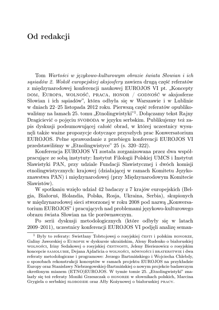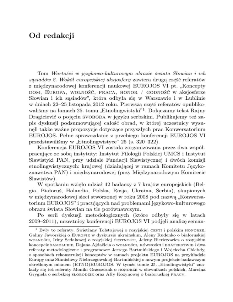 Od redakcji Tom Wartości w językowo-kulturowym obrazie świata Słowian i ich sąsiadów 2. Wokół europejskiej aksjosfery zawiera drugą część referatów z międzynarodowej konferencji naukowej EUROJOS VI pt. „Koncepty dom, Europa, wolność, praca, honor / godność w aksjosferze Słowian i ich sąsiadów”, która odbyła się w Warszawie i w Lublinie w dniach 22–25 listopada 2012 roku. Pierwszą część referatów opublikowaliśmy na łamach 25. tomu „Etnolingwistyki” 1 . Dołączamy tekst Rajny Dragiciević o pojęciu svoboda w języku serbskim. Publikujemy też zapis dyskusji podsumowującej całość obrad, w której uczestnicy wysunęli także ważne propozycje dotyczące przyszłych prac Konwersatorium EUROJOS. Pełne sprawozdanie z przebiegu konferencji EUROJOS VI przedstawiliśmy w „Etnolingwistyce” 25 (s. 320–322). Konferencja EUROJOS VI została zorganizowana przez dwa współpracujące ze sobą instytuty: Instytut Filologii Polskiej UMCS i Instytut Slawistyki PAN, przy udziale Fundacji Slawistycznej i dwóch komisji etnolingwistycznych: krajowej (działającej w ramach Komitetu Językoznawstwa PAN) i międzynarodowej (przy Międzynarodowym Komitecie Slawistów). W spotkaniu wzięło udział 42 badaczy z 7 krajów europejskich (Belgia, Białoruś, Holandia, Polska, Rosja, Ukraina, Serbia), skupionych w międzynarodowej sieci stworzonej w roku 2008 pod nazwą „Konwersatorium EUROJOS” i pracujących nad problemami językowo-kulturowego obrazu świata Słowian na tle porównawczym. Po serii dyskusji metodologicznych (które odbyły się w latach 2009–2011), uczestnicy konferencji EUROJOS VI podjęli analizę seman1 Były to referaty: Swietłany Tołstojowej o rosyjskiej česti i polskim honorze, Galiny Jaworskiej o Europie w dyskursie ukraińskim, Aleny Rudenko o białoruskiej wolności, Iriny Sedakowej o rosyjskiej čestnosti, Jeleny Bieriezowicz o rosyjskim koncepcie samolubie, Dejana Ajdačicia o wolności, równości i braterstwie i dwa referaty metodologiczne i programowe: Jerzego Bartmińskiego i Wojciecha Chlebdy, o sposobach rekonstrukcji konceptów w ramach projektu EUROJOS na przykładzie Europy oraz Stanisławy Niebrzegowskiej-Bartmińskiej o nowym projekcie badawczym określonym mianem (ETNO)EUROJOS. W tymże tomie 25. „Etnolingwistyki” znalazły się też referaty Moniki Grzeszczak o honorze w słownikach polskich, Marcina Grygiela o serbskiej słobodzie oraz Ałły Kożynowej o białoruskiej pracy. 10 Od redakcji tyki wybranych pojęć aksjologicznych w różnych językach słowiańskich, z intencją ich komparacji i diagnozowania różnic międzykulturowych. Teksty publikowane w tym tomie stanowią wyniki badań na pierwszym etapie prac przygotowywanego w Instytucie Slawistyki PAN Leksykonu aksjologicznego Słowian i ich sąsiadów (LASiS). Prace są finansowane z grantu NPRH w ramach projektu 12H12018281, którego realizację organizacyjnie wspiera Instytut Slawistyki PAN. Przypomnijmy na koniec, że tom niniejszy jest szóstą pozycją aksjologiczną przygotowaną przez zespół lubelskich etnolingwistów we współpracy z badaczami z kilku ośrodków polskich i zagranicznych. Ukazały się dotąd: w ramach „czerwonej serii” Instytutu Filologii Polskiej UMCS – – Nazwy wartości. Studia leksykalno-semantyczne (1993), – Język w kręgu wartości (2003), – Wartości w językowo-kulturowym obrazie świata Słowian i ich sąsiadów – 1 (2012); poza tą serią także tomy: – Pojęcie ojczyzny we współczesnych językach europejskich (1993), – Język, wartości, polityka. Raport z badań empirycznych (2006).