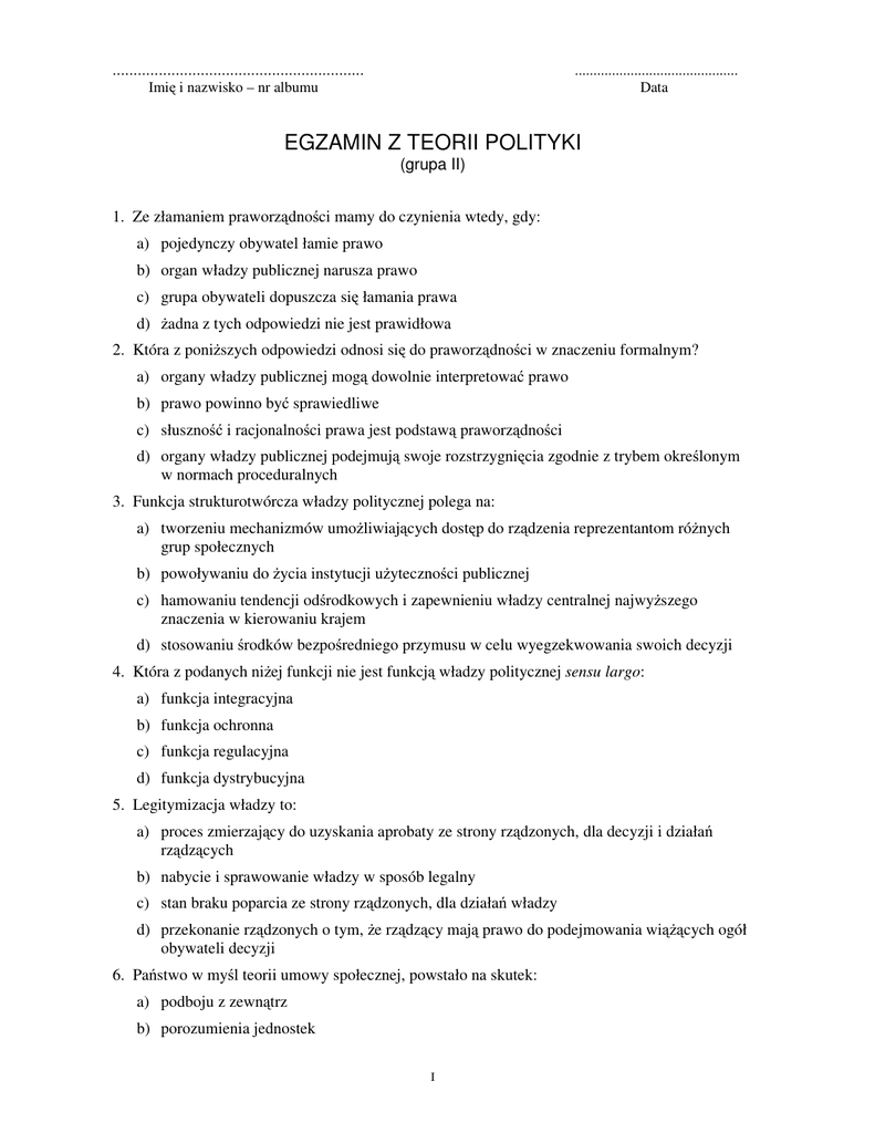 ............................................................ ............................................ Data Imi i nazwisko – nr albumu EGZAMIN Z TEORII POLITYKI (grupa II) 1. Ze złamaniem praworz dno ci mamy do czynienia wtedy, gdy: a) pojedynczy obywatel łamie prawo b) organ władzy publicznej narusza prawo c) grupa obywateli dopuszcza si łamania prawa d) adna z tych odpowiedzi nie jest prawidłowa 2. Która z poni szych odpowiedzi odnosi si do praworz dno ci w znaczeniu formalnym? a) organy władzy publicznej mog dowolnie interpretowa prawo b) prawo powinno by sprawiedliwe c) słuszno i racjonalno ci prawa jest podstaw praworz dno ci d) organy władzy publicznej podejmuj swoje rozstrzygni cia zgodnie z trybem okre lonym w normach proceduralnych 3. Funkcja strukturotwórcza władzy politycznej polega na: a) tworzeniu mechanizmów umo liwiaj cych dost p do rz dzenia reprezentantom ró nych grup społecznych b) powoływaniu do ycia instytucji u yteczno ci publicznej c) hamowaniu tendencji od rodkowych i zapewnieniu władzy centralnej najwy szego znaczenia w kierowaniu krajem d) stosowaniu rodków bezpo redniego przymusu w celu wyegzekwowania swoich decyzji 4. Która z podanych ni ej funkcji nie jest funkcj władzy politycznej sensu largo: a) funkcja integracyjna b) funkcja ochronna c) funkcja regulacyjna d) funkcja dystrybucyjna 5. Legitymizacja władzy to: a) proces zmierzaj cy do uzyskania aprobaty ze strony rz dzonych, dla decyzji i działa rz dz cych b) nabycie i sprawowanie władzy w sposób legalny c) stan braku poparcia ze strony rz dzonych, dla działa władzy d) przekonanie rz dzonych o tym, e rz dz cy maj prawo do podejmowania wi obywateli decyzji 6. Pa stwo w my l teorii umowy społecznej, powstało na skutek: a) podboju z zewn trz b) porozumienia jednostek I cych ogół c) ł czenia rodów w wi ksze cało ci d) pojawienia si własno ci 7. Który z podanych ni ej twórców wi zali powstanie pa stwa z podbojem: a) Ludwik Gumplowicz b) Jan Jakub Rousseau c) Fryderyk Engels d) Robert Filmer 8. Pa stwo (wg Jellinka) definiowane jest za pomoc trzech elementów, jakich? a) ..................................... b) ..................................... c) ......................................... 9. Które z poni szych twierdze odnosi si do systemu parlamentarno-gabinetowego: a) rz d bez poparcia parlamentu nie mo e funkcjonowa b) posłowie wybierani s przez komitety c) najwy sza władza pa stwowa nale y do parlamentu d) prezydent jest odpowiedzialny politycznie przed parlamentem. 10. Która z poni szych charakterystyk opisuje system prezydencki? a) prezydent jest naczelnym dowódc sił zbrojnych b) szef rz du odpowiada przed prezydentem c) prezydent jest politycznie odpowiedzialny przed parlamentem d) prezydent mo e rozwi za parlament 11. Cech systemu półprezydenckiego NIE jest a) wybór głowy pa stwa przez parlament b) prawo wetowania ustaw przez głow pa stwa c) odpowiedzialno d) dwuizbowo rz du przed głow pa stwa parlamentu 12. Decyzja taktyczna, to decyzja: a) dotycz ca bie cej regulacji drobnych spraw b) zmierzaj ca do realizacji bie cych celów ogólnych c) dotycz ca realizacji spraw o znaczeniu długoterminowym d) adna z powy szych odpowiedzi nie jest prawidłowa 13. Decyzja polityczna to: a) akt nielosowego wyboru działania politycznego b) akt wyboru działania lub zaniechania politycznego c) akt nielosowego wyboru zaniechania politycznego d) akt nielosowego wyboru działania lub zaniechania politycznego II 14. Implementacja to: a) proces wprowadzania w ycie decyzji, za pomoc okre lonych rodków i metod b) przebieg regularnie nast puj cych po sobie faktów politycznych c) system zmiennych niezale nych skłaniaj cych decydentów do podj cia działa d) mechanizm podejmowania decyzji politycznych 15. Zmiana polityczna o charakterze legalnym to: a) rewolucja b) pucz c) zamach stanu d) reforma 16. Przymusowo pa stwa polega na: a) mo liwo ci legalnego i trwałego stosowania siły b) wyst powaniu powi za hierarchicznych w obr bie organizacji pa stwowych c) przypisaniu jednostki z mocy prawa i bez jej zgody do okre lonego pa stwa d) adna z tych odpowiedzi 17. Wymie typy kultury politycznej wg G. Alomnda i S. Verby: a) ..................................... b) ..................................... c) ..................................... 18. Zamach stanu to: a) stopniowa zmiana istniej cej rzeczywisto ci, kontrolowana przez grup rz dz c , nie naruszaj ca ram instytucjonalnych ustroju politycznego i społecznego b) to gwałtowna zmiana polityczna, która jest dziełem ludzi z aparatu władzy lub samych panuj cych c) powolne przekształcenie systemu politycznego lub jego pojedynczych elementów d) nagła i bezprawna zmiana ustroju pa stwa lub grupy rz dz cej, nios ca za sob szereg modyfikacji o charakterze prawno-instytucjonalnym 19. Rz dzenie to: a) sprawowanie władzy w sposób legalny b) działania na rzecz i dla dobra pa stwa c) stosowanie trwałego i instytucjonalnego przymusu w celu zmuszenia podmiotów podporz dkowanych do okre lonego zachowania si d) wykonywanie władzy pa stwowej, a wi c proces podejmowania decyzji i ich realizacja za pomoc aparatu pa stwowego 20. Ostatnim etapem ka dego procesu decyzyjnego jest: a) zbieranie informacji dotycz cych danego problemu oraz warunków i mo liwych sposobów jego rozwi zania b) selekcja informacji dokonywana przez poszczególne ogniwa, po rednicz ce pomi dzy społecze stwem a o rodkiem decyzyjnym III c) pojawienie si sygnału o nie zaspokojonych potrzebach społecznych d) realizacja podj tej decyzji 21. Podejmowanie decyzji politycznej w warunkach ryzyka oznacza, e: a) o rodek decyzyjny dysponuje informacjami wystarczaj cymi do podj cia jednoznacznej decyzji b) o rodek decyzyjny dysponuje niepełnymi informacjami co do ewentualnych skutków swoich decyzji c) decydent jest pewny skutków czynno ci, jakie mog by przez niego podj te d) informacje dost pne o rodkowi decyzyjnemu s szcz tkowe a niebezpiecze stwo decyzyjne jest du 
