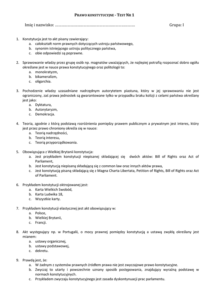 PRAWO KONSTYTUCYJNE - TEST NR 1 Imię i nazwisko: …………………………………………………………………. Grupa: I 1. Konstytucja jest to akt pisany zawierający: a. całokształt norm prawnych dotyczących ustroju paostwowego, b. synonim istniejącego ustroju politycznego paostwa, c. obie odpowiedzi są poprawne. 2. Sprawowanie władzy przez grupę osób np. magnatów uważających, że najlepiej potrafią rozpoznad dobro ogółu określane jest w nauce prawa konstytucyjnego oraz politologii to: a. monokratyzm, b. bikameralizm, c. oligarchia. 3. Pochodzenie władzy uzasadniane nadrzędnym autorytetem piastuna, który w jej sprawowaniu nie jest ograniczony, zaś prawa jednostek są gwarantowane tylko w przypadku braku kolizji z celami paostwa określany jest jako: a. Dyktatura, b. Autorytaryzm, c. Demokracja. 4. Teoria, zgodnie z którą podstawą rozróżnienia pomiędzy prawem publicznym a prywatnym jest interes, który jest przez prawo chroniony określa się w nauce: a. Teorią nadrzędności, b. Teorią interesu, c. Teorią przyporządkowania. 5. Obowiązująca z Wielkiej Brytanii konstytucja: a. Jest przykładem konstytucji niepisanej składającej się dwóch aktów: Bill of Rights oraz Act of Parliament, b. Jest konstytucją niepisaną składającą się z common law oraz innych aktów prawa, c. Jest konstytucją pisaną składającą się z Magna Charta Libertata, Petition of Rights, Bill of Rights oraz Act of Parliament. 6. Przykładem konstytucji oktrojowanej jest: a. Karta Wielkich Swobód, b. Karta Ludwika 18, c. Wszystkie karty. 7. Przykładem konstytucji elastycznej jest akt obowiązujący w: a. Polsce, b. Wielkiej Brytanii, c. Francji. 8. Akt występujący np. w Portugalii, o mocy prawnej pomiędzy konstytucją a ustawą zwykłą określany jest mianem: a. ustawy organicznej, b. ustawy podstawowej, c. dekretu. 9. Prawdą jest, że: a. W żadnym z systemów prawnych źródłem prawa nie jest zwyczajowe prawo konstytucyjne. b. Zwyczaj to utarty i powszechnie uznany sposób postępowania, znajdujący wyraźną podstawę w normach konstytucyjnych. c. Przykładem zwyczaju konstytucyjnego jest zasada dyskontynuacji prac parlamentu. 10. Zasada incompatibilitas związana jest z: a. Niemożnością łączenia funkcji w organach władzy, b. Niemożnością wykonywania określonych zadao przedmiotowych c. Niemożnością realizacji zadao paostwa. 11. Do podstawowych elementów demokratycznego paostwa prawnego zalicza się: a. dwupodział władzy i prymat ustawy, b. zasada retroakcji i ingerencji w sferę wolności, c. zakaz ingerencji w sferę własności jednostki oraz sądowa kontrola władzy wykonawczej. 12. Fikcja personifikacyjna przejawia się w tym, że: a. Władza w paostwie przysługuje bezpośrednio obywatelom RP. b. Wszyscy mają takie same, tzn. równe prawa w przedmiocie sprawowania władzy, w każdym pionie działania administracji. c. Władza najwyższa znajduje się w rękach narodu jako wspólnoty tworzonej przez wszystkich obywateli. 13. Reprezentantem narodu, zgodnie z Konstytucją z 1997 r., jest: a. Sejm, Senat oraz Prezydent, b. Rada Ministrów, Sejm, Senat i Prezydent, c. Parlament, to jest Sejm i Senat. 14. Porównanie Sejmu i Senatu pozwala stwierdzid, że: a. Wyraźnie zakresie się odmienny zakres kompetencji poszczególnych izb. b. Występuje identyczny sposób ustalania składu izb. c. Odnotowad można tożsamy zakres przedmiotowego działania izb. 15. Z punktu widzenia procesu ustawodawczego dwuizbowośd możemy podzielid na: a. egalitarną, b. dyferencjonalną, c. subelitarną. 16. Na prawidłowe ukształtowanie się zasady niezawisłości i odrębności sądów miało wpływ m.in.: a. utworzenie sądów apelacyjnych oraz nieodwoływalnośd sędziów, b. likwidacja kolegiów ds. wykroczeo oraz utworzenie paostwowego arbitrażu, c. sądowa kontrola legalności decyzji i likwidacja KRS. 17. Hierarchiczne podporządkowanie jednostki niższego rzędu organom wyższego stopnia oraz brak samodzielności organów niższych charakterystyczne jest dla: a. zjawiska Centralizacji, b. koncentracji rzeczowej i terytorialnej, c. dekoncentracji terytorialnej i rzeczowej. 18. Do warunków decentralizacji nie zalicza się: a. Braku samodzielności finansowej jednostek niższego szczebla b. Niemożności wpływu organu wyższego stopnia na obsadę personalną, c. Możliwości samodzielnego określenia przez organ niższego stopnia własnej struktury organizacyjnej. 19. Kategoria praw podstawowych służących zapewnieniu obywatelom sfery wolnej od ingerencji paostwa to: a. prawa obywatelskie, b. wolności obywatelskie c. prawa podmiotowe. 20. Zakaz kary śmierci w czasie pokoju wprowadzony został do Europejskiej Konwencji o Ochronie Praw Człowieka i Podstawowych Wolnościach: a. Protokołem 7 w roku 1984, b. Protokołem 12 w roku 2001, c. Protokołem 33 w roku 1973. 21. Przed wniesieniem skargi do Trybunału niezbędnym jest uprzednie: a. Wyczerpanie większości krajowych środków odwoławczych, b. Wyczerpanie wszystkich krajowych środków odwoławczych bez skargi kasacyjnej. c. Wyczerpanie wszystkich krajowych środków odwoławczych ze skargą kasacyjną. 22. Zasada ratione temporis wskazuje na: a. Rozsądny termin rozstrzygnięcia sprawy przez Trybunał, b. Ograniczenie kognicji Trybunału ze względu na czas powstania zdarzenia, c. Obliguje Trybunał do rozstrzygnięcia wyłącznie spraw złożonych w terminie. 23. Zgodnie z Konstytucją RP każdy zatrzymany powinien byd zwolniony w ciągu maksymalnie: a. 24 godzin od chwili zatrzymania, b. 48 godzin od chwili zatrzymania, c. 72 godzin od chwili zatrzymania. 24. Ekstradycja obywatela polskiego jest: a. Dozwolona, b. Zakazana, c. Uzależniona od spełnienia określonych przesłanek. 25. Źródłami powszechnie obowiązującego prawa są: a. Konstytucja, uchwały oraz rozporządzenia, b. ratyfikowane umowy międzynarodowe, ustawy i akty wewnętrzne, c. żadna odpowiedź nie jest poprawna. 3