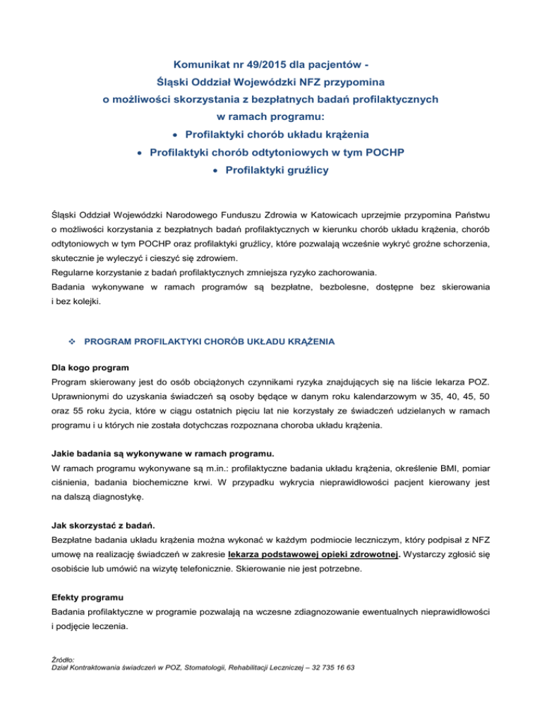 Komunikat nr 49/2015 dla pacjentów Śląski Oddział Wojewódzki NFZ przypomina o możliwości skorzystania z bezpłatnych badań profilaktycznych w ramach programu: Profilaktyki chorób układu krążenia Profilaktyki chorób odtytoniowych w tym POCHP Profilaktyki gruźlicy Śląski Oddział Wojewódzki Narodowego Funduszu Zdrowia w Katowicach uprzejmie przypomina Państwu o możliwości korzystania z bezpłatnych badań profilaktycznych w kierunku chorób układu krążenia, chorób odtytoniowych w tym POCHP oraz profilaktyki gruźlicy, które pozwalają wcześnie wykryć groźne schorzenia, skutecznie je wyleczyć i cieszyć się zdrowiem. Regularne korzystanie z badań profilaktycznych zmniejsza ryzyko zachorowania. Badania wykonywane w ramach programów są bezpłatne, bezbolesne, dostępne bez skierowania i bez kolejki. PROGRAM PROFILAKTYKI CHORÓB UKŁADU KRĄŻENIA Dla kogo program Program skierowany jest do osób obciążonych czynnikami ryzyka znajdujących się na liście lekarza POZ. Uprawnionymi do uzyskania świadczeń są osoby będące w danym roku kalendarzowym w 35, 40, 45, 50 oraz 55 roku życia, które w ciągu ostatnich pięciu lat nie korzystały ze świadczeń udzielanych w ramach programu i u których nie została dotychczas rozpoznana choroba układu krążenia. Jakie badania są wykonywane w ramach programu. W ramach programu wykonywane są m.in.: profilaktyczne badania układu krążenia, określenie BMI, pomiar ciśnienia, badania biochemiczne krwi. W przypadku wykrycia nieprawidłowości pacjent kierowany jest na dalszą diagnostykę. Jak skorzystać z badań. Bezpłatne badania układu krążenia można wykonać w każdym podmiocie leczniczym, który podpisał z NFZ umowę na realizację świadczeń w zakresie lekarza podstawowej opieki zdrowotnej. Wystarczy zgłosić się osobiście lub umówić na wizytę telefonicznie. Skierowanie nie jest potrzebne. Efekty programu Badania profilaktyczne w programie pozwalają na wczesne zdiagnozowanie ewentualnych nieprawidłowości i podjęcie leczenia. Źródło: Dział Kontraktowania świadczeń w POZ, Stomatologii, Rehabilitacji Leczniczej – 32 735 16 63 PROGRAM PROFILAKTYKI CHORÓB ODTYTONIOWYCH (W TYM POCHP) ETAP PODSTAWOWY: Dla kogo program Program skierowany jest do osób powyżej 18 roku życia palących papierosy, w tym w zakresie diagnostyki POCHP w szczególności do kobiet i mężczyzn pomiędzy 40 a 65 rokiem życia, którzy nie mieli wykonywanych badań spirometrycznych w ramach programu profilaktyki POCHP w ciągu ostatnich 36 miesięcy, u których nie zdiagnozowano wczesnej, w sposób potwierdzony badaniem spirometrycznym, przewlekłej obturacyjnej choroby płuc (lub przewlekłego zapalenia oskrzeli lub rozedmy płuc). Jakie badania są wykonywane w ramach programu W ramach programu wykonywana jest: porada antynikotynowa w odniesieniu do osób palących papierosy, niekwalifikujących się do działań w zakresie profilaktyki POCHP; porada antynikotynowa w odniesieniu do osób palących papierosy zakwalifikowanych do działań w zakresie profilaktyki POCHP - dodatkowo wykonywane jest badanie spirometryczne. W przypadku wykrycia nieprawidłowych zmian u pacjenta, kierowany jest on na dalszą diagnostykę. Jak skorzystać z badań Bezpłatne w ramach programu można wykonać w podmiotach leczniczych, które podpisały z NFZ umowę na realizację programu. Wystarczy zgłosić się osobiście lub umówić na wizytę telefonicznie. Skierowanie nie jest potrzebne. Z badań mogą korzystać wszystkie osoby ubezpieczone w NFZ, które mieszczą się w grupie wiekowej i nie wykonywały badań spirometrycznych w ciągu ostatnich trzech lat. Wykaz podmiotów leczniczych realizujących etap podstawowy programu znajduje się w zakładce Pacjent/Programy profilaktyczne/Program profilaktyki chorób odtytoniowych - w tym program przewlekłej obturacyjnej choroby płuc - etap podstawowy ETAP SPECJALISTYCZNY: Dla kogo program Program skierowany jest do wszystkich osób uzależnionych od palenia tytoniu skierowanych z etapu podstawowego programu realizowanego przez lekarza POZ lub z oddziału szpitalnego oraz zgłaszających się bez skierowania. Jakie badania są wykonywane w ramach programu W programie wykonywane są m.in.: badania przedmiotowe: masa ciała, wzrost, pomiar ciśnienia tętniczego krwi; edukacja antynikotynowa; terapia odwykowa. Źródło: Dział Kontraktowania świadczeń w POZ, Stomatologii, Rehabilitacji Leczniczej – 32 735 16 63 Jak skorzystać z badań Do udziału w programie można zgłaszać się ze skierowaniem od lekarza POZ realizującego etap podstawowy programu lub zgłosić się osobiście lub telefonicznie skontaktować się z placówką realizującą program. Wykaz podmiotów leczniczych realizujących etap podstawowy programu znajduje się w zakładce Pacjent/Programy profilaktyczne/Program profilaktyki chorób odtytoniowych - palenie jest uleczalne - etap specjalistyczny Efekty programu Cele programu to zmniejszenie zachorowalności na schorzenia odtytoniowe, poprawa świadomości w zakresie szkodliwości palenia oraz metod zapobiegania i leczenia uzależnienia od tytoniu oraz poprawa dostępności do specjalistycznego leczenia uzależnienia do tytoniu PROGRAM PROFILAKTYKI GRUŹLICY Dla kogo program Program skierowany jest do osób dorosłych znajdujących się na liście pielęgniarki POZ, nie posiadających w dotychczasowym wywiadzie rozpoznanej gruźlicy, w szczególności do osób, które miały kontakt z chorym, lub osób które mają trudne warunki życiowe mogące znacząco wpłynąć na wystąpienie choroby. Jakie badania są wykonywane w ramach programu W ramach programu wykonywane są wywiad w kierunku gruźlicy oraz edukacja zdrowotna pacjenta. W przypadku wykrycia nieprawidłowości pacjent kierowany jest na dalszą diagnostykę i leczenie. Jak skorzystać z badań Bezpłatne badania profilaktyki gruźlicy można wykonać w każdym zakładzie opieki zdrowotnej, który podpi