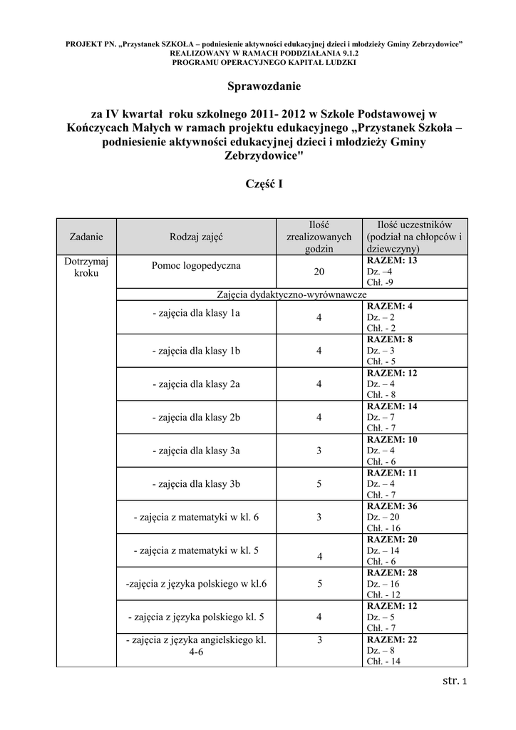 PROJEKT PN. „Przystanek SZKOŁA – podniesienie aktywności edukacyjnej dzieci i młodzieży Gminy Zebrzydowice” REALIZOWANY W RAMACH PODDZIAŁANIA 9.1.2 PROGRAMU OPERACYJNEGO KAPITAŁ LUDZKI Sprawozdanie za IV kwartał roku szkolnego 2011- 2012 w Szkole Podstawowej w Kończycach Małych w ramach projektu edukacyjnego „Przystanek Szkoła – podniesienie aktywności edukacyjnej dzieci i młodzieży Gminy Zebrzydowice" Część I Zadanie Rodzaj zajęć Dotrzymaj kroku Pomoc logopedyczna Ilość zrealizowanych godzin 20 Ilość uczestników (podział na chłopców i dziewczyny) RAZEM: 13 Dz. –4 Chł. -9 Zajęcia dydaktyczno-wyrównawcze - zajęcia dla klasy 1a 4 - zajęcia dla klasy 1b 4 - zajęcia dla klasy 2a 4 - zajęcia dla klasy 2b 4 - zajęcia dla klasy 3a 3 - zajęcia dla klasy 3b 5 - zajęcia z matematyki w kl. 6 3 - zajęcia z matematyki w kl. 5 4 -zajęcia z języka polskiego w kl.6 5 - zajęcia z języka polskiego kl. 5 4 - zajęcia z języka angielskiego kl. 4-6 3 RAZEM: 4 Dz. – 2 Chł. - 2 RAZEM: 8 Dz. – 3 Chł. - 5 RAZEM: 12 Dz. – 4 Chł. - 8 RAZEM: 14 Dz. – 7 Chł. - 7 RAZEM: 10 Dz. – 4 Chł. - 6 RAZEM: 11 Dz. – 4 Chł. - 7 RAZEM: 36 Dz. – 20 Chł. - 16 RAZEM: 20 Dz. – 14 Chł. - 6 RAZEM: 28 Dz. – 16 Chł. - 12 RAZEM: 12 Dz. – 5 Chł. - 7 RAZEM: 22 Dz. – 8 Chł. - 14 str. 1 PROJEKT PN. „Przystanek SZKOŁA – podniesienie aktywności edukacyjnej dzieci i młodzieży Gminy Zebrzydowice” REALIZOWANY W RAMACH PODDZIAŁANIA 9.1.2 PROGRAMU OPERACYJNEGO KAPITAŁ LUDZKI - zajęcia z przyrody Nie jesteś sam - pomoc psychologiczna 12 -świetlica socjoterapeutyczna 40 - kółko biblijne - kółko czytelniczo-medialne Odyseja umysłu Język oknem na świat Dzieciaki sieciaki Działaj twórczonie odtwórczo 3 3 3 - kółko historyczne 2 -Kółko matematyczne dla kl. 1-3 5 -kółko matematyczne dla kl. 5 3 -kółko języka angielskiego 3 -kółko języka niemieckiego 10 -kółko informatyczne kl. 4-6 3 -kółko informatyczne kl. 1-3 4 -kółko dziennikarskie 3 - kółko taneczne 4 - kółko wokalne (chór) 4 -kółko teatralne 4 -kółko plastyczne 5 RAZEM: 30 Dz. – 16 Chł. - 14 RAZEM: 229 Dz. – 117 Chł. - 112 RAZEM: 20 Dz. – 11 Chł. - 9 RAZEM: 11 Dz. – 6 Chł. - 5 RAZEM: 10 Dz. – 10 Chł. - 0 RAZEM: 30 Dz. – 22 Chł. - 8 RAZEM: 24 Dz. – 14 Chł. - 10 RAZEM: 14 Dz. – 8 Chł. - 6 RAZEM: 7 Dz. – 4 Chł. - 3 RAZEM: 39 Dz. –24 Chł. -15 RAZEM: 8 Dz. – 3 Chł. - 5 RAZEM: 24 Dz. – 17 Chł. - 7 RAZEM: 22 Dz. – 14 Chł. - 8 RAZEM: 28 Dz. – 26 Chł. - 2 RAZEM: 17 Dz. – 13 Chł. - 4 RAZEM: 28 Dz. – 17 Chł. - 11 RAZEM: 14 Dz. – 10 Chł. - 4 str. 2 PROJEKT PN. „Przystanek SZKOŁA – podniesienie aktywności edukacyjnej dzieci i młodzieży Gminy Zebrzydowice” REALIZOWANY W RAMACH PODDZIAŁANIA 9.1.2 PROGRAMU OPERACYJNEGO KAPITAŁ LUDZKI Część II Wypracowane efekty „Dotrzymaj kroku” Efekty twarde: W ramach zadania zajęcia prowadzi 12 nauczycieli w tym 11 kobiet i 1 mężczyzna. Pomocą logopedyczną objętych jest 13 uczniów. Zajęciami dydaktyczno – wyrównawczymi z różnych przedmiotów objętych jest 207 uczniów Efekty miękkie: W trakcie zajęć logopedycznych uzyskano u uczniów poprawną wymowę, prawidłowy zapis wypowiadanych słów, lepszy kontakt z otoczeniem, poczucie osiągnięcia sukcesu, lepsze wyniki w nauce, poprawa jakości pisania i czytania, bodźce poprawiające rozwój dzieci. Nauczyły się samokontroli i autokorekty oraz systematyczności. U innych dzieci znacznie poprawiła się sprawność narządów mowy. Potrafią prawidłowo artykułować większość zaburzonych dotąd głosek. Uzyskanie świadomości ,że można dokonywać rzeczy niemożliwych. Publiczne występy ucznia są zrozumiałe. W trakcie zajęć dydaktyczno –wyrównawczych dla klas I-III wyrównanie braków w wiadomościach i umiejętnościach szkolnych, wyrabianie własnej motywacji do nauki, wzmocnienie wiary we własne siły, poprawa aktywności na lekcjach, podniesienie kompetencji polonistycznych i matematycznych, usystematyzowanie, utrwalenie wiedzy zdobytej w czasie lekcji, poprawa techniki czytania, poprawne budowanie zdań ,rozpoznawanie rodzajów zdań prawidłowa wymowa spółgłosek miękkich , czytanie z podziałem na role , samodzielne rozwiązywanie zadań nazywanie zwierząt leśnych , utrwalanie zasad ortograficznych, części mowy, konstruowanie opisu i opowiadania, umiejętność rozwiązywania zadań tekstowych, znajomość tabliczki mnożenia, stosowanie zegara i kalendarza, sprawne dodawanie i odejmowanie, rozwiązywanie prostych zadań tekstowych, umiejętność rysowania figur geometrycznych , przełamywanie barier nieśmiałości, lepsze poznanie rówieśników, umiejętność pracy w grupie, swobodne wypowiadanie się. Rozładowywanie napięć wynikających z nadmiaru obowiązków szkolnych, przezwyciężanie wstydu i strachu. W trakcie zajęć uczniowie przygotowywali się do Ogólnopolskiego Sprawdzianu Trzecioklasisty. Powtórzyli zagadnienia związane z cechami charakterystycznymi wypowiedzi pisemnych typy ogłoszenie, opis, list, życzenia, opowiadanie. Redagowali notatki do kroniki klasowej. Recytacja wierszy zgodnie z zasadami interpretacji utworu. Ustalanie kolejności wydarzeń do historyjek obrazkowych. Układanie treści zadań do ilustracji lub działania. Obliczanie obwodów prostych figur geometrycznych. Mierzenie i kreślenie odcinków. Korzystanie ze słowników. Usystematyzowanie , utrwalenie wiedzy zdobytej na lekcjach. Rozładowywanie negatywnych emocji . Wyzwolenie potencjalnych możliwości uczniów . Zaspokajanie potrzeby akceptacji . Zapobieganie powstawaniu zaburzeń emocjonalnych . Efektem dla nauczyciela jest poszerzenie warsztatu pracy, możliwość indywidualizacji zajęć, rozpoznanie potrzeb uczniów, lepsza aktywność na lekcjach, lepsze poznanie problemów edukacyjnych, weryfikacja metod pracy , poznanie mocnych i słabych stron ucznia, wzrost motywacji do pracy
