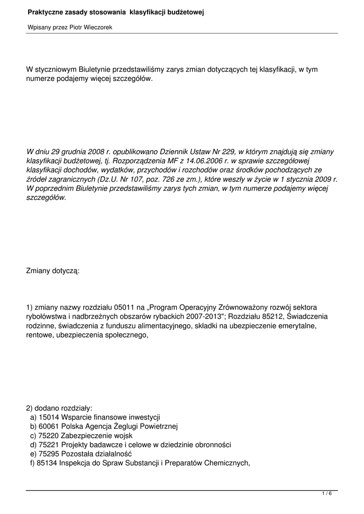 Praktyczne zasady stosowania klasyfikacji budżetowej Wpisany przez Piotr Wieczorek W styczniowym Biuletynie przedstawiliśmy zarys zmian dotyczących tej klasyfikacji, w tym numerze podajemy więcej szczegółów. W dniu 29 grudnia 2008 r. opublikowano Dziennik Ustaw Nr 229, w którym znajdują się zmiany klasyfikacji budżetowej, tj. Rozporządzenia MF z 14.06.2006 r. w sprawie szczegółowej klasyfikacji dochodów, wydatków, przychodów i rozchodów oraz środków pochodzących ze źródeł zagranicznych (Dz.U. Nr 107, poz. 726 ze zm.), które weszły w życie w 1 stycznia 2009 r. W poprzednim Biuletynie przedstawiliśmy zarys tych zmian, w tym numerze podajemy więcej szczegółów. Zmiany dotyczą: 1) zmiany nazwy rozdziału 05011 na „Program Operacyjny Zrównoważony rozwój sektora rybołówstwa i nadbrzeżnych obszarów rybackich 2007-2013"; Rozdziału 85212, Świadczenia rodzinne, świadczenia z funduszu alimentacyjnego, składki na ubezpieczenie emerytalne, rentowe, ubezpieczenia społecznego, 2) dodano rozdziały: a) 15014 Wsparcie finansowe inwestycji b) 60061 Polska Agencja Żeglugi Powietrznej c) 75220 Zabezpieczenie wojsk d) 75221 Projekty badawcze i celowe w dziedzinie obronności e) 75295 Pozostała działalność f) 85134 Inspekcja do Spraw Substancji i Preparatów Chemicznych, 1/6 Praktyczne zasady stosowania klasyfikacji budżetowej Wpisany przez Piotr Wieczorek 3) uchylono rozdziały: 75205, 75211, 4) zmieniono opis: a) Rozdziału 85212 na Świadczenia rodzinne, świadczenia z funduszu alimentacyjnego oraz składki na ubezpieczenie emerytalne i rentowe ubezpieczenia społecznego, b) Rozdziału 85231 poprzez zmianę nazwy na Pomoc dla cudzoziemców, oraz dodanie opisu: w rozdziale tym ujmuje się m.in. wydatki na pomoc dla cudzoziemców, o których mowa w art. 5 pkt 2 lit b i w art. 5a ustawy z dnia 12 marca 2004 r. o pomocy społecznej (Dz.U. z 2008 r. Nr 115, poz. 728 ze zm.), oraz dla cudzoziemców posiadających status uchodźcy lub ochronę uzupełniającą, o których mowa w art. 5 pkt 2 lit a tej ustawy, a także na wydatki na pomoc socjalną dla cudzoziemców ubiegających się o nadanie statusu uchodźcy w Rzeczypospolitej Polskiej, c) Do rozdziału 95295 Pozostała działalność, dodano opis: W rozdziale tym ujmuje się również wydatki, o których mowa w art. 6 ust. 4 pkt 2 ustawy z dnia 29 lipca 2005 r. o przeciwdziałaniu przemocy w rodzinie (Dz.U. Nr 180, poz. 1493) związane z opracowaniem i realizacją programów korekcyjno-edukacyjnych dla osób stosujących przemoc w rodzinie, 5) w klasyfikacji paragrafów dochodów: a) zmieniono wykaz §§ dotyczący dochodów: poprzez usunięcie z wykazu § 622 Dotacje celowe otrzymane z budżetu na finansowanie i dofinansowanie kosztów realizacji inwestycji i zakupów inwestycyjnych innych jednostek sektora finansów publicznych, dodanie § 656 Dotacje celowe otrzymane z budżetu na finansowanie lub dofinansowanie zadań inwestycyjnych obiektów zabytkowych, wykonywanych przez jednostki zaliczane do sektora finansów publicznych - który został również dodany w drodze opisywanych zmian, b) zmieniono opis czwartej cyfry przy symbolach cyfrowych poszczególnych paragrafów (zmiany przedstawiono kursywą): • cyfra 1. Finansowanie programów ze środków bezzwrotnych pochodzących z Unii Europejskiej - Symbol ten stosuje się dla oznaczenia dochodów, których źródłem są środki z 2/6 Praktyczne zasady stosowania klasyfikacji budżetowej Wpisany przez Piotr Wieczorek Unii Europejskiej m.in. dla dochodów realizowanych ze środków instrumentu finansowego UE Transition Facility oraz innych środków, o których mowa w art. 5 ust. 3 pkt 4 ustawy z dnia 30 czerwca 2005 r. o finansach publicznych, w tym realizowanych w ramach działu 3a budżetu Unii Europejskiej, • cyfra 2. Współfinansowanie programów realizowanych ze środków bezzwrotnych pochodzących z Unii Europejskiej - Symbol ten stosuje się dla oznaczenia dochodów, których źródłem są środki z budżetu państwa lub inne, przekazane na współfinansowanie programów realizowanych ze środków instrumentu finansowego UE Transition Facility oraz innych środków, o których mowa w art. 5 ust. 3 pkt 4 ustawy z dnia 30 czerwca 2005 r. o finansach publicznych, w tym realizowanych w ramach działu 3a budżetu Unii Europejskiej, • cyfra 5. Finansowanie z innych środków bezzwrotnych - Symbol ten stosuje się dla oznaczenia dochodów, których źródłem są środki pochodzące z darowizn, grantów przyznanych Polsce przez poszczególne kraje lub instytucje (np. grant rządu USA, Królestwa Niderlandów itp.). Cyfrę 5 jednostki samorządu terytorialnego dodają odpowiednio do paragrafu 270 lub 629. Symbol ten stosuje się również do dochodów, których źródłem są środki z Norweskiego Mechanizmu Finansowego, Mechanizmu Finansowego Europejskiego Obszaru Gospodarczego oraz Szwajcarsko-Polskiego Programu Współpracy. W zakresie tych Mechanizmów Finansowych oraz Szwajcarsko-Polskiego Programu Współpracy cyfrę 5 jednostki sektora finansów publicznych dodają do paragrafu 854, • cyfra 6. Współfinansowanie innych środków bezzwrotnych - Symbol ten stosuje się do oznaczenia dochodów, których źródłem są środki z budżetu państwa lub inne, przekazane jednostkom sektora finansów publicznych jako współfinansowanie środków pochodzących z darowizn, grantów przyznanych Polsce przez poszczególne kraje lub instytucje (np. grant rządu USA, Królestwa Niderlandów itp.), a także Norweskiego Mechanizmu Finansowego, Mechanizmu Finansowego Europejskiego Obszaru Gospodarczego oraz Szwajcarsko-Polskieg o Programu Współpracy, c) dodano paragrafy „dochodów": • 224 - Dotacje celowe otrzymane z budżetu państwa dla państwowej instytucji kultury na dofinansowanie zadań bieżących objętych mecenatem państwa, wykonywanych w ramach programów ministra właściwego do spraw kultury i ochrony dziedzictwa narodowego przez samo