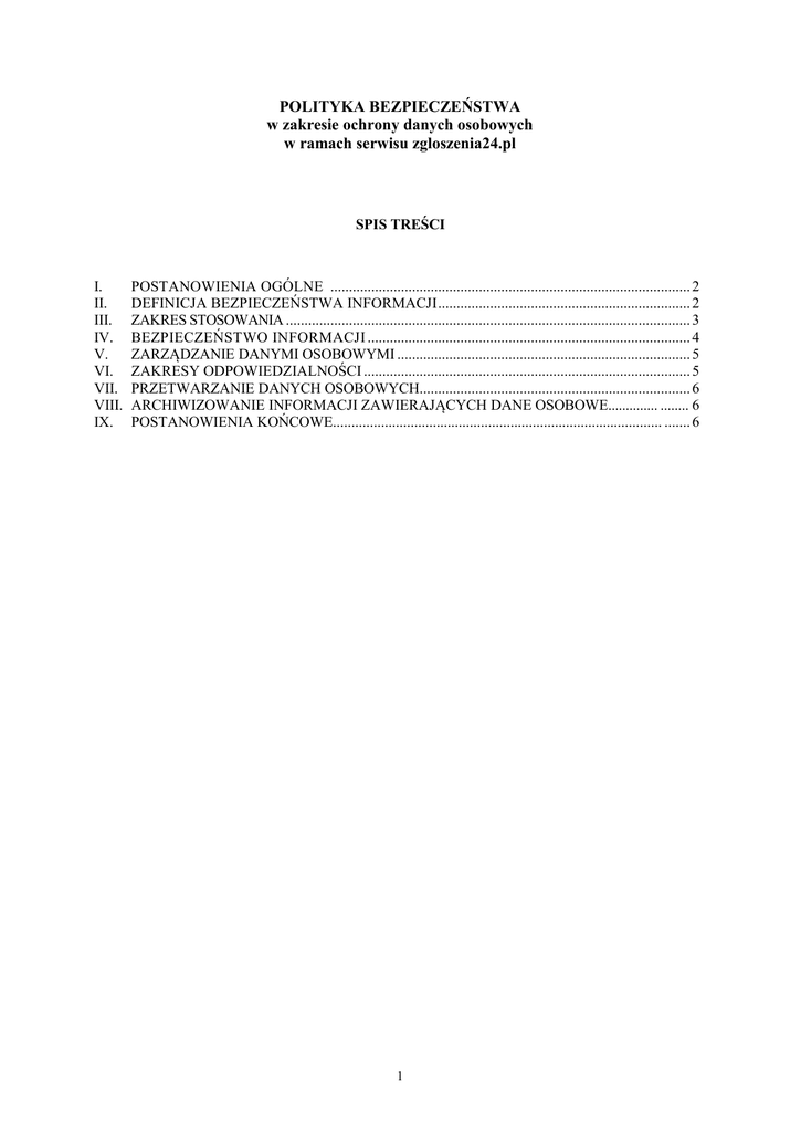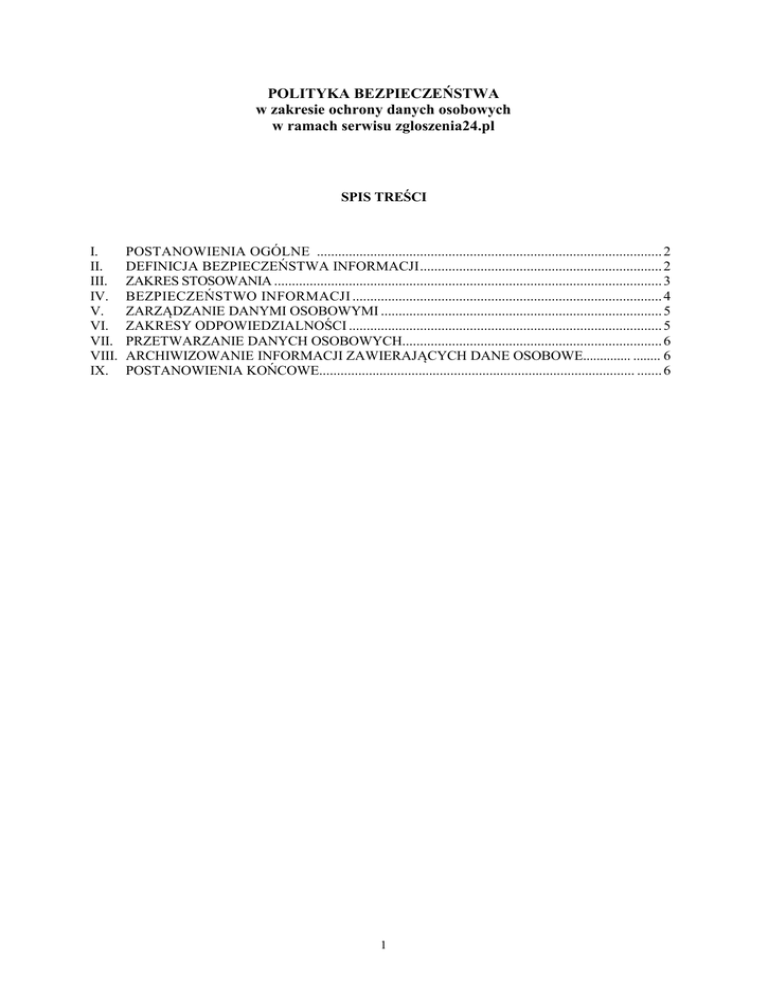 POLITYKA BEZPIECZEŃSTWA w zakresie ochrony danych osobowych w ramach serwisu zgloszenia24.pl SPIS TREŚCI I. II. III. IV. V. VI. VII. VIII. IX. POSTANOWIENIA OGÓLNE ................................................................................................. 2 DEFINICJA BEZPIECZEŃSTWA INFORMACJI .................................................................... 2 ZAKRES STOSOWANIA ............................................................................................................. 3 BEZPIECZEŃSTWO INFORMACJI ....................................................................................... 4 ZARZĄDZANIE DANYMI OSOBOWYMI ............................................................................... 5 ZAKRESY ODPOWIEDZIALNOŚCI ........................................................................................ 5 PRZETWARZANIE DANYCH OSOBOWYCH......................................................................... 6 ARCHIWIZOWANIE INFORMACJI ZAWIERAJĄCYCH DANE OSOBOWE.............. ........ 6 POSTANOWIENIA KOŃCOWE......................................................................................... ....... 6 1 I. POSTANOWIENIA OGÓLNE §1. Celem Polityki Bezpieczeństwa danych osobowych, zwanej dalej Polityką Bezpieczeństwa, jest uzyskanie optymalnego i zgodnego z wymogami obowiązujących aktów prawnych, sposobu przetwarzania w ramach serwisu internetowego zgloszenia24.pl informacji zawierających dane osobowe. §2. Obszarem przetwarzania danych osobowych w ramach serwisu internetowego zgloszenia24.pl są pomieszczenia siedziby działalności gospodarczej prowadzonej pod firmą Tomasz Jura Software przy ulicy Panewnickiej 343c/7, 40-774 Katowice oraz pomieszczenia siedziby właściciela domeny spółce nazwa.pl S.A. z siedzibą przy ulicy Cystersów 20a, 31-553 Kraków. §3. Określenia użyte w Polityce Bezpieczeństwa oznaczają: 1. Serwis – witryna internetowa zgloszenia24.pl 2. Administrator – Tomasz Jura prowadzący działalność gospodarczą pod firmą Tomasz Jura Software, nr NIP: 6342788997, będący osobą upoważnioną do zarządzania systemem informatycznym. 3. Osoba posiadająca konto w serwisie – zarejestrowany użytkownik Serwisu posiadający delegowane uprawnienia Administratora do przetwarzania danych osobowych zgromadzonych w ramach korzystania z Serwisu. 4. Dane osobowe - wszelkie informacje dotyczące zidentyfikowanej lub możliwej do zidentyfikowania osoby fizycznej. 5. Przetwarzanie danych osobowych - gromadzenie, utrwalanie przechowywanie, opracowywanie, zmienianie, udostępnianie i usuwanie danych osobowych, zwłaszcza w systemach informatycznych, 6. System informatyczny - zespół współpracujących ze sobą urządzeń, programów, procedur przetwarzania informacji i narzędzi programowych zastosowanych w celu przetwarzania danych. 7. Zabezpieczenie systemu informatycznego wdrożenie stosowanych środków administracyjnych, technicznych oraz ochrony przed modyfikacją, zniszczeniem, nieuprawnionym dostępemi ujawnieniem lub pozyskaniem danych osobowych a także ich utratą. II. DEFINICJA BEZPIECZEŃSTWA INFORMACJI §4. 1. Utrzymanie bezpieczeństwa przetwarzanych w ramach serwisu internetowego zgloszenia24.pl informacji rozumiane jest jako zapewnienie ich poufności, integralności i dostępności na odpowiednim poziomie. Miarą bezpieczeństwa jest wielkość ryzyka związanego z ochroną danych osobowych. 2. Poniżej opisane jest rozumienie wyżej wymienionych pojęć w odniesieniu do informacji i aplikacji: 2 a) poufność informacji - rozumiana jako zapewnienie, że tylko uprawnieni pracownicy i posiadacze konta w serwisie mają dostęp do informacji; b) integralność informacji - rozumiana jako zapewnienie dokładności i kompletności informacji oraz metod jej przetwarzania; c) dostępność informacji - rozumiane jako zapewnienie, że osoby upoważnione mają dostęp do informacji i związanych z nią zasobów wtedy, gdy jest to potrzebne; d) zarządzanie ryzykiem - rozumiane jako proces identyfikowania, kontrolowania i minimalizowania lub eliminowania ryzyka dotyczącego bezpieczeństwa, które może dotyczyć systemów informacyjnych. III. ZAKRES STOSOWANIA §5. 1. W ramach serwisu internetowego zgloszenia24.pl przetwarzane są informacje służące do prowadzenia procesów rejestracyjnych i ewidencyjnych przez Administratora i osoby posiadające konto w serwisie. 2. Informacje te są przetwarzane i składowane w postaci elektronicznej. §6. Politykę Bezpieczeństwa stosuje się do: 1. Danych osobowych gromadzonych przez Administratora i osoby posiadające konto w serwisie. 2. Informacji dotyczących zabezpieczenia danych osobowych, w tym w szczególności nazw kont i haseł w systemach przetwarzania danych osobowych. 3. Rejestru osób dopuszczonych do przetwarzania danych osobowych. 4. Innych dokumentów zawierających dane osobowe. §7. 1. Zakresy ochrony danych osobowych określone przez Politykę Bezpieczeństwa mają zastosowanie w szczególności do: a) wszystkich istniejących, wdrażanych obecnie lub w przyszłości systemów informatycznych oraz papierowych, w których przetwarzane są dane osobowe podlegające ochronie; b) wszystkich lokalizacji - budynków i pomieszczeń, w których są lub będą przetwarzane informacje podlegające ochronie; c) wszystkich pracowników w rozumieniu przepisów Kodeksu Pracy, konsultantów, stażystów i innych osób mających dostęp do informacji podlegających ochronie. 2. Do stosowania zasad określonych przez dokumenty Polityki Bezpieczeństwa zobowiązani są wszyscy pracownicy w rozumieniu Kodeksu Pracy, konsultanci, stażyści oraz inne osoby mające dostęp do informacji podlegających ochronie. 3 IV. BEZPIECZEŃSTWO INFORMACJI § 8. W ramach Serwisu należy stosować następujące kategorie środków zabezpieczeń danych osobowych: 1. zabezpieczenia informatyczne. 2. zabezpieczenia organizacyjne: a) osobami bezpośrednio odpowiedzialnymi za bezpieczeństwo