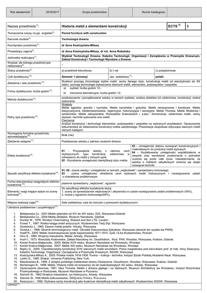 Rok akademicki: 2016/2017 Grupa przedmiotów: Numer katalogowy: Nazwa przedmiotu1): Historia mebli z elementami konstrukcji Tłumaczenie nazwy na jęz. angielski3): Period furniture with construction 4) ECTS 2) 3 Technologia drewna Kierunek studiów : Koordynator przedmiotu5): 6) dr Anna Kostrzyńska-Miłosz Prowadzący zajęcia : dr Anna Kostrzyńska-Miłosz, dr inż. Anna Różańska Jednostka realizująca7): Wydział Technologii Drewna, Katedra Technologii, Organizacji i Zarządzania w Przemyśle Drzewnym, Zakład Konstrukcji i Technologii Wyrobów z Drewna Wydział, dla którego przedmiot jest realizowany8): - Status przedmiotu9): a) przedmiot kierunkowy 10) b) I rok c) podyplomowe 11) Cykl dydaktyczny : Semestr 1 (zimowy) Założenia i cele przedmiotu12): Studenci poznają chronologie stylów mebli, cechy danego stylu, konstrukcje mebli od starożytności do XX wieku, poznają technologie wytwarzania dawnych mebli, elementów, podzespołów i zespołów. a) wykład; liczba godzin 12.; Formy dydaktyczne, liczba godzin13): Metody dydaktyczne14): Pełny opis przedmiotu15): b) Jęz. wykładowy : polski ćwiczenia laboratoryjne; liczba godzin 12; przekazywanie i porządkowanie wiedzy w ramach wykładu, analiza obiektów ich zdobnictwa, konstrukcji, metod wykonania Wykłady Meble egipskie, greckie i rzymskie. Meble romańskie i gotyckie. Meble renesansowe i barokowe. Meble klasycystyczne, biedermeierowskie, regencyjne, historyzujące i secesyjne. Meble Thoneta. Meble Shakerów i windsorskie. Meble zakopiańskie, Warsztatów Krakowskich i „Ładu”. Konstrukcje, zdobnictwo mebli, cechy stylowe i techniki wykonania w/w mebli. Ćwiczenia Analiza konstrukcji i technologii elementów, podzespołów i zespołów na wybranych przykładach. Opracowanie dokumentacji do odtworzenia konstrukcji mebla zabytkowego. Prezentacje zespołowe dotyczące dawnych mebli różnych kategorii. Wymagania formalne (przedmioty wprowadzające)16): Brak (nie) Założenia wstępne17): Podstawowa wiedza z zakresu anatomii drewna Efekty kształcenia18): 03 – Umiejętność doboru rozwiązań konstrukcyjnych i materiałowych do produkcji mebli stylowych 01 - Przyswojenie wiedzy z zakresu cech 04 – Kształtowanie umiejętności współdziałania w stylistycznych, typu konstrukcji, zdobnictwa w zespole oraz wyrobienie przekonania o potrzebie odniesieniu do mebli z różnych epok uczenia się przez całe życie. Uświadomienie, że 02 - Wyrobienie umiejętności identyfikacji stylu mebla wiedza o meblach zabytkowych zmienia się dzięki rozwojowi techniki Sposób weryfikacji efektów kształcenia19): 01, 02 - ocena wiedzy i umiejętności w ramach „wejściówek” i sprawdzianu końcowego 03 - ocena umiejętności określenia cech stylowych mebli historycznych i o charakterze problemowym rozwiązywania zadań Forma dokumentacji osiągniętych efektów pisemne sprawdziany „wejściowe”, egzamin kształcenia 20): Do weryfikacji efektów kształcenia służą: 1. oceny ze sprawdzianów wejściowych i aktywności w czasie rozwiązywania zadań problemowych (45%), Elementy i wagi mające wpływ na ocenę końcową21): 2. ocena z egzaminu końcowego(55%), Miejsce realizacji zajęć22): Sala wykładowa, sala do ćwiczeń z pomocami dydaktycznymi Literatura podstawowa i uzupełniająca23): 1. 2. 3. 4. 5. 6. 7. 8. 9. 10. 11. 12. Betlejewska Cz., 2001:Meble gdańskie od XVI do XIX wieku, DiG, Warszawa-Gdańsk Betlejewska Cz., 2004:Meble elbląskie, Muzeum Narodowe, Gdańsk Dunbar M., 1976: Windsor Chairmaking. Stobard and Son LTD. London. Forest T., 1997: Wielka księga mebli antycznych. Wydawnictwo Twój Styl, Warszawa Gostwicka J., 1965: Dawne meble polskie. Arkady, Warszawa Grzeluk I., 1998: Słownik terminologiczny mebli. Ośrodek Dokumentacji Zabytków, Warszawa (słownik ten wydało też PWN). Haaff R., 2005: Meble neorenesansowe epoki kajzerowskiej 1871-1914. Zysk i S-ka Wydawnictwo, Poznań. Hinz S., 1980: Wnętrza mieszkalne. Meble. Arkady, Warszawa. Huml I., 1973: Warsztaty Krakowskie. Zakład Narodowy im. Ossolińskich,. Wyd. PAN, Wrocław, Warszawa, Kraków, Gdańsk. Korżel Kraśna Małgorzata, 2004: Meble XVIII wieku, Muzeum Narodowe we Wrocławiu, Wrocłąw Korżel Kraśna Małgorzata, 2007: Meble XIX wieku, Muzeum Narodowe we Wrocławiu, Wrocłąw Mądry G., 2000: Charakterystyka konstrukcji XVIII wiecznych mebli toruńskich. Praca magisterska pod kierunkiem prof. dr hab. Ireny Swaczyny, Katedra Technologii, Organizacji i Zarządzania w Przemyśle Drzewnym, SGGW, Warszawa. 13. Kostrzyńska-Miłosz A., 2005: Polskie meble 1918-1939. Forma – funkcja - technika. Instytut Sztuki Polskiej Akademii Nauk. Warszawa. 14. Larkin D., 1995: Shaker. Universe Publishing, New York. 15. Maszkowska B., 1956: Z dziejów polskiego meblarstwa okresu Oświecenia. Ossolineum, Wrocław, Warszawa, Kraków, Gdańsk. 16. Montenegro R., 1998: Meble. Historia mebli od renesansu do lat sześćdziesiątych XX wieku. Arkady, Warszawa. 17. Opracowanie zbiorowe, 1991: Idea Thoneta. Meble z drewna giętego i rur stalowych. Muzeum Architektury we Wrocławiu, Instytut Wzornictwa Przemysłowego w Warszawie, Muzeum Narodowe w Poznaniu. 18. Sienicki St., 1962 Wnętrza mieszkalne, rys historyczny, Arkady, Warszawa 19. Sienicki St., !936 Meble kolbuszowskie, Bibljoteka Polska, Warszawa 20. Swaczyna I., 1992: Wybrane cechy konstrukcji jako kryterium identyfikacji mebli zabytkowych. Wydawnictwo SGGW, Warszawa UWAGI24): Wskaźniki ilościowe charakteryzujące moduł/przedmiot25) : Szacunkowa sumaryczna liczba godzin pracy studenta (kontaktowych i pracy własnej) niezbędna dla osiągnięcia zakładanych efektów kształcenia18) - na tej podstawie należy wypełnić pole ECTS2: 78 (31+47)h Łączna liczba punktów ECTS, którą student uzyskuje na zajęciach wymagających bezpośredniego udziału nauczycieli akademickich 1,2 ECTS Łączna liczba punktów ECTS, którą student uzyskuje w ramach zajęć o charakterze praktycznym, takich jak zajęcia l