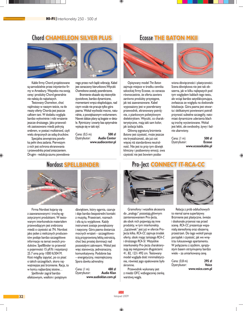 HI-FI Interkonekty 250 - 500 zł Chord CHAMEL CHAMELEON SILVER PLUS Kable firmy Chord projektowane są samodzielnie przez inżynierów firmy w Amesbury. Wszystko ma swoją cenę i produkty Chord generalnie nie należą do najtańszych. Testowany Chameleon, choć najdroższy w naszym teście, na tle reszty oferty Chorda jest jeszcze całkiem tani. W dodatku wygląda bardzo wykwintnie i robi wrażenie jeszcze droższego. Jako przewodnik zastosowano miedź pokrytą srebrem, w postaci multistrand, czyli wielu skręconych ze sobą drucików. Specjalna zewnętrzna powłoka pełni dwa zadania. Pierwszym z nich jest ochrona ekranowania i przewodnika przed zniszczeniem. Drugim - redukcja szumu powodowa- Ecosse THE BAT BATON MKII nego przez ruch bądź wibrację. Kabel jest oznaczony kierunkowo.Wtyczki Chameleona zostały posrebrzone. Brzmienie okazało się niezwykle żywiołowe, bardzo dynamiczne, momentami wręcz eksplodujące, nad czym wcale nie pracuje tylko góra pasma. Wokal wychodzi mocno, naturalnie, z powiększonym wolumenem. Nawet dalsze plany są bogate w detale. Rytmiczny i zwarty bas optymalnie wpisuje się w taki styl. Cena: (0,5 m) 500 zł Dystrybutor: Audio Center www.audiocenter.pl Opisywany model The Baton zajmuje miejsce w środku cennika szkockiej firmy Ecoose, co oznacza równocześnie, że oferta zawiera zarówno produkty przystępne, jak też zaawansowane. Kabel wyposażony jest w posrebrzany przewodnik, ekranowany potrójnie, z piankowym polietylowym dielektrykiem. Wtyczki, co charakterystyczne, mają taki sam kolor, jak izolacja kabla. Główną sygnaturą brzmienia Batona jest czystość, może jeszcze nie krystaliczność, ale już coś więcej niż standardowa neutralność. Nie jest to przy tym dźwięk kliniczny i pozbawiony emocji, owa czystość nie jest bowiem pozba- 32 Cena: (1 m) 500 zł Dystrybutor: Ecosse www.ecossekable.pl Pro-Ject CONNECT IT-RCA-CC Nordost SPELLBINDER Firma Nordost kojarzy się z zaawansowanymi i trochę egzotycznymi produktami. W testowanym interkonekcie materiałem przewodzącym jest srebrzona miedź o czystości aż 7N. Nordost jako jeden z nielicznych producentów podaje bardzo szczegółowe informacje na temat swoich produktów. SpellBinder to przewód o pojemności 15 pF/ft i rezystancji 25.7 oma przy 1000 ft/304 M. Ktoś mógłby zapytać, po co pisać o takich szczegółach, skoro najważniejsze jest brzmienie. Racja, to w końcu najbardziej istotne… Spellbinder zagrał bardzo efektownym, wielkim i potężnym wiona dźwięczności i plastyczności. Scena dźwiękowa nie jest tak obszerna, jak w kilku najlepszych pod tym względem kablach tego testu, ale wciąż bardzo satysfakcjonująca, zwłaszcza ze względu na doskonałe lokalizacje. Góra pasma jest otwarta i delikatnymi powiewami potrafi przynosić subtelne szczegóły, natomiast dynamiczne uderzenia blach są trochę wycieniowane. Wokal jest lekki, ale swobodny, żywy i ładnie ubarwiony. dźwiękiem, który ogarnia, czaruje i daje bardzo bezpośredni kontakt z muzyką. Przestrzeń, rozmach i siła są tu wyjątkowe. Każdy instrument zostaje powiększony i nasycony. Góra pasma dostarcza mocnych wrażeń – szczegółowością przyprawioną lekką ostrością, choć bez prostej dominacji nad pozostałymi zakresami. Wokal jest więc stanowczy, jednoznaczny, komunikatywny. Podobnie bas – energetyczny, niezmiękczony. Spora dawka adrenaliny. Cena: (1 m) 480 zł Dystrybutor: Audio Klan www.audioklan.com.pl Gramofony i wszelkie akcesoria do „analogu” pozostają głównym zainteresowaniem Pro-Jecta, ale obok nich pojawiają się inne produkty, w tym interkonekty. „Łączówek” jest już w ofercie ProJecta kilka. RCA-CC zajmuje środek oferty, obok mając tańszego RCA-C i droższego RCA-SI. Wszystkie interkonekty Pro-Jecta charakteryzują się nietypowymi długościami: 41, 82, 123 i 492 cm. Testowany model wygląda dość minimalistycznie, również jego opakowanie było skromne. Przewodnik wykonany jest z miedzi OFC wzbogaconej cienką warstwą węgla. listopad 2009 Relacja z prób odsłuchowych to niemal same superlatywy. Brzmienie jest plastyczne, świeże i doskonale przenosi nas przed scenę. RCA-CC prezentuje wspaniałą stereofonię oraz obszerną przestrzeń. Do tego wokół panuje porządek i czystość, jak we wnętrzu luksusowego apartamentu. W połączeniu z szybkim, sprężystym basem otrzymujemy bardzo wiele – za umiarkowaną cenę. Cena: (0,8 m) Dystrybutor: 295 zł Voice www.voice.com.pl
