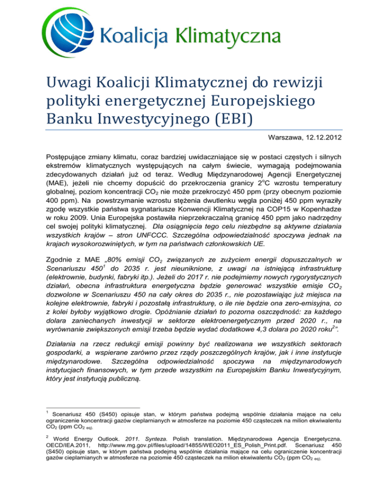 Uwagi Koalicji Klimatycznej do rewizji polityki energetycznej Europejskiego Banku Inwestycyjnego (EBI) Warszawa, 12.12.2012 Postępujące zmiany klimatu, coraz bardziej uwidaczniające się w postaci częstych i silnych ekstremów klimatycznych występujących na całym świecie, wymagają podejmowania zdecydowanych działań już od teraz. Według Międzynarodowej Agencji Energetycznej (MAE), jeżeli nie chcemy dopuścić do przekroczenia granicy 2 oC wzrostu temperatury globalnej, poziom koncentracji CO2 nie może przekroczyć 450 ppm (przy obecnym poziomie 400 ppm). Na powstrzymanie wzrostu stężenia dwutlenku węgla poniżej 450 ppm wyraziły zgodę wszystkie państwa sygnatariusze Konwencji Klimatycznej na COP15 w Kopenhadze w roku 2009. Unia Europejska postawiła nieprzekraczalną granicę 450 ppm jako nadrzędny cel swojej polityki klimatycznej. Dla osiągnięcia tego celu niezbędne są aktywne działania wszystkich krajów – stron UNFCCC. Szczególna odpowiedzialność spoczywa jednak na krajach wysokorozwiniętych, w tym na państwach członkowskich UE. Zgodnie z MAE „80% emisji CO2 związanych ze zużyciem energii dopuszczalnych w Scenariuszu 4501 do 2035 r. jest nieuniknione, z uwagi na istniejącą infrastrukturę (elektrownie, budynki, fabryki itp.). Jeżeli do 2017 r. nie podejmiemy nowych rygorystycznych działań, obecna infrastruktura energetyczna będzie generować wszystkie emisje CO 2 dozwolone w Scenariuszu 450 na cały okres do 2035 r., nie pozostawiając już miejsca na kolejne elektrownie, fabryki i pozostałą infrastrukturę, o ile nie będzie ona zero-emisyjna, co z kolei byłoby wyjątkowo drogie. Opóźnianie działań to pozorna oszczędność: za każdego dolara zaniechanych inwestycji w sektorze elektroenergetycznym przed 2020 r., na wyrównanie zwiększonych emisji trzeba będzie wydać dodatkowe 4,3 dolara po 2020 roku2”. Działania na rzecz redukcji emisji powinny być realizowana we wszystkich sektorach gospodarki, a wspierane zarówno przez rządy poszczególnych krajów, jak i inne instytucje międzynarodowe. Szczególna odpowiedzialność spoczywa na międzynarodowych instytucjach finansowych, w tym przede wszystkim na Europejskim Banku Inwestycyjnym, który jest instytucją publiczną. 1 Scenariusz 450 (S450) opisuje stan, w którym państwa podejmą wspólnie działania mające na celu ograniczenie koncentracji gazów cieplarnianych w atmosferze na poziomie 450 cząsteczek na milion ekwiwalentu CO2 (ppm CO2 eq). 2 World Energy Outlook. 2011. Synteza. Polish translation. Międzynarodowa Agencja Energetyczna. OECD/IEA.2011, http://www.mg.gov.pl/files/upload/14855/WEO2011_ES_Polish_Print.pdf. Scenariusz 450 (S450) opisuje stan, w którym państwa podejmą wspólnie działania mające na celu ograniczenie koncentracji gazów cieplarnianych w atmosferze na poziomie 450 cząsteczek na milion ekwiwalentu CO2 (ppm CO2 eq). Zdaniem Koalicji Klimatycznej działania EBI powinny wspierać transformację w kierunku budowy w Europie niskoemisyjnej gospodarki. Dlatego jego środki finansowe winny być przeznaczane na: 1. Wzrost efektywności energetycznej; 2. Rozwój odnawialnych źródeł energii i dostosowanie sieci przesyłowych do współpracy z takimi źródłami; Europejski Bank Inwestycyjny nie powinien zaś wspierać inwestycji w konwencjonalne źródła energii, zwłaszcza w projekty jej produkcji w oparciu o spalanie węgla i innych paliw węglowodorowych. Koalicja klimatyczna uważa także, że do czasu określenia szczegółowych kryteriów ekologicznych wydobycia gazu łupkowego EBI powinno wprowadzić moratorium na wspieranie prac w tym zakresie. Przeprowadzana rewizja dotychczasowej polityki inwestycyjnej EBI w sektorze energetyki stwarza szczególną szanse na dostosowanie polityki Banku do współczesnych wyzwań ekologicznych i gospodarczych wynikających z konieczności ochrony klimatu. Dlatego też Koalicja Klimatyczna uważa, że rewizja ta powinna uwzględnić następujące postulaty: 1. Efektywność energetyczna Zwiększenie ilości środków dostępnych na efektywność energetyczną budynków Koalicja Klimatyczna przypomina, że obszarem priorytetowym, oferującym zarówno największy potencjał redukcji emisji gazów cieplarnianych w horyzoncie do 2020 roku, jak i którego realizacja zapewnia największe długofalowe korzyści zarówno dla gospodarki jak i społeczeństwa jest efektywność energetyczna. Poprawa efektywności energetycznej w ocenie Koalicji Klimatycznej jest niezbędna do zwiększenia bezpieczeństwa energetycznego zarówno całej Unii Europejskiej jak i Polski, a także wzrostu konkurencyjności polskich i europejskich przedsiębiorstw oraz podniesienia jakości życia obywateli. Podniesienie efektywności energetycznej jest także jednym z głównych celów "Polityki energetycznej Polski do roku 2030". W dokumencie podkreślono, że Polska dążyć będzie do utrzymania zero energetycznego wzrostu gospodarczego, czyli rozwoju polskiej gospodarki i podniesienia poziomu życia mieszkańców bez wzrostu zapotrzebowania na energię pierwotną. Jak pokazuje przykład budownictwa w Polsce istnieje duży, niewykorzystany potencjał zwiększenia potencjału energetycznego. Budynki mieszkalne są odpowiedzialne za prawie 32% zużycia energii finalnej w Polsce. Tzw. krzywa McKinseya dla Polski wskazuje, że budownictwo, zaraz po energetyce, jest sektorem o najwyższym potencjale redukcji ocenianym na 44 MtCO2e (34%) do roku 20303 i to przy ujemnych kosztach netto wynoszących -18 euro za tonę CO24. Aktualnie, zapotrzebowanie na energię pierwotną dla budynku jednorodzinnego, ogrzewanego niskotemperaturowym kotłem gazowym jest w Polsce o 30% większe niż w Szwecji i to mimo łagodniejszych warunków klimatycznych. Dla budynku wielorodzinnego jest to różnica rzędu 25%. W zakresie wymagań 3 Względem roku 2005. Ocena potencjału redukcji emisji gazów cieplarnianych w POlsce do roku 2030, McKinsey&Company, 2009. h