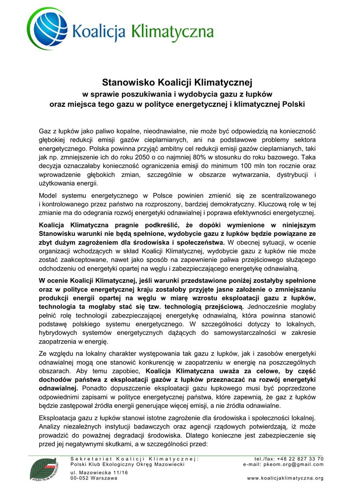 Stanowisko Koalicji Klimatycznej