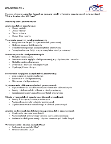 ZAŁĄCZNIK NR 1 Program szkolenia: „Analiza danych za pomocą tabel i wykresów przestawnych z elementami VBA w środowisku MS Excel” Podstawy tabel przestawnych Anatomia tabeli przestawnej • Obszar wartości • Obszar wierszy • Obszar kolumn • Obszar filtra raportu Tworzenie prostych tabel przestawnych • Przygotowanie danych do raportów tabeli przestawnej • Śledzenie zmian w źródle danych • Współdzielenie pamięci podręcznej tabeli przestawnej • Oszczędzanie czasu dzięki nowym narzędziom tabeli przestawnej Dostosowywanie tabel przestawnych • Modyfikowanie układu • Dostosowywanie wyglądu tabeli przestawnej przy użyciu stylów i tematów • Modyfikowanie podsumowań • Dodawanie i usuwanie sum częściowych • Użycie opcji Suma bieżąca Sterowanie wyglądem danych tabeli przestawnej • Grupowanie pól tabeli przestawnej • Sortowanie w tabeli przestawnej • Filtrowanie tabeli przestawnej Wykonywanie obliczeń w tabelach przestawnych • Wprowadzenie do pól obliczeniowych i elementów obliczeniowych • Zasady i niedoskonałości obliczeń w tabeli przestawnej • Zarządzanie i konserwacja obliczeń w tabeli przestawnej Użycie wykresu tabeli przestawnej i innych wizualizacji • Zasady dotyczące wykresów przestawnych • Analiza alternatyw dla wykresów przestawnych • Użycie formatowania warunkowego w tabelach przestawnych Analiza oddzielnych źródeł danych za pomocą tabel przestawnych • Użycie wielu zakresów konsolidacji • Anatomia tabeli przestawnej z wieloma zakresami konsolidacji • Budowanie tabeli przestawnej z użyciem zewnętrznych źródeł danych Wykorzystanie i analiza danych OLAP • Podłączanie do modułu OLAP • Struktura modułu OLAP • • • Ograniczenia tabel przestawnych OLAP Tworzenie modułów w trybie offline Wykorzystanie funkcji modułu OLAP poza tabelą przestawną Rozszerzanie tabel przestawnych przy użyciu makr • Tworzenie interfejsu użytkownika z formantami formularza • Dodawanie funkcji do zapisanego makra Użycie VBA do tworzenia tabel przestawnych • Wprowadzenie do VBA • Tworzenie tabeli przestawnej za pomocą VBA • Tworzenie raportu pokazującego dochód według produktów • Eliminowanie pustych komórek w obszarze wartości • Obsługa niedogodności w czasie tworzenia raportu • Obsługa problemów z co najmniej dwoma polami danych • Podsumowanie pól danych za pomocą grupowania • Użycie funkcji Autopokazywanie do tworzenia widoków menedżerskich • Użycie funkcji ShowDetail do filtrowania danych • Tworzenie raportów dla każdego regionu lub modelu • Ręczne filtrowanie dwóch lub więcej elementów w PivotField • Ręczna kontrola nad sortowaniem • Użycie sumowania, zliczania, średniej, minimum, maksimum itp • Tworzenie raportów procentowych • Użycie nowych funkcji tabel przestawnych Excela