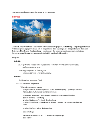 SZKLAKIEM DUŃSKICH ZAMKÓW > Wycieczka 3-dniowa NOWOŚĆ Zamki Królestwa Danii - historia i współczesność w pigułce. Kronborg - imponująca forteca w Helsingør, niegdyś budząca lęk w żeglarzach, dziś kojarząca się z legendarnym duńskim księciem Hamletem. Fredensborg - wzniesiony dla upamiętnienia zawarcia pokoju ze Szwecją. Amalienborg - rezydencja duńskiej rodziny królewskiej. Program: Dzień 1: 20.45spotkanie uczestników wycieczki na Terminalu Promowym w Świnoujściu zaokrętowanie na prom 22.30wyjście promu ze Świnoujścia wieczór rozrywki - dyskoteka, nocleg Dzień 2: 6.15przyjście promu do Ystad 6.00-7.00śniadanie na promie 7.00wyokrętowanie z promu przejazd z Ystad, wzdłuż wybrzeża Skanii do Helsingborg - spacer po mieście: Ratusz, Zamek, Twierdza Karnan z XII wieku przeprawa promowa z Helsinborg ( Szwecja ) do Helsingør ( Dania ) Zamek Hamleta - Kronborg przejazd do Zamku Przyjaźni - Fredensborg przejazd do Hillerød - Zamek Frederiksborg - historyczne muzeum Królestwa Danii przejazd duńską riwierą do Kopenhagi obiadokolacja zakwaterowanie w hotelu *** w centrum Kopenhagi czas wolny Dzień 3: 7.00-8.00śniadanie w hotelu 8.15zwiedzanie Kopenhagi - m.in. Zamek Christiansborg - Parlament, kopenhaska giełda - Børsen, Nyhavn, Pałac Królewski - Amalienborg, fontanna boginni Gefion, Kopenhaska Syrenka. 11.30wyjazd z Kopenhagi do Ystad przejazd mostem Øresund - jedna z najbardziej spektakularnych na świecie przepraw, łacząca brzegi Danii i południowej Szwecji 13.15zaokrętowanie na prom 14.00wyjście promu z Ystad obiad na promie relaks na pokładzie, zakupy w sklepie podwieczorek 20.00przyjście promu do Świnoujścia Terminy i cena: SZ/25 25-27.05.2016 895 PLN (osoba) Zamów SZ/27 22-24.07.2016 895 PLN (osoba) Zamów SZ/28 13-15.08.2016 895 PLN (osoba) Zamów Oferta zawiera:- przejazd promem na trasie Świnoujście - Ystad -Świnoujście - miejsce w kabinie 4-osobowej z łazienką w rejsie nocnym - wyżywienie: na promie: śniadanie, obiad, podwieczorek w Kopenhadze: śniadanie w hotelu, obiadokolacja - nocleg w hotelu *** hotelu w Kopenhadze, pokoje 2-osobowe z łazienką - przeprawa promowa Helsingborg ( Szwecja ) - Helsingør ( Dania ) - przejazd mostem Øresund - autokar - opieka pilota, przewodnika - ubezpieczenie KL i NNW TU EUROPA STANDARD Do dyspozycji gości na promie: sklep, cafeteria kawiarnia, dyskoteka Dopłaty:- do kabiny 3-osobowej 30 PLN od osoby - do kabiny 2-osobowej 50 PLN od osoby - do kabiny/pokoju 1-osobowej 300 PLN od osoby - do kabiny z oknem 10 PLN osoba