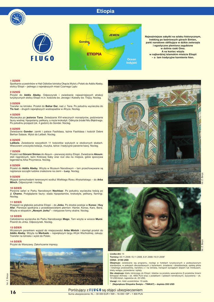 Etiopia JEMEN Gonder ETIOPIA Ocean Indyjski Najważniejsze zabytki na szlaku historycznym, trekking po baśniowych górach Simien, parki narodowe obfitujące w dzikie zwierzęta i egzotyczne plemiona zagubione w dolinie rzeki Omo. A na koniec wizyta w najbardziej islamskim mieście Etiopii – a tam tradycyjne karmienie hien. 1 DZIEŃ Spotkanie uczestników w Hali Odlotów lotniska Okęcie.Wylot z Polski do Addis Abeby, stolicy Etiopii – jednego z największych miast Czarnego Lądu 2 DZIEŃ Przylot do Addis Abeby. Odpoczynek i zwiedzanie najważniejszych atrakcji turystycznych stolicy Etiopii m.in. kościoła św. Jerzego i Katedry św. Trójcy. Nocleg. 3 DZIEŃ Transfer na lotnisko. Przelot do Bahar Dar, nad J. Tana. Po południu wycieczka do Tis Isat – drugich największych wodospadów w Afryce. Nocleg. 4 DZIEŃ Wycieczka po jeziorze Tana. Zwiedzanie XVI-wiecznych monastyrów, podziwianie fauny wodnej: hipopotamy, pelikany, a może krokodyli. Odkrycie źródel Nilu Błękitnego. Po południu przejazd (ok. 4 godzin) do Gonder. Nocleg. 5 DZIEŃ Zwiedzanie Gonder: zamki i pałace Fasilidasa, łaźnie Fasilidasa i kościół Debre Berhan Salasie. Wylot do Lalibeli. Nocleg. 6 DZIEŃ Lalibela. Zwiedzanie wszystkich 11 kościołów wykutych w okolicznych skałach. Wieczorem uroczysta kolacja, muzyka, tańce i tradycyjne parzenie kawy. Nocleg. 7 DZIEŃ Przelot nad Górami Simien do Aksum – pierwszej stolicy Etiopii. Zwiedzanie Aksum: steli nagrobnych, łaźni Królowej Saby oraz rzut oka na miejsce, gdzie spoczywa legendarna Arka Przymierza. Nocleg. fot. Z. Borys 8 DZIEŃ Przelot do Addis Abeby. Wizyta w Muzeum Narodowym – tam przechowywane są najstarsze szczątki ludzkie znalezione na ziemi – Lucy. Nocleg. 9 DZIEŃ Wyjazd samochodami terenowymi wzdłuż Wielkiego Rowu Afrykańskiego – do Arba Minch. Odpoczynek i nocleg. 10 DZIEŃ Poranne safari w Parku Narodowym Nechisar. Po południu wycieczka łodzią po J. Chamo. Podglądanie fauny: stada hipopotamów, krokodyle, pelikany, flamingi. Nocleg. 11 DZIEŃ Przejazd na głębokie południe Etiopii – do Jinka. Po drodze postoje w Konso i Key Afar. Pierwsze spotkania z przedstawicielami plemion: Hamer, Konso, Karo, Bana. Wizyta w etiopskim „Nowym Jorku” – nietypowe formy skalne. Nocleg. 12 DZIEŃ Całodzienna wycieczka do Parku Narodowego Mago. Tam wizyta w wiosce Mursi. Powrót do Jinka. Odpoczynek. Nocleg. fot. Z. Borys 13 DZIEŃ Wczesnym porankiem wyjazd do miejscowości Arba Mintch i stamtąd przelot do Addis Abeby. Wizyta na Merkado – największym targu Afryki Wschodniej, zakupy. Transfer na lotnisko i wylot do Polski. 14 DZIEŃ Przylot do Warszawy. Zakończenie imprezy. fot. Z. Borys Liczba dni: 14 Terminy: 03.11.2008–16.11.2008, 6.01.2008–19.01.2008* CENA : 2195 USD Obejmuje: zwiedzanie wg programu, noclegi w hotelach turystycznych o podwyższonym standardzie, w pokojach dwuosobowych z łazienkami, śniadania i obiadokolacje, opiekę pilota i lokalnego przewodnika, transfery z i na lotniska, transport wynajętym dżipem lub minibusem, bilety wstępu, pozwolenia i opłaty. Nie obejmuje: biletu lotniczego do Etiopii i biletów na przeloty wewnętrzne (5 przelotów liniami Ethiopian Airlines) – ok. 4950 PLN wraz z podatkami i opłatami lotniskowymi, wyżywienia – ok. 10 USD/dzień, napiwków ok. 20 USD, Uwagi: min. ilość uczestników: 10 osób. * (Największe Etiopskie Święto – TIMKAT) – dopłata 200 USD 16 Poróżujący z są objęci ubezpieczeniem Suma ubezpieczenia: KL – 30 000 EUR • NW – 16 000 • BP – 1 800 PLN