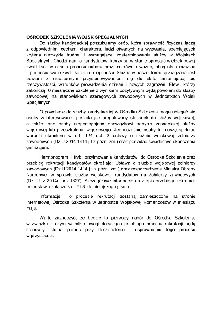 OŚRODEK SZKOLENIA WOJSK SPECJALNYCH Do służby kandydackiej poszukujemy osób, które sprawność fizyczną łączą z odpowiednimi cechami charakteru, ludzi otwartych na wyzwania, spełniających kryteria niezwykle trudnej i wymagającej zdeterminowania służby w Wojskach Specjalnych. Chodzi nam o kandydatów, którzy są w stanie sprostać wieloetapowej kwalifikacji w czasie procesu naboru oraz, co równie ważne, chcą stale rozwijać i podnosić swoje kwalifikacje i umiejętności. Służba w naszej formacji związana jest bowiem z nieustannym przystosowywaniem się do stale zmieniającej się rzeczywistości, warunków prowadzenia działań i nowych zagrożeń. Elewi, którzy zakończą 6 miesięczne szkolenie z wynikiem pozytywnym będą powołani do służby zawodowej na stanowiskach szeregowych zawodowych w Jednostkach Wojsk Specjalnych. O powołanie do służby kandydackiej w Ośrodku Szkolenia mogą ubiegać się osoby zainteresowane, posiadające uregulowany stosunek do służby wojskowej, a także inne osoby niepodlegające obowiązkowi odbycia zasadniczej służby wojskowej lub przeszkolenia wojskowego. Jednocześnie osoby te muszę spełniać warunki określone w art. 124 ust. 2 ustawy o służbie wojskowej żołnierzy zawodowych (Dz.U.2014.1414 j.t z późn. zm.) oraz posiadać świadectwo ukończenia gimnazjum. Harmonogram i tryb przyjmowania kandydatów do Ośrodka Szkolenia oraz przebieg rekrutacji kandydatów określają: Ustawa o służbie wojskowej żołnierzy zawodowych (Dz.U.2014.1414 j.t z późn. zm.) oraz rozporządzenie Ministra Obrony Narodowej w sprawie służby wojskowej kandydatów na żołnierzy zawodowych (Dz. U. z 2014r. poz.1627). Szczegółowe informacje oraz opis przebiegu rekrutacji przedstawia załącznik nr 2 i 3 do niniejszego pisma. Informacje o procesie rekrutacji zostaną zamieszczone na stronie internetowej Ośrodka Szkolenia w Jednostce Wojskowej Komandosów w miesiącu maju. Warto zaznaczyć, że będzie to pierwszy nabór do Ośrodka Szkolenia, w związku z czym wszelkie uwagi dotyczące przebiegu procesu rekrutacji będą stanowiły istotną pomoc przy doskonaleniu i usprawnieniu tego procesu w przyszłości. SZCZEGÓŁOWE INFORMACJE ORAZ OPIS PRZEBIEG REKRUTACJI I. Diagram przebiegu rekrutacji: Kandydaci 1) koniecznie rejestracja na stronie Ośrodka Szkolenia 2) złożenie wniosku wraz z załącznikami do Dyrektor Departamentu MON właściwego ds. kadr za pośrednictwem właściwego WKU W terminie do 30.09.2016 Dyrektor Departamentu MON właściwego ds. kadr za pośrednictwem właściwego WKU : - wniosek ( Załącznik nr 1) - świadectwo ukończenia szkoły - życiorys - odpis skrócony aktu urodzenia - informacja o osobie z Krajowego Rejestru Karnego – nie wcześniej niż 30 dni przed rozpoczęciem rekrutacji (może być dostarczone bezpośrednio przed rozpoczęciem rekrutacji) - inne dokumenty potwierdzające posiadane kwalifikacje, uprawnienia lub umiejętności Komendant OSz - wnioski wraz z załącznikami do OSz WKU - informacja Komendant OSz Powołanie komisji rekrutacyjnej. Kandydaci - informacja o przeprowadzeniu rekrutacji 14 dni przed rekrutacją Komisja rekrutacyjna EGZAMINY (skala punktów w poszczególnych elementach od 1-10) Sprawność fizyczna: - siła, szybkość, wytrzymałość WKU - skierowanie do wojskowej komisji lekarskiej/wojskowej komisji psychologicznej – ustalenie zdolności do zawodowej służby wojskowej Analiza ocen na świadectwie gimnazjalnym Komendant OSz Informacja do WKU o wstępnym zakwalifikowaniu WKU orzeczenie nie później niż do 15.12.2016r. Komisja rekrutacyjna Zakończenie postępowania rekrutacyjnego Rozmowa kwalifikacyjna - predyspozycje, wiedze i motywacje Kandydaci niezakwalifikowani Decyzja o niezakwalifikowaniu do 14 dni od zakończenia postępowania Kandydaci zakwalifikowani Zaświadczenie o zakwalifikowaniu UWAGA! do 7 dni od zakończenia postępowania WKU Kopia zaświadczeń i decyzji II. Wymagania dotyczące kandydatów: 1. O powołanie do służby kandydackiej w Ośrodku Szkolenia mogą ubiegać się osoby zainteresowane, posiadające uregulowany stosunek do służby wojskowej, a także inne osoby niepodlegające obowiązkowi odbycia zasadniczej służby wojskowej lub przeszkolenia wojskowego; 2. Spełniające warunki określone w art. 124 ust.2 ustawy o służbie wojskowej żołnierzy zawodowych (Dz.U.2014.1414 j.t z późn. zm.); a) niekaralny sądownie, b) posiada obywatelstwo polskie, c) zdolność fizyczną i psychiczną do zawodowej służby wojskowej, d) wiek co najmniej 18 lat. 3. Ukończone gimnazjum – załączone świadectwo ukończenia gimnazjum do wniosku – warunek konieczny – w przypadku ukończenia szkoły ponadgimnazjalnej, studiów wyższych świadectwo lub dyplom dołączyć dodatkowo jako załącznik. 4. Dodatkowe punktowane umiejętności jak np. znajomość języka obcego, prawo jazdy kat. C, C+E, inne kursy i szkolenia, dodatkowe uprawnienie oraz dodatkowe kwalifikacje (technik: informatyk/elektronik, gastronom, ratownik medyczny) oraz świadectwa ukończenia szkoły średniej lub dyplomu studiów. III. Inne ważne informacje: 1. Ośrodek Szkolenia nie zapewnia przejazdu, wyżywienia oraz noclegów w czasie egzaminów; 2. Kandydaci mają obowiązek zarejestrować się na stronie internetowej Ośrodka Szkolenia w Jednostce Wojskowej Komandosów (www.commando.mil.pl – planowane uruchomienie rejestracji elektronicznej czerwiec 2016r.) 3. Planowany termin egzaminów przełom październik-listopad 2016 r. (szczegółowa informacja zostanie umieszczona na stronie internetowej po ustaleniu ilości kandydatów); 4. Warunkiem powołania osoby zakwalifikowanej do służby kandydackiej w Ośrodku Szkolenia będzie podpisanie umowy określającej warunki zwrotu poniesionych kosztów na jej utrzymanie i naukę, zgodnie z art. 124 ust. 6 ustawy o służbie wojskowej żołnierzy zawodowych; Egzaminy będą przeprowadzane w JWK w Lublińcu; Okres szkolenia: 6 miesi