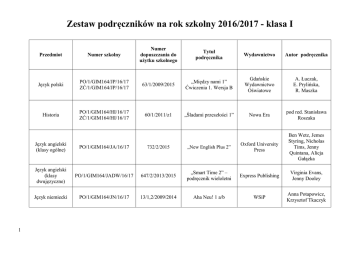 Zestaw podręczników na rok szkolny 2016/2017 - klasa I 1 Przedmiot Numer szkolny Numer dopuszczania do użytku szkolnego Język polski PO/1/GIM164/JP/16/17 ZĆ/1/GIM164/JP/16/17 63/1/2009/2015 „Między nami 1” Ćwiczenia 1. Wersja B Gdańskie Wydawnictwo Oświatowe A. Łuczak, E. Prylińska, R. Maszka Historia PO/1/GIM164/HI/16/17 ZĆ/1/GIM164/HI/16/17 60/1/2011/z1 „Śladami przeszłości 1” Nowa Era pod red. Stanisława Roszaka Tytuł podręcznika Wydawnictwo Autor podręcznika Język angielski (klasy ogólne) PO/1/GIM164/JA/16/17 732/2/2015 „New English Plus 2” Oxford University Press Ben Wetz, Jemes Styring, Nicholas Tims, Jenny Quintana, Alicja Gałązka Język angielski (klasy dwujęzyczne) PO/1/GIM164/JADW/16/17 647/2/2013/2015 „Smart Time 2” – podręcznik wieloletni Express Publishing Virginia Evans, Jenny Dooley Język niemiecki PO/1/GIM164/JN/16/17 13/1,2/2009/2014 Aha Neu! 1 a/b WSiP Anna Potapowicz, Krzysztof Tkaczyk Język francuski 654/1/2013/2015 Pourquoi Pas ! 1. Lektor Klett Język hiszpański PO/1/GIM164/HI/16/17 709/1/2014 Espacio joven A1 Nowela Sp. Z o.o. Cabeza Sanchez Maria, F. Vargas, L. Martinez, A. Aragon, E. Mora Język rosyjski PO/1/GIM164/ROS/16/17 97/2009 Echo 1 WSiP Beata GawęckaAjchel 168/1/2009 „Matematyka z plusem” – podręcznik „Matematyka z plusem” - Zbiór zadań dla kl. 1. „Matematyka z plusem” - ćwiczenia dla kl. 1. Gdańskie Wydawnictwo Oświatowe podręcznik Małgorzata Dobrowolska zbiór zadań - Marcin Braun, Jacek Lech ćwiczenia - Jacek Lech Gdańskie Wydawnictwo Oświatowe podręcznik - K. Horodecki, A. Ludnikowski zadania - J. Gondek, H. Majek, B. Pranszke Nowa Era Jan Kulawik, Teresa Kulawik, Maria Litwin Matematyka Fizyka Chemia 2 PO/1/GIM164/FR/16/17 Michèle Bosquet Matilde Sallès Yolanda Rennes PO/1/GIM164/MA/16/17 ZD/1/GIM164/MA/16/17 PO/1/GIM164/FI/16/17 ZD//GIM164/FI/16/17 PO/1/GIM164/CH/16/17 214/1/2009 49/1/2009/2014 Fizyka z plusem 1 + Zbiór zadań – Fizyka 1 “Chemia Nowej Ery” 5/1/2009 Podręcznik z płytą CD „Puls ziemi 1” Zeszyt ćwiczeń – „Puls Ziemi 1” Nowa Era podręcznik - Roman Malarz ćwiczenia - Joanna i Stanisław Osikowie, Anna Wawrzkowicz PO/1/GIM164/BIO/16/17 58/1/2009/2015 „Puls życia” Nowa Era Małgorzata Jefimow, Marian Sęktas Plastyka PO/1/GIM164/PLA/16/17 68/2009 „Bliżej sztuki” WSiP Stanisław K. Stopczyk Muzyka PO/1/GIM164/MU/16/17 81/2009 Świat muzyki WSiP Wacław Panek Religia PO/1/GIM164/RE/16/17 AZ-31-01/10-WA1/12 „Twoje Słowo jest światłem na mojej drodze” Wydawnictwo Katechetyczne Warszawa Ks. Piotr Tomasik Geografia PO/1/GIM164/GE/16/17 ZĆ/1/GIM164/GE/16/17 Biologia Dopuszczam do użytku szkolnego w Gimnazjum nr 164 z Oddziałami Integracyjnymi i Oddziałami Dwujęzycznymi im. „Polskich Olimpijczyków” powyższe podręczniki przeznaczone do kształcenia ogólnego. Zawierają one systematyczną prezentację wszystkich lub wybranych treści nauczania z zakresu danych zajęć edukacyjnych na określonym etapie kształceni, ujętych w podstawie programowej kształcenia ogólnego, opisanych szczegółowo jako przedmiot, ścieżka edukacyjna, blok przedmiotowy lub moduł, z zastrzeżeniem ust.2 i 3. oraz wymagań szczegółowych wynikających z podstawy programowej z wymienionych przedmiotów dopuszczonej Rozporządzeniem Ministra Edukacji Narodowej z dnia 21 czerwca 2012r.. (Dz.U. z dnia 3 lipca 2012 poz.752) 3