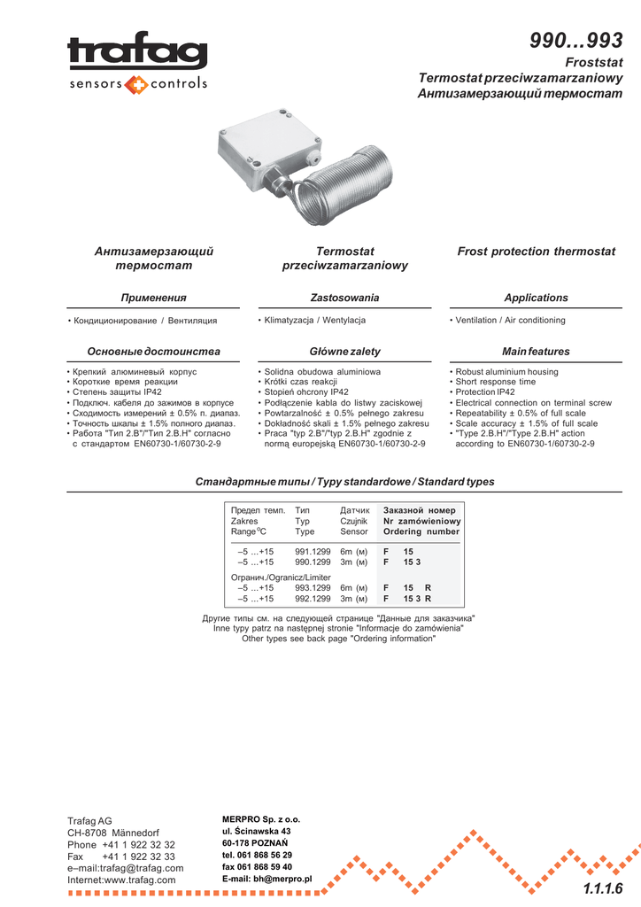 990...993 Froststat Termostat przeciwzamarzaniowy Антизамерзающий термостат Антизамерзающий термостат Termostat przeciwzamarzaniowy Frost protection thermostat Применения Zastosowania Applications • Klimatyzacja / Wentylacja • Кондиционирование / Вентиляция Основные достоинства • • • • • • • • Ventilation / Air conditioning Główne zalety Крепкий алюминевый корпус Короткие время реакции Степень защиты IP42 Подключ. кабеля до зажимов в корпусе Сходимость измерений ± 0.5% п. диапаз. Точность шкалы ± 1.5% полного диапаз. Работа "Tип 2.B"/"Tип 2.B.H" согласно с стандартом EN60730-1/60730-2-9 • • • • • • • Main features Solidna obudowa aluminiowa Krótki czas reakcji Stopień ohcrony IP42 Podłączenie kabla do listwy zaciskowej Powtarzalność ± 0.5% pełnego zakresu Dokładność skali ± 1.5% pełnego zakresu Praca "typ 2.B"/"typ 2.B.H" zgodnie z normą europejską EN60730-1/60730-2-9 • • • • • • • Robust aluminium housing Short response time Protection IP42 Electrical connection on terminal screw Repeatability ± 0.5% of full scale Scale accuracy ± 1.5% of full scale "Type 2.B.H"/"Type 2.B.H" action according to EN60730-1/60730-2-9 Стандартные типы / Typy standardowe / Standard types Предел темп. Zakres Range oC Tип Typ Type Датчик Czujnik Sensor Заказной номер Nr zamówieniowy Ordering number 991.1299 990.1299 6m (м) 3m (м) F F 15 15 3 Огранич./Ogranicz/Limiter –5 ...+15 993.1299 –5 ...+15 992.1299 6m (м) 3m (м) F F 15 R 15 3 R –5 ...+15 –5 ...+15 Другие типы см. на следующей странице "Данные для заказчика" Inne typy patrz na następnej stronie "Informacje do zamówienia" Other types see back page "Ordering information" Trafag AG CH-8708 Männedorf Phone +41 1 922 32 32 Fax +41 1 922 32 33 e–mail:[email protected] Internet:www.trafag.com MERPRO Sp. z o.o. ul. Ścinawska 43 60-178 POZNAŃ tel. 061 868 56 29 fax 061 868 59 40 E-mail: [email protected] 1.1.1.51.1.1.6 990...993 Froststat Termostat przeciwzamarzaniowy Антизамерзающий термостат Данные для заказчика / Informacje do zamówienia / Ordering information Стандартные вариянты см. первую сторону / Wykonania standardowe patrz str. Nr 1 / Standard types see front page XXX.XXXX.XX... Микроперекл. Предел Mikrołącznik Z a k r e s Switch Range 6m 3m 6m, Огранич./Ogranicznik/Limiter 3m, Огранич./Ogranicznik/Limiter Степень защиты / Stopień ochrony / Protection level IP65 Монтаж. захват капиллярной трубки / Uchwyt kapilary / Capillary holder 991.1299 990.1299 993.1299 992.1299 6 Штук/sztuk/pcs. 20 K80140 H72123a Trafag AG 2001/05 Аксесуары Akcesoria Accessories Датчик/Czujnik/Sensor Датчик/Czujnik/Sensor Датчик/Czujnik/Sensor Датчик/Czujnik/Sensor Другие варианты по заказу/ Inne wykonania na życzenie/ Other variations on request We reserve the right to make alterations as technical progress may warrant. Tип Typ Type 990...993 Froststat Termostat przeciwzamarzaniowy Антизамерзающий термостат Тежническая характеристика 1-ст. термостат для мониторнинга температуры около °Ц, обезпечивающий водные нагреватели перед замерзанием. Условия окружающей среды Темп. работы: Темп. хранения: –15...+ 70 °C –25...+ 70 °C Макс. темп. датчика.: 140 °C Влажность: max. 95% rel. Степень защиты: IP 42 Минимальная активная длина датчика: 30cm Механические данные Матерял корпуса: Матерял датчика: Электр. зажимы: Вес: AlSi9Pb3 Cu 3x1.5мм около 850 г Charakterystyka techniczna Jednostopniowy regulator do kontrolowania temperatury około °C, celem zabezpieczenia nagrzewnic wodnych przed zamarzaniem. Warunki środowiska Specifications Single stage temperature controller for monitoring temperature around 0°C, i. e. to prevent ice build-up on air heaters. Environmental conditions Temperatura pracy: –15...+ 70 °C Temperatura skład.: –25...+ 70 °C Operating temperature: –15...+ 70 °C Storage temperature: –25...+ 70 °C Max. temp.czujnika Wilgotność wzgl. Stopień ochrony: Minimalna aktywna długość czujnika: Sensor max.: Humidity: Protection: Sensor reponse length : +140 °C 95% max. IP 42 około 30cm Dane mechaniczne Materiał obudowy: Materaił czujnika: Zaciski podłącz.: Pozycja montażu : Masa: AlSi9Pb3 Cu 3x1.5mm˛ (przewody) dowolna około 850 g 140 °C max. 95% rel. IP 42 approx. 30cm Physical data Housing material: Sensor material: Connections: Installation: Weight: AlSi9Pb3 Cu 3x1.5mm˛ (wires) Position unspecified approx. 850 g Данные микропереключателя / Dane mikrołącznika elektrycznego / Electrical data switch Tип Typ Type Характеристика Charakterystyka Features 12 Высокая виброустойчивость; большой гистерезис Wysoka odporność na wibracje, duża histereza załączeniowa High vibration resistance; big switching differential Номинальное значение Dane znamionowe Rating AC DC 380 V 15 (3) A 2= 3= Ограничителя/Limiter/Limiter & 992/993 220 110 24 12 V 0.2(0.02) A V 0.4(0.03) A V 6 (2) A V 15 (8) A 2 1 3 990 / 991 1.1.1.51.1.1.6 990...993 Froststat Termostat przeciwzamarza
