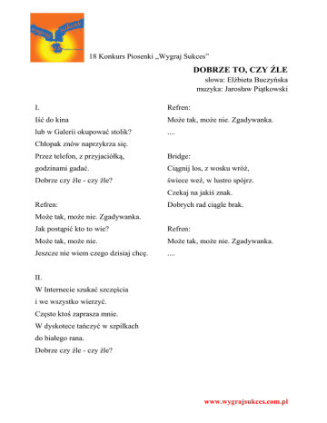 18 Konkurs Piosenki „Wygraj Sukces” DOBRZE TO, CZY ŹLE słowa: Elżbieta Buczyńska muzyka: Jarosław Piątkowski I. Refren: Iść do kina Może tak, może nie. Zgadywanka. lub w Galerii okupować stolik? .... Chłopak znów naprzykrza się. Przez telefon, z przyjaciółką, Bridge: godzinami gadać. Ciągnij los, z wosku wróż, Dobrze czy źle - czy źle? świece weź, w lustro spójrz. Czekaj na jakiś znak. Refren: Dobrych rad ciągle brak. Może tak, może nie. Zgadywanka. Jak postąpić kto to wie? Refren: Może tak, może nie. Może tak, może nie. Zgadywanka. Jeszcze nie wiem czego dzisiaj chcę. .... II. W Internecie szukać szczęścia i we wszystko wierzyć. Często ktoś zaprasza mnie. W dyskotece tańczyć w szpilkach do białego rana. Dobrze czy źle - czy źle? www.wygrajsukces.com.pl