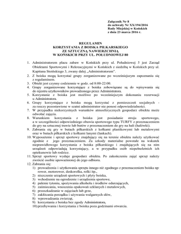 Załącznik Nr 8 do uchwały Nr XX/194/2016 Rady Miejskiej w Końskich z dnia 23 marca 2016 r. REGULAMIN KORZYSTANIA Z BOISKA PIŁKARSKIEGO ZE SZTUCZNĄ NAWIERZCHNIĄ W KOŃSKICH PRZY UL. POŁUDNIOWEJ 80 1. Administratorem placu zabaw w Końskich przy ul. Południowej 5 jest Zarząd Obiektami Sportowymi i Rekreacyjnymi w Końskich z siedzibą w Końskich przy ul. Kapitana Stoińskiego 3, zwany dalej „Administratorem”. 2. Z boiska mogą korzystać grupy zorganizowane po wcześniejszym zapoznaniu się z regulaminem. 3. Obiekt jest czynny codziennie w godz. od 8:00-22:00. 4. Grupy zorganizowane korzystające z boiska zobowiązane są do wpisywania się do rejestru użytkowników prowadzonego przez Administratora. 5. Korzystanie z boiska jest możliwe po wcześniejszym dokonaniu rezerwacji u Administratora. 6. Grupy korzystające z boiska mogą korzystać z pomieszczeń socjalnych za rzeczy pozostawione w szatni administrator nie ponosi odpowiedzialności. 7. W przypadku niekorzystnych warunków atmosferycznych gospodarz obiektu może odwołać zajęcia. 8. Warunkiem korzystania z boiska jest posiadanie stroju sportowego, a w szczególności odpowiedniego obuwia sportowego typu TURFY z przeznaczeniem do gry na sztucznej trawie lub butów z przeznaczeniem do gry na hali (halówki). 9. Zabrania się gry w butach piłkarskich z kołkami plastikowymi lub metalowymi oraz w butach piłkarskich z kołkami lanymi (lankach). 10. Wyposażenie i sprzęt sportowy znajdujący się na terenie obiektu należy użytkować zgodnie z jego przeznaczeniem. Za szkody materialne powstałe na wskutek nieprawidłowego korzystania z boiska piłkarskiego i znajdujących się na nim urządzeń odpowiadają korzystający, a w przypadku osób niepełnoletnich ich opiekunowie lub rodzice. 11. Sprzęt sportowy wydaje gospodarz obiektu. Po zakończeniu zajęć sprzęt należy zwrócić osobie upoważnionej do jego odbioru. 12. Zabrania się: 1) prowadzenia i użytkowania sprzętu innego niż zgodnego z przeznaczeniem boiska np: rower, motorower, deskorolka, rolki itp., 2) niszczenie urządzeń sportowych i płyty boiska, 3) wchodzenie na ogrodzenie i urządzenia sportowe, 4) palenie tytoniu, spożywania alkoholu i środków odurzających, 5) zaśmiecania, wnoszenia opakowań szklanych i metalowych, 6) przeszkadzanie w zajęciach lub grze, 7) zakłócania porządku i używania wulgarnych słów, 8) wprowadzania zwierząt, 9) korzystania z boiska bez zgody Administratora, 10) przebywania i korzystania z boiska poza godzinami otwarcia. 13. Administrator nie ponosi odpowiedzialności za wypadki powstałe w trakcie korzystania z obiektu. 14. Użytkownicy korzystają z boiska na własną odpowiedzialność i odpowiadają materialnie za wyrządzone szkody. 15. Prowadzący zajęcia (nauczyciel, trener, trener środowiskowy) jest zobowiązany powiadomić Administratora o każdym zaistniałym wypadku lub kontuzji ćwiczącego. 16. Korzystający z obiektu są zobowiązani do bezwzględnego przestrzegania regulaminu przepisów p.poż., i bhp, a w szczególności stosować się do uwag gospodarza obiektu. Przewodniczący Rady Miejskiej Zbigniew Kowalczyk