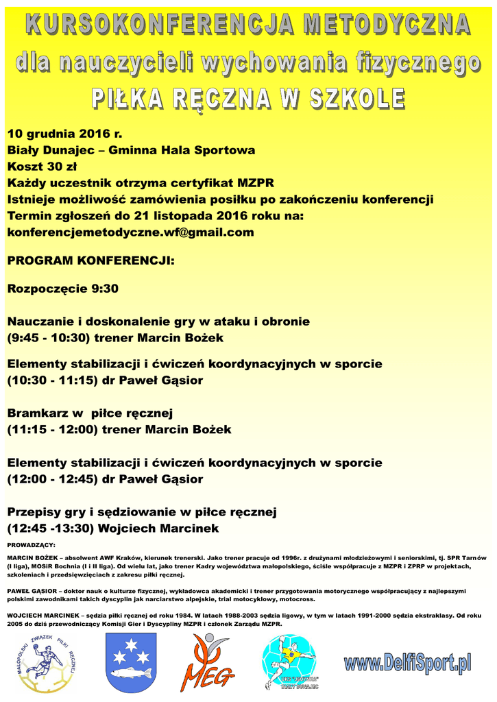 10 grudnia 2016 r. Biały Dunajec – Gminna Hala Sportowa Koszt 30 zł Każdy uczestnik otrzyma certyfikat MZPR Istnieje możliwość zamówienia posiłku po zakończeniu konferencji Termin zgłoszeń do 21 listopada 2016 roku na: [email protected] PROGRAM KONFERENCJI: Rozpoczęcie 9:30 Nauczanie i doskonalenie gry w ataku i obronie (9:45 - 10:30) trener Marcin Bożek Elementy stabilizacji i ćwiczeń koordynacyjnych w sporcie (10:30 - 11:15) dr Paweł Gąsior Bramkarz w piłce ręcznej (11:15 - 12:00) trener Marcin Bożek Elementy stabilizacji i ćwiczeń koordynacyjnych w sporcie (12:00 - 12:45) dr Paweł Gąsior Przepisy gry i sędziowanie w piłce ręcznej (12:45 -13:30) Wojciech Marcinek PROWADZĄCY: MARCIN BOŻEK – absolwent AWF Kraków, kierunek trenerski. Jako trener pracuje od 1996r. z drużynami młodzieżowymi i seniorskimi, tj. SPR Tarn ów (I liga), MOSiR Bochnia (I i II liga). Od wielu lat, jako trener Kadry województwa małopolskiego, ściśle współpracuje z MZPR i ZPRP w projektach, szkoleniach i przedsięwzięciach z zakresu piłki ręcznej. PAWEŁ GĄSIOR – doktor nauk o kulturze fizycznej, wykładowca akademicki i trener przygotowania motorycznego współpracujący z najlepszymi polskimi zawodnikami takich dyscyplin jak narciarstwo alpejskie, trial motocyklowy, motocross. WOJCIECH MARCINEK – sędzia piłki ręcznej od roku 1984. W latach 1988-2003 sędzia ligowy, w tym w latach 1991-2000 sędzia ekstraklasy. Od roku 2005 do dziś przewodniczący Komisji Gier i Dyscypliny MZPR i członek Zarządu MZPR. Partnerzy: