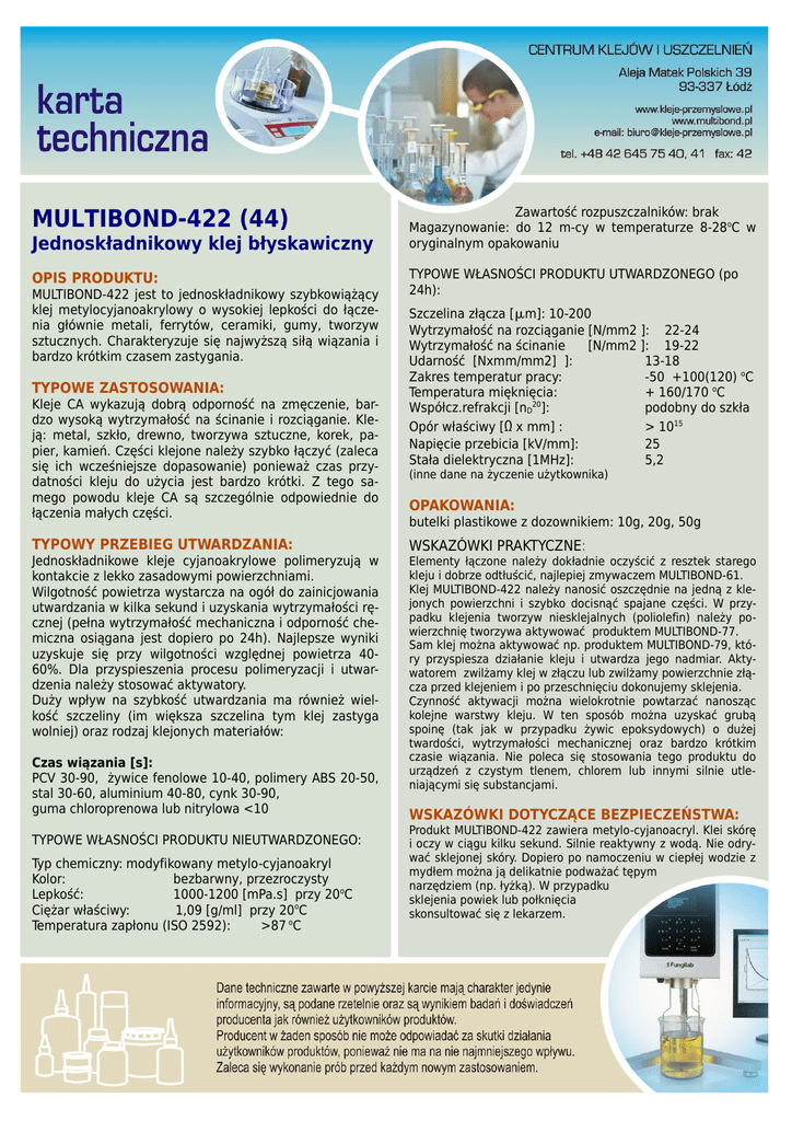 MULTIBOND-422 (44) Jednoskładnikowy klej błyskawiczny OPIS PRODUKTU: MULTIBOND-422 jest to jednoskładnikowy szybkowiążący klej metylocyjanoakrylowy o wysokiej lepkości do łączenia głównie metali, ferrytów, ceramiki, gumy, tworzyw sztucznych. Charakteryzuje się najwyższą siłą wiązania i bardzo krótkim czasem zastygania. TYPOWE ZASTOSOWANIA: Kleje CA wykazują dobrą odporność na zmęczenie, bardzo wysoką wytrzymałość na ścinanie i rozciąganie. Kleją: metal, szkło, drewno, tworzywa sztuczne, korek, papier, kamień. Części klejone należy szybko łączyć (zaleca się ich wcześniejsze dopasowanie) ponieważ czas przydatności kleju do użycia jest bardzo krótki. Z tego samego powodu kleje CA są szczególnie odpowiednie do łączenia małych części. TYPOWY PRZEBIEG UTWARDZANIA: Jednoskładnikowe kleje cyjanoakrylowe polimeryzują w kontakcie z lekko zasadowymi powierzchniami. Wilgotność powietrza wystarcza na ogół do zainicjowania utwardzania w kilka sekund i uzyskania wytrzymałości ręcznej (pełna wytrzymałość mechaniczna i odporność chemiczna osiągana jest dopiero po 24h). Najlepsze wyniki uzyskuje się przy wilgotności względnej powietrza 4060%. Dla przyspieszenia procesu polimeryzacji i utwardzenia należy stosować aktywatory. Duży wpływ na szybkość utwardzania ma również wielkość szczeliny (im większa szczelina tym klej zastyga wolniej) oraz rodzaj klejonych materiałów: Czas wiązania [s]: PCV 30-90, żywice fenolowe 10-40, polimery ABS 20-50, stal 30-60, aluminium 40-80, cynk 30-90, guma chloroprenowa lub nitrylowa <10 TYPOWE WŁASNOŚCI PRODUKTU NIEUTWARDZONEGO: Typ chemiczny: modyfikowany metylo-cyjanoakryl Kolor: bezbarwny, przezroczysty Lepkość: 1000-1200 [mPa.s] przy 20oC Ciężar właściwy: 1,09 [g/ml] przy 20oC Temperatura zapłonu (ISO 2592): >87 oC Zawartość rozpuszczalników: brak Magazynowanie: do 12 m-cy w temperaturze 8-28oC w oryginalnym opakowaniu TYPOWE WŁASNOŚCI PRODUKTU UTWARDZONEGO (po 24h): Szczelina złącza [m]: 10-200 Wytrzymałość na rozciąganie [N/mm2 ]: 22-24 Wytrzymałość na ścinanie [N/mm2 ]: 19-22 Udarność [Nxmm/mm2] ]: 13-18 Zakres temperatur pracy: -50 +100(120) oC Temperatura mięknięcia: + 160/170 oC 20 Współcz.refrakcji [nD ]: podobny do szkła Opór właściwy [ x mm] : > 1015 Napięcie przebicia [kV/mm]: 25 Stała dielektryczna [1MHz]: 5,2 (inne dane na życzenie użytkownika) OPAKOWANIA: butelki plastikowe z dozownikiem: 10g, 20g, 50g WSKAZÓWKI PRAKTYCZNE: Elementy łączone należy dokładnie oczyścić z resztek starego kleju i dobrze odtłuścić, najlepiej zmywaczem MULTIBOND-61. Klej MULTIBOND-422 należy nanosić oszczędnie na jedną z klejonych powierzchni i szybko docisnąć spajane części. W przypadku klejenia tworzyw niesklejalnych (poliolefin) należy powierzchnię tworzywa aktywować produktem MULTIBOND-77. Sam klej można aktywować np. produktem MULTIBOND-79, który przyspiesza działanie kleju i utwardza jego nadmiar. Aktywatorem zwilżamy klej w złączu lub zwilżamy powierzchnie złącza przed klejeniem i po przeschnięciu dokonujemy sklejenia. Czynność aktywacji można wielokrotnie powtarzać nanosząc kolejne warstwy kleju. W ten sposób można uzyskać grubą spoinę (tak jak w przypadku żywic epoksydowych) o dużej twardości, wytrzymałości mechanicznej oraz bardzo krótkim czasie wiązania. Nie poleca się stosowania tego produktu do urządzeń z czystym tlenem, chlorem lub innymi silnie utleniającymi się substancjami. WSKAZÓWKI DOTYCZĄCE BEZPIECZEŃSTWA: Produkt MULTIBOND-422 zawiera metylo-cyjanoacryl. Klei skórę i oczy w ciągu kilku sekund. Silnie reaktywny z wodą. Nie odrywać sklejonej skóry. Dopiero po namoczeniu w ciepłej wodzie z mydłem można ją delikatnie podważać tępym narzędziem (np. łyżką). W przypadku sklejenia powiek lub połknięcia skonsultować się z lekarzem.
