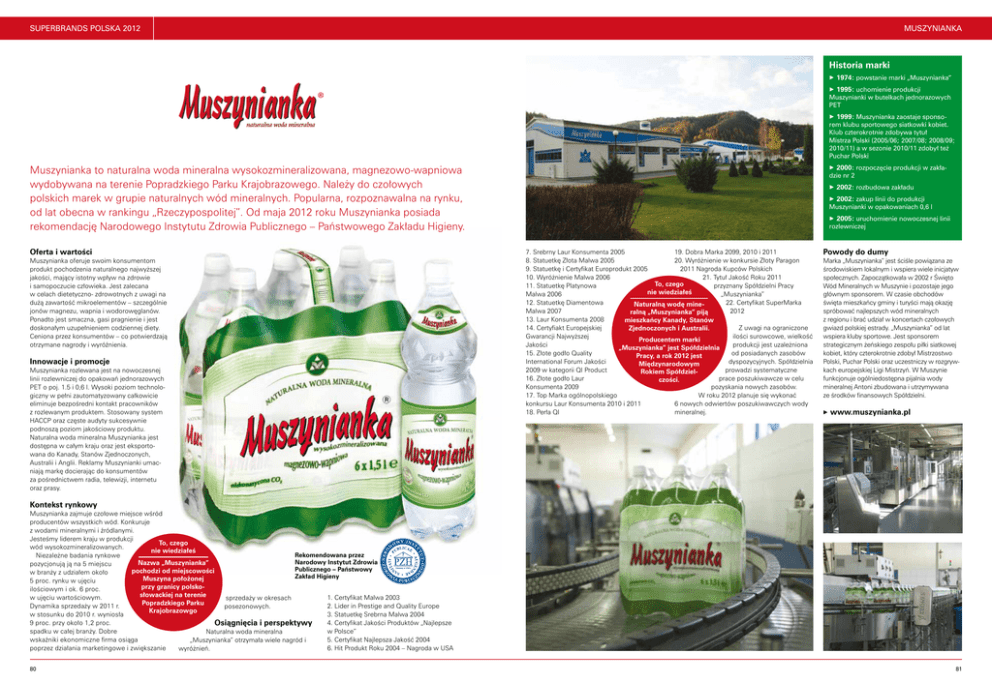 SUPERBRANDS POLSKA 2012 muszynianka Historia marki 1974: powstanie marki „Muszynianka” 1995: uchomienie produkcji Muszynianki w butelkach jednorazowych PET 1999: Muszynianka zaostaje sponsorem klubu sportowego siatkowki kobiet. Klub czterokrotnie zdobywa tytuł Mistrza Polski (2005/06; 2007/08; 2008/09; 2010/11) a w sezonie 2010/11 zdobył też Puchar Polski 2000: rozpoczęcie produkcji w zakładzie nr 2 Muszynianka to naturalna woda mineralna wysokozmineralizowana, magnezowo-wapniowa wydobywana na terenie Popradzkiego Parku Krajobrazowego. Należy do czołowych polskich marek w grupie naturalnych wód mineralnych. Popularna, rozpoznawalna na rynku, od lat obecna w rankingu „Rzeczypospolitej”. Od maja 2012 roku Muszynianka posiada rekomendację Narodowego Instytutu Zdrowia Publicznego – Państwowego Zakładu Higieny. Oferta i wartości Muszynianka oferuje swoim konsumentom produkt pochodzenia naturalnego najwyższej jakości, mający istotny wpływ na zdrowie i samopoczucie człowieka. Jest zalecana w celach dietetyczno- zdrowotnych z uwagi na dużą zawartość mikroelementów – szczególnie jonów magnezu, wapnia i wodorowęglanów. Ponadto jest smaczna, gasi pragnienie i jest doskonałym uzupełnieniem codziennej diety. Ceniona przez konsumentów – co potwierdzają otrzymane nagrody i wyróźnienia. Innowacje i promocje Muszynianka rozlewana jest na nowoczesnej linii rozlewniczej do opakowań jednorazowych PET o poj. 1.5 i 0,6 l. Wysoki poziom technologiczny w pełni zautomatyzowany całkowicie eliminuje bezpośredni kontakt pracowników z rozlewanym produktem. Stosowany system HACCP oraz częste audyty sukcesywnie podnoszą poziom jakościowy produktu. Naturalna woda mineralna Muszynianka jest dostępna w całym kraju oraz jest eksportowana do Kanady, Stanów Zjednoczonych, Australii i Anglii. Reklamy Muszynianki umacniają markę docierając do konsumentów za pośrednictwem radia, telewizji, internetu oraz prasy. 2002: rozbudowa zakładu 2002: zakup linii do produkcji Muszynianki w opakowaniach 0,6 l 2005: uruchomienie nowoczesnej linii rozlewniczej 19. Dobra Marka 2099, 2010 i 2011 7. Srebrny Laur Konsumenta 2005 20. Wyróżnienie w konkursie Złoty Paragon 8. Statuetkę Złota Malwa 2005 2011 Nagroda Kupców Polskich 9. Statuetkę i Certyfikat Europrodukt 2005 21. Tytuł Jakość Roku 2011 10. Wyróżnienie Malwa 2006 To, czego przyznany Spółdzielni Pracy 11. Statuetkę Platynowa nie wiedziałeś „Muszynianka” Malwa 2006 22. Certyfikat SuperMarka 12. Statuetkę Diamentowa Naturalną wodę mine2012 Malwa 2007 ralną „Muszynianka” piją 13. Laur Konsumenta 2008 mieszkańcy Kanady, Stanów Z uwagi na ograniczone 14. Certyfiakt Europejskiej Zjednoczonych i Australii. ilości surowcowe, wielkość Gwarancji Najwyższej Producentem marki produkcji jest uzależniona Jakości „Muszynianka” jest Spółdzielnia od posiadanych zasobów 15. Złote godło Quality Pracy, a rok 2012 jest dyspozycyjnych. Spółdzielnia International Forum Jakości Międzynarodowym prowadzi systematyczne 2009 w kategorii QI Product Rokiem Spółdzielprace poszukiwawcze w celu 16. Złote godło Laur czości. pozyskania nowych zasobów. Konsumenta 2009 W roku 2012 planuje się wykonać 17. Top Marka ogólnopolskiego 6 nowych odwiertów poszukiwawczych wody konkursu Laur Konsumenta 2010 i 2011 mineralnej. 18. Perła QI Powody do dumy Marka „Muszynianka” jest ściśle powiązana ze środowiskiem lokalnym i wspiera wiele inicjatyw społecznych. Zapoczątkowała w 2002 r Święto Wód Mineralnych w Muszynie i pozostaje jego głównym sponsorem. W czasie obchodów święta mieszkańcy gminy i turyści mają okazję spróbować najlepszych wód mineralnych z regionu i brać udział w koncertach czołowych gwiazd polskiej estrady. „Muszynianka” od lat wspiera kluby sportowe. Jest sponsorem strategicznym żeńskiego zespołu piłki siatkowej kobiet, który czterokrotnie zdobył Mistrzostwo Polski, Puchar Polski oraz uczestniczy w rozgrywkach europejskiej Ligi Mistrzyń. W Muszynie funkcjonuje ogólniedostępna pijalnia wody mineralnej Antoni zbudowana i utrzymywana ze środków finansowych Spółdzielni. www.muszynianka.pl Kontekst rynkowy Muszynianka zajmuje czołowe miejsce wśród producentów wszystkich wód. Konkuruje z wodami mineralnymi i źródlanymi. Jesteśmy liderem kraju w produkcji To, czego wód wysokozmineralizowanych. nie wiedziałeś Rekomendowana przez Niezależne badania rynkowe Narodowy Instytut Zdrowia Nazwa „Muszynianka” pozycjonują ją na 5 miejscu Publicznego – Państwowy pochodzi od miejscowości w branży z udziałem około Zakład Higieny Muszyna położonej 5 proc. rynku w ujęciu przy granicy polskoilościowym i ok. 6 proc. słowackiej na terenie 1. Certyfikat Malwa 2003 w ujęciu wartościowym. sprzedaży w okresach Popradzkiego Parku 2. Lider in Prestige and Quality Europe Dynamika sprzedaży w 2011 r. posezonowych. Krajobrazowgo 3. Statuetkę Srebrna Malwa 2004 w stosunku do 2010 r. wyniosła 4. Certyfikat Jakości Produktów „Najlepsze 9 proc. przy około 1,2 proc. Osiągnięcia i perspektywy w Polsce” spadku w całej branży. Dobre Naturalna woda mineralna 5. Certyfikat Najlepsza Jakość 2004 wskaźniki ekonomiczne firma osiąga „Muszynianka” otrzymała wiele nagród i 6. Hit Produkt Roku 2004 – Nagroda w USA poprzez działania marketingowe i zwiększanie wyróżnień. 80 81