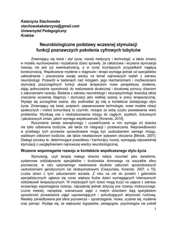 Katarzyna Stachowska [email protected] Uniwersytet Pedagogiczny Kraków Neurobiologiczne podstawy wczesnej stymulacji funkcji poznawczych pokolenia cyfrowych tubylców Zmieniający się świat i styl życia, rozwój medycyny i technologii, a także zmiany w modelu wychowywania i kształcenia dzieci sprawiły, że całościowa i wczesna stymulacja rozwoju nie jest już ewentualnością, a w coraz liczniejszych przypadkach naglącą koniecznością. Współczesne myślenie o diagnozie i terapii wymaga jednak od specjalistów uaktualniania i poszerzania swojej wiedzy na temat najnowszych badań z zakresu neurobiologii. Przewrót w badaniach nad mózgiem, jego mechanizmami i możliwościami stymulacji poszczególnych funkcji ukazał terapeutom nowe perspektywy działania, dając jednocześnie sposobność do realizowania skutecznej i docelowej pomocy dzieciom z zaburzeniami rozwoju. Badania z zakresu neurobiologii i neuropsychologii dowodzą także znaczenia wczesnej diagnozy i stymulacji jako wielkiej szansy w pracy terapeutycznej. Wydaje się szczególnie ważne, aby podkreślać jej rolę w kontekście dzisiejszego stylu życia. Zmieniający się świat, pośpiech, zaawansowane technologie, nowe modele relacji społecznych i metod komunikacji to czynniki, niosące ze sobą ryzyko powstawania wielu problemów. Wynikają one z niedostosowania mózgu do ciągłych, szybkich, ilościowych i jakościowych zmian, jakich wymaga współczesność [Korendo, 2010]. Rozumienie świata zewnętrznego i uczestniczenie w nim wymaga od dziecka nie tylko odbierania bodźców, ale także ich integracji i przetwarzania. Nieprawidłowości w przebiegu tych procesów spowodowane mogą być uszkodzeniem samego mózgu, wadliwym odbiorem bodźców, ale także niewłaściwym wpływem otoczenia [Bitniok, 2007]. Dlatego procesy te, determinujące prawidłowy i harmonijny rozwój, wymagają odpowiedniej stymulacji z uwzględnieniem najnowszej wiedzy neurobiologicznej. Wczesne wspomaganie rozwoju w kontekście współczesnego stylu życia Stymulację, czyli terapię małego dziecka należy rozumieć jako świadome, systemowe oddziaływanie specjalistów i środowiska domowego na wszystkie sfery poznawcze, w celu optymalnego niwelowania skutków zaburzeń spowodowanych uszkodzeniami genetycznymi lub okołoporodowymi [Cieszyńska, Korendo, 2007, s. 15]. Liczba dzieci z tymi zaburzeniami wzrasta. Z roku na rok do poradni i gabinetów specjalistycznych zgłasza się coraz większa liczba dzieci wymagających intensywnych oddziaływań terapeutycznych. W instytucjach tych dzieci mogą liczyć na zajęcia z zakresu wczesnego wspomagania rozwoju, najczęściej jednak dotyczą one rozwoju motorycznego. Liczne metody, narzędzia, scenariusze zajęć z małym dzieckiem dają specjalistom sposobność prowadzenia zajęć usprawniających i pobudzających aktywność ruchową. Niestety zaniedbywana jest sfera poznawcza – spostrzeganie, mowa, uczenie się, myślenie oraz pamięć. Wydaje się, że większość logopedów, pedagogów, psychologów nie potrafi 1 stymulować kompetencji kognitywnych u małych dzieci. Należy jednak podkreślić, że takie programy i narzędzia powstały i pozostają w zasięgu każdego specjalisty. Wychowywanie i rozwój dzieci w XXI w. różni się znacząco od tradycyjnego modelu sprzed ćwierćwiecza. Jednym z powodów przewrotu w relacjach społecznych i kulturowych są zaawansowane technologie. Telefony, smartfony, komputery, tablety, PlayStation, a przede wszystkim telewizja, to media determinujące codzienne życie, mające uprzywilejowane miejsce nie tylko w domu każdej rodziny, ale i w jej harmonogramie dnia. Codzienność współczesnej rodziny badacze porównują do dworca kolejowego: rodzice i dzieci żyją obok siebie, zajęci własnymi sprawami często nie zauważają swojej obecności. Wychodzą i przychodzą niezależnie od siebie o różnych porach. Jedyne chwile, w których są razem – nie licząc przejazdów samochodem – wypełnia nieustannie grający telewizor [Anderson, Wilkins, 2000, s. 30]. Wiek XXI to czas zaawansowanych technologii i ich oddziaływań na użytkowników. Stały kontakt z urządzeniami cyfrowymi pobudza przemiany komórek mózgowych i uwalnianie się neuroprzekaźników, wzmacniając stopniowo nowe szlaki neuronowe w naszych mózgach i osłabiając stare. Wskutek obecnej rewolucji technologicznej mózg zmienia się szybciej niż kiedykolwiek [Small, Vorgan, 2011]. Dlatego trzeba podkreślić, że wspomniana cyfrowa rewolucja przyniosła ze sobą nie tylko zauważalne modyfikacje w relacjach społecznych, ale także w sposobie spędzania wolnego czasu. Technologia zmienia także sposób myślenia, odczuwania, zachowania, a co najbardziej przerażające – wpływa na transformacje w budowie mózgu, modyfikując jednocześnie sposób jego działania. Najbardziej narażone na negatywne konsekwencje zmian w naszej codzienności są dzieci. Przecież ich prawidłowy rozwój poznawczy determinowany jest umiejętnością odbioru bodźców z otoczenia i przystosowaniem ich do własnych potrzeb. Nieprawidłowości w przebiegu tych procesów spowodowane mogą być uszkodzeniem samego mózgu, wadliwym odbiorem bodźców, ale także niewłaściwym wpływem otoczenia [Bitniok, 2007]. W szczególności ostatni wymieniony czynnik wiąże się ściśle z rewolucyjnymi zmianami naszej współczesności. Stąd postulat wczesnej, ukierunkowanej na holistyczny rozwój stymulacji funkcji poznawczych, która daje nadzieję na szybką pomoc nawet najmłodszym dzieciom przejawiającym zaburzenia w rozwoju. Mózgowa organizacja funkcji poznawczych – przetwarzanie bodźców Mózg, zasady jego funkcjonowania i jego wpływ na zachowanie to tematy pasjonujące specjalistów różnych dziedzin, nie tylko zajmujących się szeroko rozumianą neurobiologią. Ustalono, że nawet najprostsze zachowanie wymaga błyskawicznego i zsynchronizowanego działania wielu obszarów mózgu [Wró