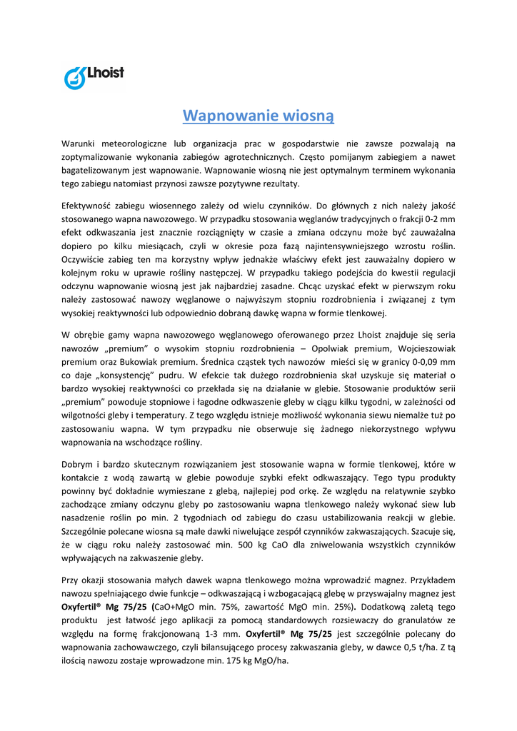 Wapnowanie wiosną Warunki meteorologiczne lub organizacja prac w gospodarstwie nie zawsze pozwalają na zoptymalizowanie wykonania zabiegów agrotechnicznych. Często pomijanym zabiegiem a nawet bagatelizowanym jest wapnowanie. Wapnowanie wiosną nie jest optymalnym terminem wykonania tego zabiegu natomiast przynosi zawsze pozytywne rezultaty. Efektywność zabiegu wiosennego zależy od wielu czynników. Do głównych z nich należy jakość stosowanego wapna nawozowego. W przypadku stosowania węglanów tradycyjnych o frakcji 0-2 mm efekt odkwaszania jest znacznie rozciągnięty w czasie a zmiana odczynu może być zauważalna dopiero po kilku miesiącach, czyli w okresie poza fazą najintensywniejszego wzrostu roślin. Oczywiście zabieg ten ma korzystny wpływ jednakże właściwy efekt jest zauważalny dopiero w kolejnym roku w uprawie rośliny następczej. W przypadku takiego podejścia do kwestii regulacji odczynu wapnowanie wiosną jest jak najbardziej zasadne. Chcąc uzyskać efekt w pierwszym roku należy zastosować nawozy węglanowe o najwyższym stopniu rozdrobnienia i związanej z tym wysokiej reaktywności lub odpowiednio dobraną dawkę wapna w formie tlenkowej. W obrębie gamy wapna nawozowego węglanowego oferowanego przez Lhoist znajduje się seria nawozów „premium” o wysokim stopniu rozdrobnienia – Opolwiak premium, Wojcieszowiak premium oraz Bukowiak premium. Średnica cząstek tych nawozów mieści się w granicy 0-0,09 mm co daje „konsystencję” pudru. W efekcie tak dużego rozdrobnienia skał uzyskuje się materiał o bardzo wysokiej reaktywności co przekłada się na działanie w glebie. Stosowanie produktów serii „premium” powoduje stopniowe i łagodne odkwaszenie gleby w ciągu kilku tygodni, w zależności od wilgotności gleby i temperatury. Z tego względu istnieje możliwość wykonania siewu niemalże tuż po zastosowaniu wapna. W tym przypadku nie obserwuje się żadnego niekorzystnego wpływu wapnowania na wschodzące rośliny. Dobrym i bardzo skutecznym rozwiązaniem jest stosowanie wapna w formie tlenkowej, które w kontakcie z wodą zawartą w glebie powoduje szybki efekt odkwaszający. Tego typu produkty powinny być dokładnie wymieszane z glebą, najlepiej pod orkę. Ze względu na relatywnie szybko zachodzące zmiany odczynu gleby po zastosowaniu wapna tlenkowego należy wykonać siew lub nasadzenie roślin po min. 2 tygodniach od zabiegu do czasu ustabilizowania reakcji w glebie. Szczególnie polecane wiosna są małe dawki niwelujące zespół czynników zakwaszających. Szacuje się, że w ciągu roku należy zastosować min. 500 kg CaO dla zniwelowania wszystkich czynników wpływających na zakwaszenie gleby. Przy okazji stosowania małych dawek wapna tlenkowego można wprowadzić magnez. Przykładem nawozu spełniającego dwie funkcje – odkwaszającą i wzbogacającą glebę w przyswajalny magnez jest Oxyfertil® Mg 75/25 (CaO+MgO min. 75%, zawartość MgO min. 25%). Dodatkową zaletą tego produktu jest łatwość jego aplikacji za pomocą standardowych rozsiewaczy do granulatów ze względu na formę frakcjonowaną 1-3 mm. Oxyfertil® Mg 75/25 jest szczególnie polecany do wapnowania zachowawczego, czyli bilansującego procesy zakwaszania gleby, w dawce 0,5 t/ha. Z tą ilością nawozu zostaje wprowadzone min. 175 kg MgO/ha.