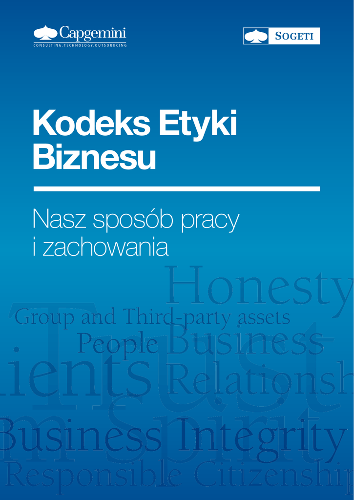 Kodeks Etyki Biznesu Nasz sposób pracy i zachowania 02. Jak posługiwać się Kodeksem Etyki Biznesu? Kodeks Etyki Biznesu pomaga wszystkim pracownikom zrozumieć istotę właściwego sposobu zachowania i postępowania. Jest to pewnego rodzaju szablon, służący pomocą w niejasnych sytuacjach. Niemożliwe jest przewidzenie i przygotowanie się na każdą sytuację biznesową, która może stanowić etyczny dylemat. Nie twierdzimy zatem, że dokument ten jest wyczerpujący i rozstrzygający. W dwóch obszarach, szczególnie wrażliwych na kwestie etyczne, a mianowicie uczciwa konkurencja oraz zwalczanie korupcji, istnieje określona przez Grupę szczegółowa strategia postępowania, komplementarna wobec wytycznych zawartych w Kodeksie Etyki Biznesu. Kodeks Etyki Biznesu nie wyklucza dokonywania własnych ocen sytuacji, dostarczając nam wszystkim przydatnych wskazówek. W razie wątpliwości, należy zadać sobie następujące pytania: >Czy jest to legalne? >Czy stwarza to wrażenie nielegalności lub braku rozwagi? >Czy jest to zgodne z wartościami Grupy i Blue Book? >Czy jest to zgodne z moimi własnymi wartościami? >Czy stanowi to naruszenie ogólnie przyjętych regulacji branżowych albo zwyczajowych zachowań w branży? >Czy dobrze czuję się w działaniu, które zamierzam podjąć? >Czy czułbym się dobrze, wyjaśniając swoje postępowanie kolegom z zespołu, liderowi zespołu, mojemu klientowi, swojej rodzinie lub np. prasie? Jeśli odpowiedź nie jest oczywista i nadal masz wątpliwości, podziel się tym z innymi. Zainicjowanie dialogu ze swoim przełożonym i kierownikiem działu personalnego jest właściwym sposobem podjęcia odpowiedniej decyzji i upewnienia się co do prawidłowości postępowania. Właściwy terytorialnie Ethics & Compliance Officer (Dyrektor ds. Etyki i Zgodności) oraz dział prawny także służą ci pomocą w wyjaśnianiu wątpliwości. Ich imiona i nazwiska dostępne są na stronach internetowych Grupy – linki w załączniku. >> Nasz Kodeks Etyki Biznesu jest przeznaczony dla wszystkich pracowników, wszystkich spółek Grupy, które w niniejszym dokumencie określane są zbiorowo jako „Grupa” .03 Spis treści Siedem wartosci leza na sercu wszystko, co robimy . . . . . . . . . . . . . . . . . . . . 04 Rada Dyrektorów Cap Gemini S.A. . . . . . . . . . . . . . 06 Message from the Founder . . . . . . . . . . . . . . . . . 08 Przesłanie od Prezesa Zarządu i Dyrektora Generalnego . . . . . . . . . . . . . . . . . . 10 Zaangażowanie naszego Komitetu Wykonawczego Grupy . . . . . . . . . . . . . . . . . . . 12 1. Kodeks Etyki Biznesu . . . . . . . . . . . 13 1.1 Czym jest Kodeks Etyki Biznesu? . . . . . . . . . . . . 14 1.2 Do kogo jest adresowany i jakie wyznacza nam role? . . 14 2. Ludzie . . . . . . . . . . . . . . . . . . . . . . . . 2.1 Zdrowie i bezpieczeństwo . . . . . . . . . . . . . . . . 2.2 Równość, różnorodność i włączanie . . . . . . . . . . . 2.3 Mobbing . . . . . . . . . . . . . . . . . . . . . . . . . 2.4 Otwarty dialog . . . . . . . . . . . . . . . . . . . . . . 2.5 Z achowanie w pracy i w trakcie imprez organizowanych przez firmę . . . . . . . . . . . . . . . 3. Uczciwy biznes . . . . . . . . . . . . . . . . 3.1 Uczciwa konkurencja . . . . . . . . . . . . . . . . . . . 3.2 Łapownictwo i korupcja . . . . . . . . . . . . . . . . . 3.3 Konflikt interesów . . . . . . . . . . . . . . . . . . . . . 3.4 Nielegalny obrót akcjami . . . . . . . . . . . . . . . . . Omów temat z prawnikiem z działu prawnego: Jeśli masz jakąś kwestię związaną z nielegalnym obrotem akcjami, nie zatrzymuj tego dla siebie. Powinieneś omówić ją bezpośrednio z prawnikiem działu prawnego. 15 16 17 18 19 20 21 22 24 26 27 3.5 D okładna i prawidłowa informacja biznesowa i finansowa . . . . . . . . . . . . . . . . . . . . . . . . 28 3.6 Działalność polityczna . . . . . . . . . . . . . . . . . . 29 4. Stosunki biznesowe . . . . . . . . . . . . 4.1 Praca z klientami . . . . . . . . . . . . . . . . . . . . . 4.2 Praca z partnerami biznesowymi . . . . . . . . . . . . . 4.3 Współpraca z dostawcami . . . . . . . . . . . . . . . . 5. Aktywa Grupy i osób trzecich . . . . 5.1 Własność intelektualna . . . . . . . . . . . . . . . . . . 5.2 Informacje poufne . . . . . . . . . . . . . . . . . . . . 5.3 Ochrona danych osobowych . . . . . . . . . . . . . . . 5.4 W łaściwe korzystanie z aktywów i zasobów Grupy oraz osób trzecich . . . . . . . . . . . . . . . . . 31 32 34 36 37 38 39 41 42 6. Społeczna odpowiedzialność biznesu . . . . . . . . . . . . . . . . . . . . . . . 43 6.1 Wspieranie lokalnych społeczności . . . . . . . . . . . 44 6.2 M inimalizowanie negatywnego wpływu na środowisko naturalne . . . . . . . . . . . . . . . . . 45 Przydatne linki w sieci intranetowej . . . . . . . . . . . . 46 Version 1.4 ESTY 04. Kodeks Etyki Biznesu // Siedem Wartości Siedem wartosci Wartości,leza które nanadają sercu sens działaniom Grupy. wszystko, co robimy UCZCIWOŚĆ Od Grupy w 1967, siedem podstawowych Wartości inspiruje naszą kulturę i praktykę Od utworzenia utworzenia Grupy w 1967, siedem podstawowych Pierwszą wartością jest , biznesu. Są to przewodnie zasady, za którymi opowiadamy się jako zespół i indywidualnie, które Wartości inspiruje naszą kulturę i praktykę biznesu. Są rozumiana jako prawość, lojalność, odmowa posługiwania stanowią rdzeń naszego etycznego i odpowiedzialnego podejścia do biznesu. BOLDNESS HONESTYzasady, za którymi SPIRIT osiągania MODESTY TRUST to przewodnie się jako się FREEDOM podstępem jakoTEAM metodą w BOLDNESS HONESTY opowiadamy TEAMsukcesu SPIRIT TRUST FREEDOM Wartości te, to nie tylko reguły zachowania, ale także fundament naszych zasad postępowania zespół i indywidualnie, które stanowią rdzeń naszego biznesie. Rozwój, zysk i niezależność nie mają żadnej i działania. Kształtują one naszą trwałą kulturę etyczną, są swoistym DNA Grupy, kształt