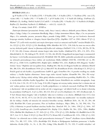 Słownik polszczyzny XVI wieku - wersja elektroniczna hasło: BYDŁO (stan na dzień: 11-10-2015) www.spxvi.edu.pl strona 1/6 BYDŁO (808) sb n sg N bydło (173). ◊ G bydła (219). ◊ D bydłu (56). ◊ A bydło (201). ◊ I bydłem (59); -em (13), -(e)m (46). ◊ L bydle (34). ◊ V bydło (7). ◊ pl N bydła (14). ◊ G bydł (8) LibLeg, UstPraw (2), BibRadz (3), ActReg, VotSzl; bydeł (1) CzahTr. ◊ A bydła (28). ◊ I bydły (3). ◊ L bydléch (4) RejJóz, RejPos (2), SarnStat; bydłach (1) BibRadz; ~ -éch (1), -(e)ch (3). Sł stp, Cn notuje, Linde XVI – XVIII w. Zwierzęta domowe (przeważnie: krowy, woły, kozy i owce), robocze; dobytek; pecus Murm, Mymer1, Mącz, Calag, Calep, Cn; armentum BartBydg, Mącz, Calep; iumentum Murm, Mącz, Cn; res pecuaria Mącz, Cn; animalia, pecora, pecuaria Mącz; praeda Calag (808) : Trzey go też krolowie darowali lezącego miedzy bydlem w vbogiey ſtayni OpecŻyw [27]v; ZapWar 1527 nr 2361; Murm 37 [2 r.]; Mymer1 27; yeſli wieſz myedzý ymi męże dowcipne vtzyń ye rataymi nad bydłem moým HistJóz E2v, Av, E2 [2 r.], E2v, E3 [2 r.], E4; BartBydg 109b; MetrKor 46/117v, 118; Gdy by mor na owcze albo na iny dobytek padł/ dawać to [kosmaczek] bydłu ieſć oſalaiącz FalZioł I 113c, I 113c, III 22a, IV 5b, V 47, 52v (8); Cżemu cżłowiek niema kopyt iako inſze bydło. GlabGad F3v, B7v, C4, D7v, F3v; MiechGlab 8, 21, 70; LibLeg 6/79, 10/67, 11/19v, 66, 89 (9); I bogoſlawił im (pan bog) y rozmnożyli ſie barzo/ á ich bydła nieumnieyſzzył [!]. WróbŻołt 106/38, kk8v; pokrziky przedavali nyewyaſtham na wſzyach powyadayącz bycz dobre od nyefortuny Bidla LibMal 1545/96, 1544/86v [2 r.], 89, 89v [3 r.], 1546/113v; LudWieś B3v; RejJóz Q2v; SeklKat Y3v, Z2v; RejRozm 403; Bogwie/ bydlo/ ſwinie/ kozy/ Mądrſze niż ten paſtirz bozy. RejKup i8v; My ku ćći Bogom bydłá nie zábiámy HistAl I8v, B8, E3v, H5; KromRozm I N4v [2 r.]; MurzNT 56; KromRozm II k4v; GliczKsiąż C5, D3 [2 r.]; Puśćił grad ná ich bydłá y ſą poniſſcżone LubPs S, gg4; GroicPorz f4v; A przeſto według tey náuki wáſzey/ y bydło będzie zbáwione/ ktore tego ziela vżywáć będzie. KrowObr 94v, 50v; Pśi wyią/ bydło rycży/ ſłyſząc włoſy wſtáią/ Iákie głoſy żáłoſne zewſzech ſtron powſtáią. RejWiz 82v, 7v, 130v; y wyzdycháło wſſyſtko bydło Egyptſkie/ ále zbydłá ſynow Iſráelſkich nic owſſeki niezginęło. Leop Ex 9/6, Gen 1/24, 25, 47/4, Ex 9 arg, 9/6 (20); Ciągnąc ná woynę żadny niema ſtać w domu áni ná wśi/ iedno polem: áni ſzkod czynić w bydle poſpolitym y w inſzych rzeczach UstPraw D2; Sláchtá y duchowni/ ták też poddáni ich ſą wolni od cłá y targowego/ od tákich bydł co ie domá vchowáią ku przedániu UstPraw E, A [2 r.], B2v, B3, E3, E4v [2 r.] (21); RejZwierz 45, 107; OrzRozm Q4, T; Y był Abram bárzo bogáty/ ták w bydłách/ iáko też w ſrebrze y we złoćie. BibRadz Gen 13/2, Gen 6/20, 31/41, 46/32, 47/4, Lev 26/22 (21); Máło thá Arábia ma miáſtecżek/ we śrzodku żadnych/ ále ſie tułáią z bydły od mieyſcá do mieyſcá łoterſkie żywiąc. BielKron 263v, 16, 18, 23, 29v, 68 (18); KochSat B4; Canis pecuarius, Pies zá bydłem chodzący. Mącz 286a, 1c, 5d, 59d, 65c, 71a (35); á ſtháwiay to przed bydłem niechay bydło liże. SienLek 191, 2v, 146v, 158 [2 r.], 164v, 167 [2 r.] (15); LeovPrzep a4v; LeovPrzepSamb b3v; RejAp 111v; RejPos 56, 56v, 225v, 330v; BiałKat 353v; BielSat B4; RejZwierc 6, 57, 163v [2 r.], 172v, 175v [2 r.], 229; BielSpr 42; BudBib Gen 6/20, 18/7, Lev 11/2, Num 3/45 [2 r.], Deut 30/9 (17); Strum M2; CzechRozm 60, 113v, 238v [2 r.], 242; Wiećie/ że cżłowiek ma w ſobie cżęść przyrodzenia źwierzęcego/ ktorego zbydłem vżywa ModrzBaz 143v, 71v, 80, 117, 119v, 127v; KochOdpr D3; Woda w Heilpogonie ludźióm pomocna/ á bydłu iádowita. Oczko [43]v, 1v, 3v, 4, 26, 29v; Calag 118a; KochPs 73, 74, 155; Y wybili wſzytko/ od Słownik polszczyzny XVI wieku - wersja elektroniczna hasło: BYDŁO (stan na dzień: 11-10-2015) www.spxvi.edu.pl strona 2/6 mężá do niewiáſty/ od dzieći do ſtárych/ y do bydłá SkarŻyw 502, 27, 92, 243, 260 [2 r.], 262 [2 r.] (20); ZapKościer 1580/7, 10v [2 r.], 1581/21v, 1584/45v, 50v (9); StryjKron 160, 161, 340, 477 [2 r.]; CzechEp 293 [2 r.]; KochFr 85; GórnRozm M, M4v, N; KlonŻal E4; KochMRot A4v; KochPieś 31, 49; Iuż mdłé bydło ſzuka ćieniá/ Y ćiekącégo ſtrumieniá KochSob 62, 71; ArtKanc M6v, T10; BielRozm 13; ActReg 162; Tabanus ‒ Gzik, bąk ſiekęci bydło. Calep 1043a, 5a [3 r.], 25b, 86a, 97a, 634b (15); Bydło nie godne ku chowániu/ ná Wioſnę wypaſzay GostGosp 70; Ma też Dworká iáko Vrzędnik vkazáć Pánu pożytek ze wſzelákiego bydłá przypłodku GostGosp 118, 4, 42, 44, 48, 68 (33); GostGospSieb +4 [2 r.]; Phil R2; GórnTroas 25; LatHar 215, 251; KołakSzczęśl B3, B3v [2 r.]; WujNT 287, 794 marg; á zápłáćiwſzy winę trzy grzywny/ ma dáć bydło ná rękoiemſtwo SarnStat 513, 289, 480, 494, 512 [2 r.], 513 [2 r.] (32); SiebRozmyśl G; SkarKaz 40b, 41a, 44b, 83b, 85a (10); CzahTr D3; Y do rządzenia bydłá/ dowćipnych potrzebá: coż do ludźi? SkarKazSej 662b marg, 658a, 662b; KlonFlis B4; [rolnik] Trapi cżeladź y bydło: ćiemięży poddáne: Cierpi ognie y deſzcże/ wiátry rozgniewáne. KlonWor 77, **5v, 22 [2 r.], 23, 52, 77. W porównaniach (75): BierEz Dv; MiechGlab 74; RejRozpr B2; RejJóz F, L5; RejKup n2; HistAl K3; LubPs Y3; Prze grzech ze wſſech nawiętſſy on/ wſſyſtky y dobroćy ieſt zbawion/ bydłu rowny vczyniony. SeklPieś 31; A ktorzy ták by bydło ná ſwiecie mieſzkáią/ Ci ná wſzem dokońcżenie záwżdy márne máią. RejWiz 49v, 12v, 15v, 16v, 26, 29v (15); RejZwierz 37v, 107, 112; [W Asyryjej] Ludzie obycżáiow pſich/ ábowiem dziewki przedawáią iáko bydło BielKron 267, 365, 384, 385, 411, 441, 445; Mącz 286a, 400c; RejAp 50, 91, 102v, 111v [2 r.], 153; RejPos 331v; BielSat G3; RejZwier