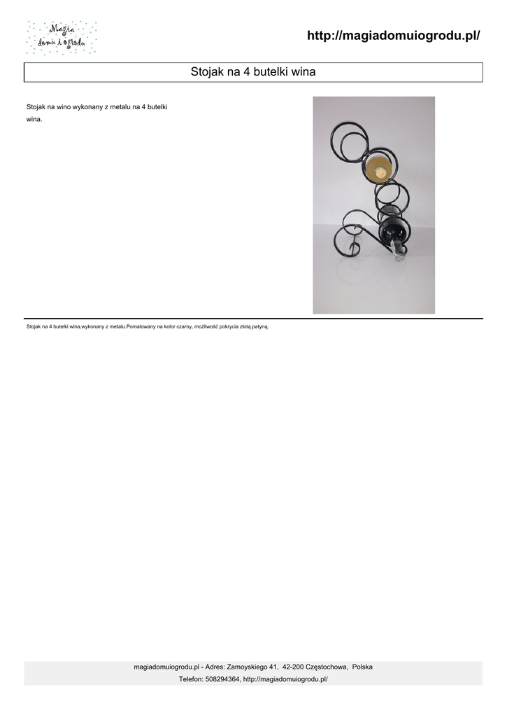 http://magiadomuiogrodu.pl/ Stojak na 4 butelki wina Stojak na wino wykonany z metalu na 4 butelki wina. Stojak na 4 butelki wina,wykonany z metalu.Pomalowany na kolor czarny, możliwość pokrycia złotą patyną. magiadomuiogrodu.pl - Adres: Zamoyskiego 41, 42-200 Częstochowa, Polska Telefon: 508294364, http://magiadomuiogrodu.pl/ http://magiadomuiogrodu.pl/ magiadomuiogrodu.pl - Adres: Zamoyskiego 41, 42-200 Częstochowa, Polska Telefon: 508294364, http://magiadomuiogrodu.pl/
