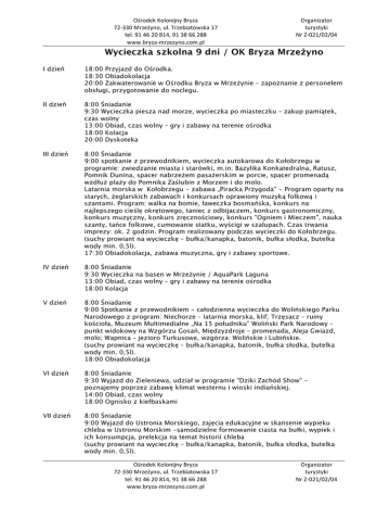 OśrodekKolonijnyBryza 72-330Mrzeżyno,ul.Trzebiatowska17 tel.914620814,913866288 www.bryza-mrzezyno.com.pl Organizator turystyki NrZ-021/02/04 Wycieczka szkolna 9 dni / OK Bryza Mrzeżyno I dzień 18:00 Przyjazd do Ośrodka. 18:30 Obiadokolacja 20:00 Zakwaterowanie w Ośrodku Bryza w Mrzeżynie – zapoznanie z personelem obsługi, przygotowanie do noclegu. II dzień 8:00 Śniadanie 9:30 Wycieczka piesza nad morze, wycieczka po miasteczku – zakup pamiątek, czas wolny 13:00 Obiad, czas wolny – gry i zabawy na terenie ośrodka 18:00 Kolacja 20:00 Dyskoteka III dzień 8:00 Śniadanie 9:00 spotkanie z przewodnikiem, wycieczka autokarowa do Kołobrzegu w programie: zwiedzanie miasta i starówki, m.in. Bazylika Konkatedralna, Ratusz, Pomnik Dunina, spacer nabrzeżem pasażerskim w porcie, spacer promenadą wzdłuż plaży do Pomnika Zaślubin z Morzem i do molo. Latarnia morska w Kołobrzegu - zabawa „Piracka Przygoda” - Program oparty na starych, żeglarskich zabawach i konkursach oprawiony muzyką folkową i szantami. Program: walka na bomie, ławeczka bosmańska, konkurs na najlepszego cieślę okrętowego, taniec z odbijaczem, konkurs gastronomiczny, konkurs muzyczny, konkurs zręcznościowy, konkurs "Ogniem i Mieczem", nauka szanty, tańce folkowe, cumowanie statku, wyścigi w szalupach. Czas trwania imprezy: ok. 2 godzin. Program realizowany podczas wycieczki do Kołobrzegu. (suchy prowiant na wycieczkę – bułka/kanapka, batonik, bułka słodka, butelka wody min. 0,5l). 17:30 Obiadokolacja, zabawa muzyczna, gry i zabawy sportowe. IV dzień 8:00 Śniadanie 9:30 Wycieczka na basen w Mrzeżynie / AquaPark Laguna 13:00 Obiad, czas wolny – gry i zabawy na terenie ośrodka 18:00 Kolacja V dzień 8:00 Śniadanie 9:00 Spotkanie z przewodnikiem - całodzienna wycieczka do Wolińskiego Parku Narodowego z program: Niechorze – latarnia morska, klif; Trzęsacz – ruiny kościoła, Muzeum Multimedialne „Na 15 południku” Woliński Park Narodowy – punkt widokowy na Wzgórzu Gosań, Międzyzdroje – promenada, Aleja Gwiazd, molo; Wapnica – jezioro Turkusowe, wzgórza: Wolińskie i Lubińskie. (suchy prowiant na wycieczkę – bułka/kanapka, batonik, bułka słodka, butelka wody min. 0,5l). 18:00 Obiadokolacja VI dzień 8:00 Śniadanie 9:30 Wyjazd do Zieleniewa, udział w programie "Dziki Zachód Show" poznajemy poprzez zabawę klimat westernu i wioski indiańskiej. 14:00 Obiad, czas wolny 18:00 Ognisko z kiełbaskami VII dzień 8:00 Śniadanie 9:00 Wyjazd do Ustronia Morskiego, zajęcia edukacyjne w skansenie wypieku chleba w Ustroniu Morskim -samodzielne formowanie ciasta na bułki, wypiek i ich konsumpcja, prelekcja na temat historii chleba (suchy prowiant na wycieczkę – bułka/kanapka, batonik, bułka słodka, butelka wody min. 0,5l). OśrodekKolonijnyBryza 72-330Mrzeżyno,ul.Trzebiatowska17 tel.914620814,913866288 www.bryza-mrzezyno.com.pl Organizator turystyki NrZ-021/02/04 OśrodekKolonijnyBryza 72-330Mrzeżyno,ul.Trzebiatowska17 tel.914620814,913866288 www.bryza-mrzezyno.com.pl 17:30 Obiadokolacja Organizator turystyki NrZ-021/02/04 VIII dzień 8:00 Śniadanie 9:30 Wycieczka piesza do Rogowa, zwiedzanie Fortu Rogowo (muzeum o tematyce lotniczej/samoloty Iskra, Iryda ..) 13:00 Obiad, czas wolny 18:00 Kolacja 20:00 Dyskoteka IX dzień 8:00 Śniadanie 9:30 Wycieczka piesza na plaże, pożegnanie z morzem, rozdanie dyplomów uczestnika zielonej szkoły 11:00 Wyjazd z Ośrodka (suchy prowiant na drogę – bułka/kanapka, batonik, bułka słodka, butelka wody min. 0,5l). CENA 639,- od osoby Cena zawiera: Noclegi w pokojach 2,4,5 osobowych. Wszystkie pokoje z pełnym węzłem sanitarnym. Wyżywienie FB (śniadanie, obiad kolacja) śniadania i kolacje – szwedzki stół Program turystyczny zgodnie z przedstawioną ofertą – w cenie autokar, przewodnik, bilety wstępów. Pobyt nieodpłatnie opiekunów grupy 1 na 15 uczestników gratis Kalkulacja dla grupy min. 25 osobowej. Śniadania godz. 8-9, Obiad 13-14, Kolacja 18-19 OśrodekKolonijnyBryza 72-330Mrzeżyno,ul.Trzebiatowska17 tel.914620814,913866288 www.bryza-mrzezyno.com.pl Organizator turystyki NrZ-021/02/04