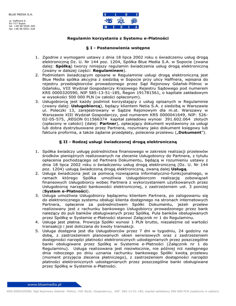 BLUE MEDIA S.A. ul. Haffnera 6 81-717 Sopot tel. +48 58 5555-305 fax +48 58 5551-318 Regulamin korzystania z Systemu e-Płatności § I - Postanowienia wstępne 1. Zgodnie z wymogami ustawy z dnia 18 lipca 2002 roku o świadczeniu usług drogą elektroniczną Dz. U. Nr 144 poz. 1204, Spółka Blue Media S.A. w Sopocie (zwana dalej: Spółką) tworzy niniejszy regulamin świadczenia usług drogą elektroniczną (zwany w dalszej części: Regulaminem). 2. Podmiotem świadczącym opisane w Regulaminie usługi drogą elektroniczną jest Blue Media spółka akcyjna z siedzibą w Sopocie przy ulicy Haffnera, wpisana do rejestru przedsiębiorców prowadzonego przez Sąd Rejonowy Gdańsk-Północ w Gdańsku, VIII Wydział Gospodarczy Krajowego Rejestru Sądowego pod numerem KRS 0000320590, NIP 585-13-51-185, Regon 191781561, o kapitale zakładowym w wysokości 500 000 PLN (w całości opłaconym). 3. Usługobiorcą jest każdy podmiot korzystający z usług opisanych w Regulaminie (zwany dalej: Usługobiorcą), będący klientem Netia S.A. z siedzibą w Warszawie ul. Poleczki 13, zarejestrowany w Sądzie Rejonowym dla m.st. Warszawy w Warszawie XIII Wydział Gospodarczy, pod numerem KRS 0000041649, NIP: 52602-05-575, ,REGON 011566374 kapitał zakładowy wynosi 391.602.064 złotych (opłacony w całości) (dalej: Partner), opłacający dokument wystawiony za usługi lub dobra dystrybuowane przez Partnera, rozumiany jako dokument księgowy lub faktura proforma, a także żądanie przedpłaty, polecenia przelewu („Dokument”). § II - Rodzaj usługi świadczonej drogą elektroniczną 1. Spółka świadczy usługę pośrednictwa finansowego w zakresie realizacji przelewów środków pieniężnych realizowanych na zlecenie Usługobiorcy do Partnera, z tytułu opłacenia pochodzącego od Partnera Dokumentu, będącą w rozumieniu ustawy z dnia 18 lipca 2002 roku o świadczeniu usług drogą elektroniczną (Dz. U. Nr 144 poz. 1204) usługą świadczoną drogą elektroniczną, zwaną dalej Usługą. 2. Usługa świadczona jest za pomocą rozwiązania informatyczno-funkcjonalnego, w ramach którego Spółka umożliwia Usługobiorcom realizację zobowiązań finansowych Usługobiorcy wobec Partnera z wykorzystaniem użytkowanych przez Usługobiorcę narzędzi bankowości elektronicznej, z zastrzeżeniem ust. 3 poniżej (System e-Płatności). 3. Usługa umożliwia Usługobiorcy będącemu klientem Partnera, po zalogowaniu się do elektronicznego systemu obsługi klienta dostępnego na stronach internetowych Partnera, opłacenie za pośrednictwem Spółki Dokumentu, jeżeli przelew realizowany jest z rachunku bankowego Usługobiorcy prowadzonego przez bank należący do puli banków obsługiwanych przez Spółkę. Pula banków obsługiwanych przez Spółkę w Systemie e-Płatności stanowi Załącznik nr 1 do Regulaminu. 4. Usługa jest płatna. Prowizja Spółki wynosi 1 PLN brutto, niezależnie od wartości transakcji i jest doliczana do kwoty transakcji. 5. Usługa dostępna jest dla Usługobiorców przez 7 dni w tygodniu, 24 godziny na dobę, z zastrzeżeniem planowanych okien serwisowych oraz z zastrzeżeniem dostępności narzędzi płatności elektronicznych udostępnianych przez poszczególne banki obsługiwane przez Spółkę w Systemie e-Płatności (Załącznik nr 1 do Regulaminu). Usługa realizowana jest niezwłocznie, nie później niż następnego dnia roboczego po dniu uznania rachunku bankowego Spółki kwotą przelewu (moment przyjęcia zlecenia płatniczego), z zastrzeżeniem dostępności narzędzi płatności elektronicznych udostępnianych przez poszczególne banki obsługiwane przez Spółkę w Systemie e-Płatności. KRS:0000320590, Sąd Rejonowy Gdańsk- Północ, VIII Wydz. Gospodarczy, NIP: 585-13-51-185, kapitał zakładowy 500 000 PLN (wpłacony w całości). BLUE MEDIA S.A. ul. Haffnera 6 81-717 Sopot tel. +48 58 5555-305 fax +48 58 5551-318 § III - Warunki świadczenia usługi drogą elektroniczną 1. Usługa jest świadczona przez Spółkę jedynie Usługobiorcom, będącym klientami Partnera, którzy jednocześnie zawarli ze Spółką umowę o świadczenie Usługi poprzez akceptację niniejszego Regulaminu. 2. W celu uzyskania informacji o stanie realizacji Usługi, Usługobiorca może udostępnić Spółce swój adres e-mail lub numer telefonu komórkowego. Z chwilą zamówienia Usługi i akceptacji niniejszego Regulaminu, dane osobowe Usługobiorcy są umieszczane i przetwarzane w bazie danych firmy Blue Media S.A. z siedzibą w Sopocie, będącej administratorem tych danych osobowych. Podanie danych osobowych jest dobrowolne, ale konieczne dla realizacji Usługi. 3. Administratorem zbioru danych osobowych Usługobiorcy jest Spółka. 4. Usługobiorcy przysługuje prawo wglądu do zarejestrowanych dotyczących go danych osobowych oraz prawo żądania ich poprawiania. 5. W celu korzystania z Usługi niezbędne jest spełnienie przez Usługobiorcę następujących wymagań technicznych: a) posiadanie urządzeń zapewniających dostęp do sieci Internet, b) posiadanie internetowego konta pocztowego (e-mail), jeżeli Usługobiorca chce uzyskać informację o stanie realizacji Usługi zgodnie z ust. 2 powyżej, c) posiadanie zaktualizowanej przeglądarki internetowej zapewniającej prawidłowe wyświetlanie Portalu § IV - Warunki zawierania umowy o świadczenie usługi drogą elektroniczną Zawarcie umowy o świadczenie Usługi następuje po potwierdzeniu zapoznania się i akceptacji niniejszego Regulaminu. Usługa zostaje zrealizowana dla Usługobiorcy z chwilą uznania rachunku Partnera kwotą przelewu. § V - Reklamacje 1. Składanie reklamacji odbywa się drogą elektroniczną na adres e-mail Spółki: [email protected] lub telefonicznie na numer Spółki +48 58 7604 822 oraz 801 800 822 (połączenia płatne według stawek właściwych operatorów telekomunikacyjnych) 2. Przedmiotem reklamacji jest wykonanie przez Spółkę Usługi niezgodnie z warunkami i zasadami o