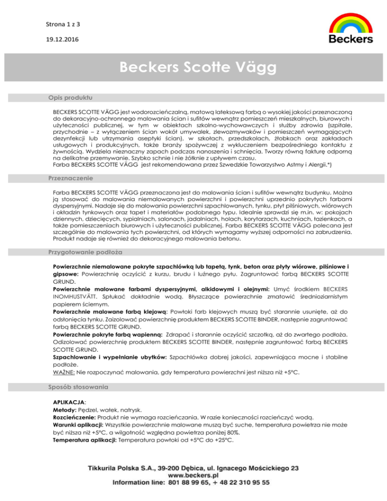 Strona 1 z 3 19.12.2016 Beckers Scotte Vägg Opis produktu BECKERS SCOTTE VÄGG jest wodorozcieńczalną, matową lateksową farbą o wysokiej jakości przeznaczoną do dekoracyjno-ochronnego malowania ścian i sufitów wewnątrz pomieszczeń mieszkalnych, biurowych i użyteczności publicznej, w tym w obiektach szkolno-wychowawczych i służby zdrowia (szpitale, przychodnie – z wyłączeniem ścian wokół umywalek, zlewozmywaków i pomieszczeń wymagających dezynfekcji lub utrzymania aseptyki ścian), w szkołach, przedszkolach, żłobkach oraz zakładach usługowych i produkcyjnych, także branży spożywczej z wykluczeniem bezpośredniego kontaktu z żywnością. Wydziela nieznaczny zapach podczas nanoszenia i schnięcia. Tworzy równą fakturę odporną na delikatne przemywanie. Szybko schnie i nie żółknie z upływem czasu. Farba BECKERS SCOTTE VÄGG jest rekomendowana przez Szwedzkie Towarzystwo Astmy i Alergii.*) Przeznaczenie Farba BECKERS SCOTTE VÄGG przeznaczona jest do malowania ścian i sufitów wewnątrz budynku. Można ją stosować do malowania niemalowanych powierzchni i powierzchni uprzednio pokrytych farbami dyspersyjnymi. Nadaje się do malowania powierzchni szpachlowanych, tynku, płyt pilśniowych, wiórowych i okładzin tynkowych oraz tapet i materiałów podobnego typu. Idealnie sprawdzi się m.in. w: pokojach dziennych, dziecięcych, sypialniach, salonach, jadalniach, holach, korytarzach, kuchniach, łazienkach, a także pomieszczeniach biurowych i użyteczności publicznej. Farba BECKERS SCOTTE VÄGG polecana jest szczególnie do malowania tych powierzchni, od których wymagamy wyższej odporności na zabrudzenia. Produkt nadaje się również do dekoracyjnego malowania betonu. Przygotowanie podłoża Powierzchnie niemalowane pokryte szpachlówką lub tapetą, tynk, beton oraz płyty wiórowe, pilśniowe i gipsowe: Powierzchnię oczyścić z kurzu, brudu i luźnego pyłu. Zagruntować farbą BECKERS SCOTTE GRUND. Powierzchnie malowane farbami dyspersyjnymi, alkidowymi i olejnymi: Umyć środkiem BECKERS INOMHUSTVÄTT. Spłukać dokładnie wodą. Błyszczące powierzchnie zmatowić średnioziarnistym papierem ściernym. Powierzchnie malowane farbą klejową: Powłoki farb klejowych muszą być starannie usunięte, aż do odsłonięcia tynku. Zaizolować powierzchnię produktem BECKERS SCOTTE BINDER, następnie zagruntować farbą BECKERS SCOTTE GRUND. Powierzchnie pokryte farbą wapienną: Zdrapać i starannie oczyścić szczotką, aż do zwartego podłoża. Odizolować powierzchnię produktem BECKERS SCOTTE BINDER, następnie zagruntować farbą BECKERS SCOTTE GRUND. Szpachlowanie i wypełnianie ubytków: Szpachlówka dobrej jakości, zapewniająca mocne i stabilne podłoże. WAŻNE: Nie rozpoczynać malowania, gdy temperatura powierzchni jest niższa niż +5°C. Sposób stosowania APLIKACJA: Metody: Pędzel, wałek, natrysk. Rozcieńczenie: Produkt nie wymaga rozcieńczania. W razie konieczności rozcieńczyć wodą. Warunki aplikacji: Wszystkie powierzchnie malowane muszą być suche, temperatura powietrza nie może być niższa niż +5°C, a wilgotność względna powietrza poniżej 80%. Temperatura aplikacji: Temperatura powłoki od +5°C do +25°C. Strona 2 z 3 19.12.2016 Beckers Scotte Vägg Malowanie: Przed malowaniem produkt należy dokładnie wymieszać. Nałożyć 1-2 warstw BECKERS SCOTTE VÄGG. Dla kolorów o szczególnie słabej sile krycia (oznaczonych odpowiednio w systemie barwienia) może wystąpić konieczność naniesienia dodatkowych warstw. Przed przystąpieniem do malowania należy zakolorować dostateczną ilość farby z jednej partii produkcyjnej w celu uniknięcia ewentualnych różnic w odcieniu powłoki malarskiej. Należy pamiętać, że powierzchnia pomalowana farbą matową jest bardziej podatna na zadrapania i mechaniczne oddziaływania w porównaniu z powierzchniami malowanymi farbami o większym stopniu połysku. Pełne własności odpornościowe na zmywanie na mokro, zgodnie z PN-EN 13300 powłoka uzyskuje po 28 dniach od zakończenia prac malarskich. Czas schnięcia W temperaturze +25°C, przy wilgotności względnej powietrza 50%, farba schnie ok. 0,5 godziny. Między nakładaniem kolejnych warstw należy zachować co najmniej 3-godzinny odstęp czasu. Czyszczenie narzędzi Narzędzia należy czyścić wodą, bezpośrednio po zakończeniu prac. Przed umyciem narzędzia należy dobrze wytrzeć, w celu usunięcia możliwie największej ilości farby. Stopień połysku HELMATT [5] – pełny mat MATT [7] – mat HALVMATT [20] - półmat Kolor HELMATT [5] - Biały/baza A oraz baza C. MATT [7] i HALVMATT [20] – Baza A i C. Wydajność teoretyczna 6-8 m2/l przy jednokrotnym malowaniu. Wydajność w dużej mierze uzależniona jest od takich czynników, jak chłonność, tekstura podłoża oraz metoda aplikacji. Opakowania HELMATT [5] - 3,6 l, 9 l MATT [7] I HALVMATT [20] – 0,9 l, 3,6 l, 9 l Ochrona środowiska Płynnych pozostałości nie wylewać do kanalizacji. Puste opakowania jak i opakowania zawierające nienadające się do ponownego wykorzystania pozostałości farb przekazać do punktu zajmującego się zbieraniem tego rodzaju odpadów. Szczegółową informację na temat możliwości zbierania odpadów można uzyskać w lokalnym Urzędzie Gminy. Strona 3 z 3 19.12.2016 Beckers Scotte Vägg Wskazówki BHP i ppoż. Podczas malowania nosić odpowiednie ubranie robocze oraz rękawice ochronne. Zawiera mieszanina poreakcyjna 5-chloro-2-metylo-4-izotiazolin-3-onu [nr WE 247-500-7] i 2-metylo-4-izotiazolin-3-onu [nr WE 220-239-6] (3:1) i 1,2-benzoizotiazol-3(2H)-on. Może powodować wystąpienie reakcji alergicznej. Stosować rękawice ochronne. Farbę przechowywać w miejscu niedostępnym dla dzieci. Pomieszczenia zamknięte po zastosowaniu farby, należy wietrzyć do zaniku zapachu i po tym czasie nadają się do użytkowania. Produkt nie jest sklasyfikowany jako niebezpieczny. Karta charakterystyki produktu dostępna 