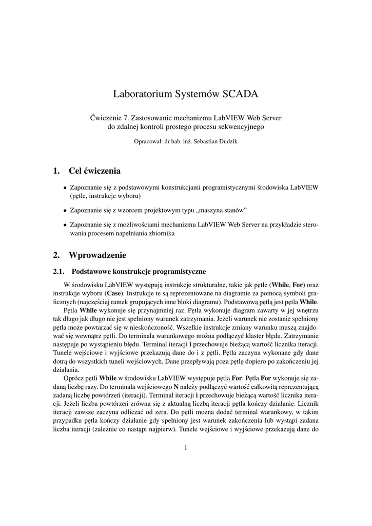 Laboratorium Systemów SCADA Ćwiczenie 7. Zastosowanie mechanizmu LabVIEW Web Server do zdalnej kontroli prostego procesu sekwencyjnego Opracował: dr hab. inż. Sebastian Dudzik 1. Cel ćwiczenia • Zapoznanie si˛e z podstawowymi konstrukcjami programistycznymi środowiska LabVIEW (p˛etle, instrukcje wyboru) • Zapoznanie si˛e z wzorcem projektowym typu „maszyna stanów” • Zapoznanie si˛e z możliwościami mechanizmu LabVIEW Web Server na przykładzie sterowania procesem napełniania zbiornika 2. 2.1. Wprowadzenie Podstawowe konstrukcje programistyczne W środowisku LabVIEW wyst˛epuja˛ instrukcje strukturalne, takie jak p˛etle (While, For) oraz instrukcje wyboru (Case). Instrukcje te sa˛ reprezentowane na diagramie za pomoca˛ symboli graficznych (najcz˛eściej ramek grupujacych ˛ inne bloki diagramu). Podstawowa˛ p˛etla˛ jest p˛etla While. P˛etla While wykonuje si˛e przynajmniej raz. P˛etla wykonuje diagram zawarty w jej wn˛etrzu tak długo jak długo nie jest spełniony warunek zatrzymania. Jeżeli warunek nie zostanie spełniony p˛etla może powtarzać si˛e w nieskończoność. Wszelkie instrukcje zmiany warunku musza˛ znajdować si˛e wewnatrz ˛ p˛etli. Do terminala warunkowego można podłaczyć ˛ klaster bł˛edu. Zatrzymanie nast˛epuje po wystapieniu ˛ bł˛edu. Terminal iteracji i przechowuje bieżac ˛ a˛ wartość licznika iteracji. Tunele wejściowe i wyjściowe przekazuja˛ dane do i z p˛etli. P˛etla zaczyna wykonane gdy dane dotra˛ do wszystkich tuneli wejściowych. Dane przepływaja˛ poza p˛etl˛e dopiero po zakończeniu jej działania. Oprócz p˛etli While w środowisku LabVIEW wyst˛epuje p˛etla For. P˛etla For wykonuje si˛e zadana˛ liczb˛e razy. Do terminala wejściowego N należy podłaczyć ˛ wartość całkowita˛ reprezentujac ˛ a˛ zadana˛ liczb˛e powtórzeń (iteracji). Terminal iteracji i przechowuje bieżac ˛ a˛ wartość licznika iteracji. Jeżeli liczba powtórzeń zrówna si˛e z aktualna˛ liczba˛ iteracji p˛etla kończy działanie. Licznik iteracji zawsze zaczyna odliczać od zera. Do p˛etli można dodać terminal warunkowy, w takim przypadku p˛etla kończy działanie gdy spełniony jest warunek zakończenia lub wystapi ˛ zadana liczba iteracji (zależnie co nastapi ˛ najpierw). Tunele wejściowe i wyjściowe przekazuja˛ dane do 1 Ćwiczenie 7. Zastosowanie mechanizmu LabVIEW Web Server . . . ZTMAiPC i z p˛etli. P˛etla zaczyna wykonane gdy dane dotra˛ do wszystkich tuneli wejściowych. Dane przepływaja˛ poza p˛etl˛e dopiero po zakończeniu jej działania. Inna˛ cz˛esto stosowana˛ instrukcja˛ strukturalna˛ jest instrukcja wyboru (strukttura Case). Struktura Case posiada dwa lub wi˛ecej diagramów składowych (przypadków). Tylko jeden diagram jest widoczny, struktura wykonuje tylko jeden przypadek. O tym który przypadek jest wykonywany decyduja˛ dane podłaczone ˛ do terminala wyboru. Struktura Case jest stosowana do podejmowania decyzji, jest odpowiednikiem If..then..else w tekstowych j˛ezykach programowania. Do terminala wyboru można podłaczyć ˛ dane typu całkowitego, logicznego, łańcuchowego lub wyliczeniowego. Gdy danymi wejściowymi sa˛ dane logiczne, struktura ma tylko dwa przypadki. W przypadku typu łańcuchowego domyślnie ważna jest wielkość liter. Można to zmienić za pomoca˛ menu kontekstowego. Jeden z przypadków należy ustawić jako domyślny. Jest on wykonywany, gdy dane znajduja˛ si˛e poza zakresem możliwych wartości. 2.2. Wzorzec projektowy „maszyna stanów” Programowanie sekwencyjne może być użyte w przypadku prostych, realizowanych kolejno po sobie zadań W bardziej skomplikowanych aplikacjach niezb˛edne jest użycie innych wzorców projektowych, takich jak: • przetwarzanie równoległe, • sterowanie zdarzeniami, • maszyna stanów Programowanie sekwencyjne nie zapewnia obsługi nast˛epujacych ˛ sytuacji: zmiana porzadku ˛ wykonywania sekwencji, powtarzanie jednego z elementów sekwencji wi˛ecej niż innych elementów, wykonywanie pewnych elementów sekwencji tylko przy spełnieniu określonych warunków, natychmiastowe zatrzymanie (awaria, alarm) w trakcie wykonywania sekwencji a nie po jej zakończeniu. Podstawowe poj˛ecia stosowane w przypadku wzorca "maszyna stanów”, to: stany (operacje) oraz tranzycje (przejścia, warunki). Maszyna stanów jest jednym z cz˛eściej używanych wzorców projektowych LabVIEW. Jest stosowana do zapisu algorytmu, który może być przedstawiony w postaci diagramu stanów lub grafu przepływu stanów. Maszyna o skończonej liczbie stanów (ang. FSM Finite State Machine) to zestaw stanów i przejść definiujacych ˛ zmiany stanów. LabVIEW dostarcza implementacji maszyny Moore’a: maszyna wykonuje określona˛ akcj˛e dla każdego stanu). Maszyn˛e stanów stosuje si˛e w aplikacjach, w których można rozróżnić skończona˛ liczb˛e stanów i jednoznacznie zdefiniować warunki przejścia pomi˛edzy stanami. Każdy stan prowadzi do jednego lub wielu innych stanów lub kończy przepływ stanów. Przejścia zazwyczaj sa˛ zależne od reakcji użytkownika (dane wejściowe) i sposobu obliczeń w poszczególnych stanach. Trzy ważne stany to: Domyślny (pierwszy stan, start), Inicjalizacja (określenie parametrów poczatkowych), ˛ Koniec (stop, usuwanie zmiennych, czyszczenie). Zastosowanie maszyny stanów: • Interfejsy użytkownika – różne akcje (zdarzenia) użytkownika zmieniaja˛ stan interfejsu i aplikacji z jednego etapu przetwarzania danych do innego. Każdy etap może prowadzić 2 Cz˛estochowa 2014 ZTMAiPC Laboratorium Systemów SCADA do innego etapu lub oczekiwać na kolejne zdarzenia użytkownika. Maszyna stanów ciagle ˛ monitoruje interfejs oczekujac ˛ na kolejne zdarzenia. • Testowanie procesów – stany reprezentuja˛ etapy procesu. Zależnie od wyniku testu w każdym z etapów, moga˛ być wywoływane różne stany. 2.3. LabVIEW Web Server Mechanizm LabVIEW Web Server