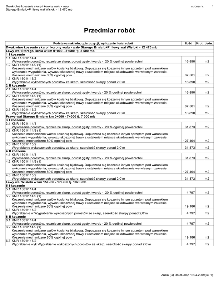 Dwukrotne koszenie skarp i korony wału - wały Starego Brnia L+P i lewy wał Wisłoki - 12 470 mb strona nr: 1 Przedmiar robót Podstawa nakładu, opis pozycji, wyliczenie ilości robót Ilość Dwukrotne koszenie skarp i korony wału - wały Starego Brnia L+P i lewy wał Wisłoki - 12 470 mb Lewy wał Starego Brnia w km 0+000 - 3+500 tj. 3 500 mb 1 I koszenie 1.1 KNR 1501/114/4 Wykoszenie porostów, ręcznie ze skarp, porost gęsty, twardy - 20 % ogólnej powierzchni 1.2 KNR 1501/114/9 (1) Koszenie mechaniczne wałów kosiarką bijakową. Dopuszcza się koszenie innym sprzętem pod warunkiem wykonania wygrabienia, wywozu skoszonej trawy z ustaleniem miejsca składowania we własnym zakresie. Koszenie mechaniczne 80% ogólnej pow 1.3 KNR 1501/115/2 Wygrabianie wykoszonych porostów ze skarp, szerokość skarpy ponad 2,0˙m 2 II koszenie 2.1 KNR 1501/114/4 Wykoszenie porostów, ręcznie ze skarp, porost gęsty, twardy - 20 % ogólnej powierzchni 2.2 KNR 1501/114/9 (1) Koszenie mechaniczne wałów kosiarką bijakową. Dopuszcza się koszenie innym sprzętem pod warunkiem wykonania wygrabienia, wywozu skoszonej trawy z ustaleniem miejsca składowania we własnym zakresie. Koszenie mechaniczne 80% ogólnej pow 2.3 KNR 1501/115/2 Wygrabianie wykoszonych porostów ze skarp, szerokość skarpy ponad 2,0˙m Prawy wał Starego Brnia w km 0+000 - 7+000 tj. 7 000 mb 3 I koszenie 3.1 KNR 1501/114/4 Wykoszenie porostów, ręcznie ze skarp, porost gęsty, twardy - 20 % ogólnej powierzchni 3.2 KNR 1501/114/9 (1) Koszenie mechaniczne wałów kosiarką bijakową. Dopuszcza się koszenie innym sprzętem pod warunkiem wykonania wygrabienia, wywozu skoszonej trawy z ustaleniem miejsca składowania we własnym zakresie. Koszenie mechaniczne 80% ogólnej pow 3.3 KNR 1501/115/2 Wygrabianie wykoszonych porostów ze skarp, szerokość skarpy ponad 2,0˙m 4 II koszenie 4.1 KNR 1501/114/4 Wykoszenie porostów, ręcznie ze skarp, porost gęsty, twardy - 20 % ogólnej powierzchni 4.2 KNR 1501/114/9 (1) Koszenie mechaniczne wałów kosiarką bijakową. Dopuszcza się koszenie innym sprzętem pod warunkiem wykonania wygrabienia, wywozu skoszonej trawy z ustaleniem miejsca składowania we własnym zakresie. Koszenie mechaniczne 80% ogólnej pow 4.3 KNR 1501/115/2 Wygrabianie wykoszonych porostów ze skarp, szerokość skarpy ponad 2,0˙m Lewy wał Wisłoki w km 15+930 - 17+900 tj. 1970 mb 5 I koszenie 5.1 KNR 1501/114/4 Wykoszenie porostów, ręcznie ze skarp, porost gęsty, twardy - 20 % ogólnej powierzchni 5.2 KNR 1501/114/9 (1) Koszenie mechaniczne wałów kosiarką bijakową. Dopuszcza się koszenie innym sprzętem pod warunkiem wykonania wygrabienia, wywozu skoszonej trawy z ustaleniem miejsca składowania we własnym zakresie. Koszenie mechaniczne 80% ogólnej pow 5.3 KNR 1501/115/2 Wygrabianie w Wygrabianie wykoszonych porostów ze skarp, szerokość skarpy ponad 2,0˙m 6 II koszenie 6.1 KNR 1501/114/4 Wykoszenie porostów, ręcznie ze skarp, porost gęsty, twardy - 20 % ogólnej powierzchni 6.2 KNR 1501/114/9 (1) Koszenie mechaniczne wałów kosiarką bijakową. Dopuszcza się koszenie innym sprzętem pod warunkiem wykonania wygrabienia, wywozu skoszonej trawy z ustaleniem miejsca składowania we własnym zakresie. Koszenie mechaniczne 80% ogólnej pow 6.3 KNR 1501/115/2 Wygrabianie wyk Wygrabianie wykoszonych porostów ze skarp, szerokość skarpy ponad 2,0˙m Krot. Jedn. 16 890 m2 67 561 m2 16 890 m2 16 890 m2 67 561 m2 16 890 m2 31 873 m2 127 494 m2 31 873 m2 31 873 m2 127 494 m2 31 873 m2 4 797 m2 19 186 m2 4 797 m2 4 797 m2 19 186 m2 4 797 m2 Zuzia (C) DataComp 1994-2009(lic. 1)