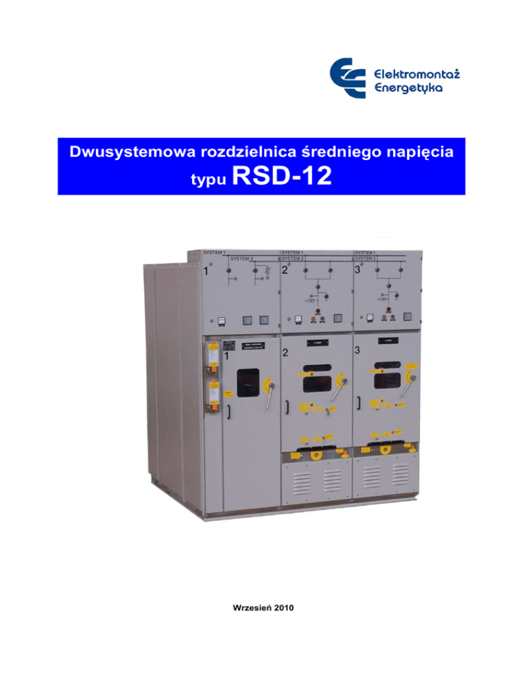 Dwusystemowa rozdzielnica średniego napięcia typu RSD-12 Wrzesień 2010 Elektromontaż Energetyka Sp. z o.o. Rozdzielnica typu RSD-12 DWUSYTEMOWA ROZDZIELNICA ŚREDNIEGO NAPIĘCIA TYPU RSD-12 - WSTĘP Wieloletnie doświadczenie w produkcji rozdzielnic pozwoliło stworzyć produkt wyposażony w nowoczesną aparaturę produkcji krajowej i zagranicznej, spełniający wysokie wymagania klientów. Dzięki nowoczesnej i charakterystycznej jedynie dla tego typu rozdzielnic konstrukcji, pola RSD-12 zapewniają stopień bezpieczeństwa większy niż inne rozdzielnice wyposażone w dwa systemy szyn zbiorczych. Rozdzielnice typu RSD-12 charakteryzują się stosunkowo niewielkimi gabarytami i masą, mniejszymi niż tradycyjne rozdzielnice dwusystemowe (przez wyeliminowanie odłączników systemowych), nowoczesną aparaturą, pozwalającą na długotrwałą pracę bez potrzeby przeprowadzania zabiegów konserwacyjnych. Rozdzielnice mogą być wyposażone w układ wczesnego wykrywania zwarcia łukowego np.: ZŁ-4 Energotest lub inne. ZASTOSOWANIE Rozdzielnice typu RSD-12 są przeznaczone do przyjęcia i rozdziału energii elektrycznej trójfazowego prądu przemiennego o częstotliwości 50Hz, przy znamionowym napięciu do 12kV w sieciach rozdzielczych energetyki przemysłowej i zawodowej. Rozdzielnice są konfigurowane z pojedynczych typowych pól o zróżnicowanym wyposażeniu. Zamieszczone w niniejszym opracowaniu informacje i dane techniczne, które dotyczącą podstawowych typów pól, umożliwiają projektantowi zestawienie ich w oczekiwany układ rozdzielnicy. Możliwe jest opracowanie pól o wyposażeniu i konfiguracji nie ujętym w niniejszym opracowaniu. CHARAKTERYSTYKA OGÓLNA Rozdzielnica typu RSD-12 jest rozdzielnicą przedziałową, w osłonie metalowej, z izolacją stałopowietrzną, wyposażoną w nowoczesną aparaturę łączeniową, z podwójnym systemem szyn zbiorczych. Pola rozdzielnicy RSD-12 są wykonywane jako wolnostojące, z drzwiami prawymi. W rozdzielnicy typu RSD-12, dzięki zastosowaniu specyficznego mechanizmu napędowego aparatów łączeniowych, wyeliminowano odłączniki systemowe, ograniczając w ten sposób gabaryty, koszt pola oraz poprawiając bezpieczeństwo obsługi. Pola rozdzielcze RSD-12 charakteryzują się następującymi właściwościami: - - - wysoką niezawodnością pracy, pewnym w działaniu system blokad: mechanicznych, elektromechanicznych i elektrycznych umożliwiających przeprowadzenie tylko dopuszczalnych w danych stanach czynności łączeniowych, wymaganą łukoodpornością osiągniętą przez odpowiednio wzmocnioną konstrukcję, stosunkowo niedużymi gabarytami zewnętrznymi przy uwzględnieniu wysokich parametrów technicznych, możliwością realizacji układów rozdzielnic dostosowanych do różnorodnych wymagań technicznych, - - prostą obsługę i konserwację, zastosowanie nowoczesnej, niezawodnej aparatury łączeniowej, wysoka odporność na korozję, konstrukcja rozdzielnicy wykonana jest z blachy stalowej z pokryciem galwanicznym (cynk lub ,,alucynk''), a zewnętrzne osłony, pokrywy, drzwi - lakierem proszkowym, możliwość zdalnego sterowania oraz pełnej wizualizacji w zakresie monitoringu stanów ruchowych i awaryjnych z możliwością rejestracji i przeglądania zdarzeń. Wysokie bezpieczeństwo obsługi zostało osiągnięte poprzez: • wykonanie łukoodporne – pola odporne na skutki zwarć wewnętrznych, • wydzielenie przedziałów oddzielonych od siebie metalowymi, uziemionymi przegrodami, • specjalnie wzmocnioną konstrukcję pól (osłony, zamki, zawiasy), • celki z członami wysuwnymi wyposażono w metalowe przegrody ruchome osłaniające styki stałe po wyjechaniu członu wysuwnego • kanały dekompresyjne - ograniczające wzrost ciśnienia ( w przypadku zwarć łukowych ) w przedziałach, • blokady mechaniczne i elektromechaniczne zapobiegające błędnym manipulacjom łączeniowym, • dostęp do urządzeń i obwodów niskiego napięcia odbywa się z wyeliminowaniem możliwości dotknięcia elementów pod napięciem, • zastosowanie układów kontrolnych, sygnalizacyjnych, mechanicznych wskaźników położenia i wzierników, • zastosowanie przypadkowe zbiorczych. konstrukcji połączenie obu uniemożliwiającej systemów szyn WARUNKI ŚRODOWISKOWE PRACY: Rozdzielnice typu RSD-12 z zainstalowaną aparaturą są przystosowane do pracy w pomieszczeniach, w których czynniki środowiskowe zapewniają warunki normalne wg. PN-EN 60694:2004. Specjalne warunki pracy należy uwzględnić z producentem. Temperatura otoczenia: • najwyższa temperatura • najniższa temperatura +40°C -5°C Wilgotność względna: • średnia wartość mierzona w okresie 24h • średnia wartość mierzona miesięczna ≤ 95% ≤ 90% Wysokość zainstalowania nad poziomem morza Intensywność trzęsień ziemi ≤1000m ≤8 stopni Atmosfera wolna od pyłów, związków (cząstek) chemicznie agresywnych, przewodzących par i gazów. Elektromontaż Energetyka Sp. z o.o. Rozdzielnica typu RSD-12 ZGODNOŚĆ Z NORMAMI: Rozdzielnice typu poniższych norm: − − − RSD-12 spełniają wymagania E D PN-EN-62271-200:2007 "Wysokonapięciowa aparatura rozdzielcza i sterownicza. Część 200: Rozdzielnice prądu przemiennego w osłonach metalowych na napięcie znamionowe powyżej 1kV do 52 kV włącznie ". PN-EN 60694:2004 " Postanowienia wspólne dotyczące norm na wysokonapięciową aparaturę rozdzielczą i sterowniczą ". A D C Elektromontaż Energetyka stosuje system zarządzania zgodny z PN-EN ISO 9001. DANE TECHNICZNE Napięcie znamionowe: 12 kV Napięcie robocze: do 12 kV Poziom znamionowy izolacji : - napięcie probiercze udarowe - napięcie probiercze 1min. 50Hz 75 kV 28 kV Częstotliwość znamionowa 50 Hz Znamionowy prąd ciągły szyn zbiorczych Do 2500 A Znamionowy prąd ciągły pól : do 1600 A Znamionowy prąd szczytowy : do 80 kA Znamionowy prąd 1- sekundowy : do 31,5 kA Odporność łukowa, F Rys. 1.Budowa pola dwu