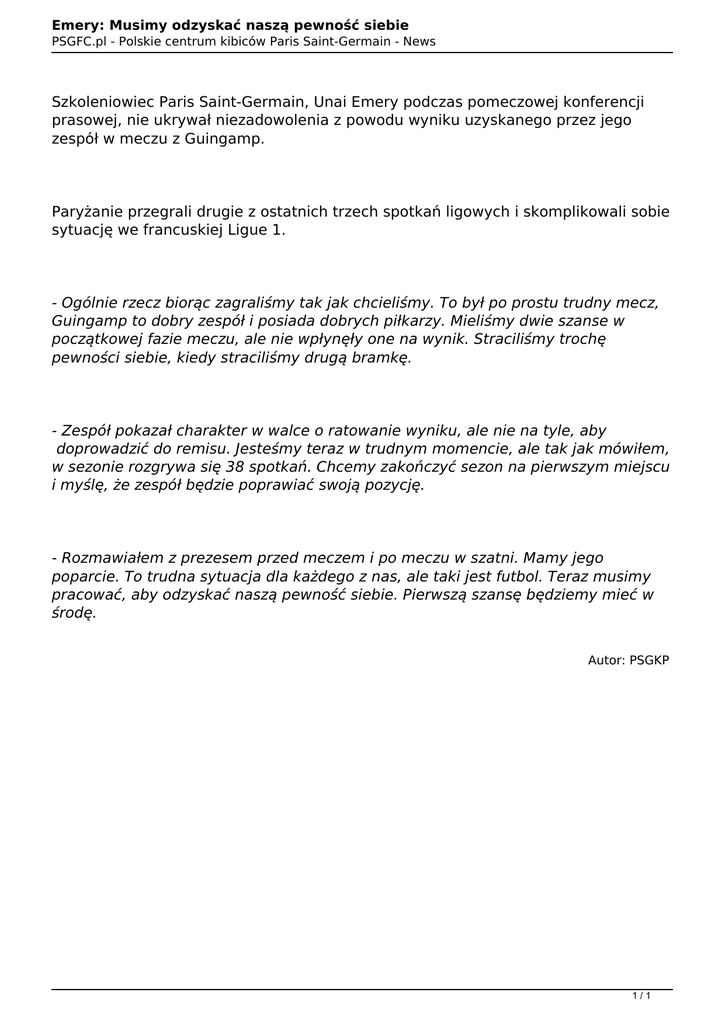 Emery: Musimy odzyskać naszą pewność siebie PSGFC.pl - Polskie centrum kibiców Paris Saint-Germain - News Szkoleniowiec Paris Saint-Germain, Unai Emery podczas pomeczowej konferencji prasowej, nie ukrywał niezadowolenia z powodu wyniku uzyskanego przez jego zespół w meczu z Guingamp. Paryżanie przegrali drugie z ostatnich trzech spotkań ligowych i skomplikowali sobie sytuację we francuskiej Ligue 1. - Ogólnie rzecz biorąc zagraliśmy tak jak chcieliśmy. To był po prostu trudny mecz, Guingamp to dobry zespół i posiada dobrych piłkarzy. Mieliśmy dwie szanse w początkowej fazie meczu, ale nie wpłynęły one na wynik. Straciliśmy trochę pewności siebie, kiedy straciliśmy drugą bramkę. - Zespół pokazał charakter w walce o ratowanie wyniku, ale nie na tyle, aby doprowadzić do remisu. Jesteśmy teraz w trudnym momencie, ale tak jak mówiłem, w sezonie rozgrywa się 38 spotkań. Chcemy zakończyć sezon na pierwszym miejscu i myślę, że zespół będzie poprawiać swoją pozycję. - Rozmawiałem z prezesem przed meczem i po meczu w szatni. Mamy jego poparcie. To trudna sytuacja dla każdego z nas, ale taki jest futbol. Teraz musimy pracować, aby odzyskać naszą pewność siebie. Pierwszą szansę będziemy mieć w środę. Autor: PSGKP 1/1 Powered by TCPDF (www.tcpdf.org)